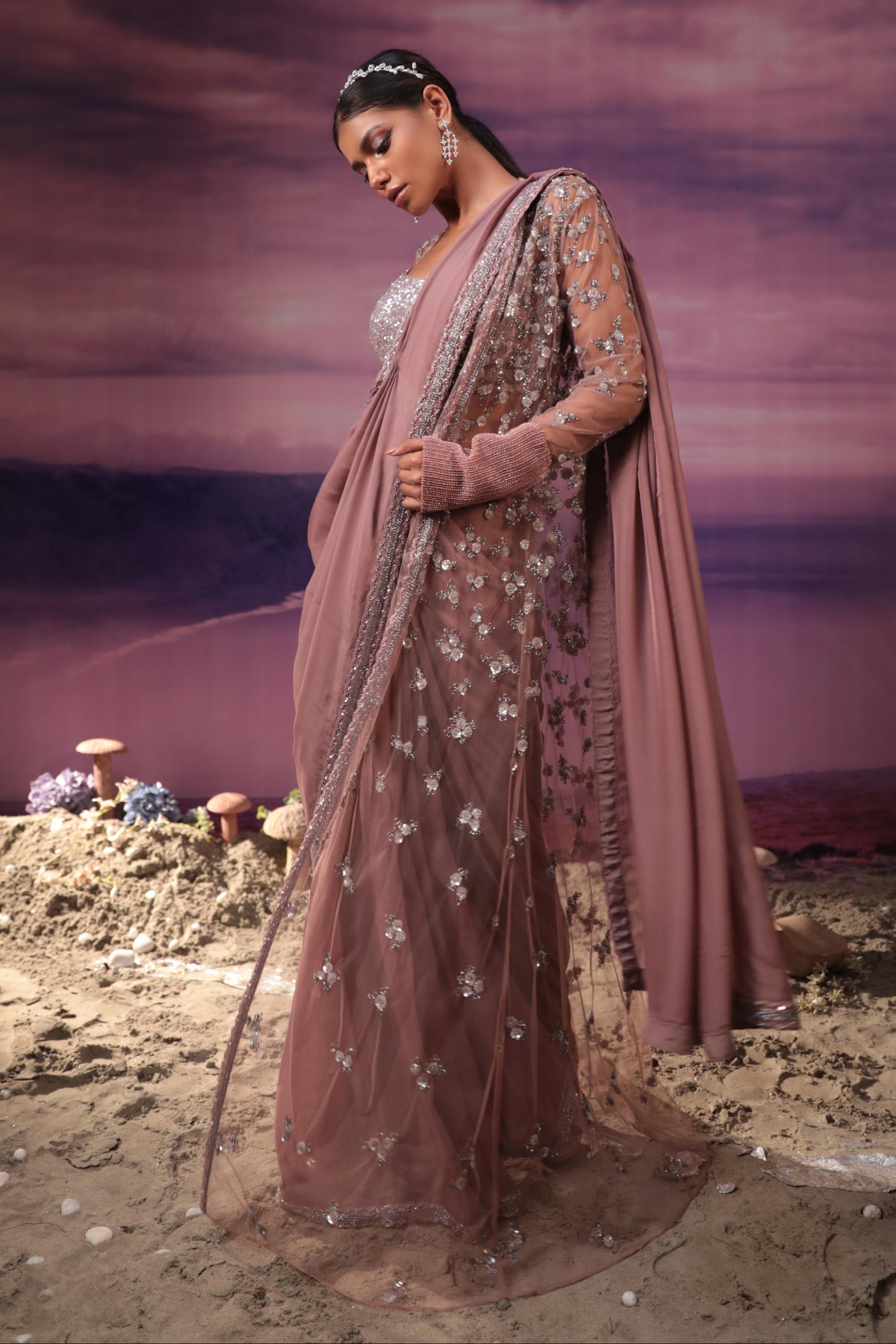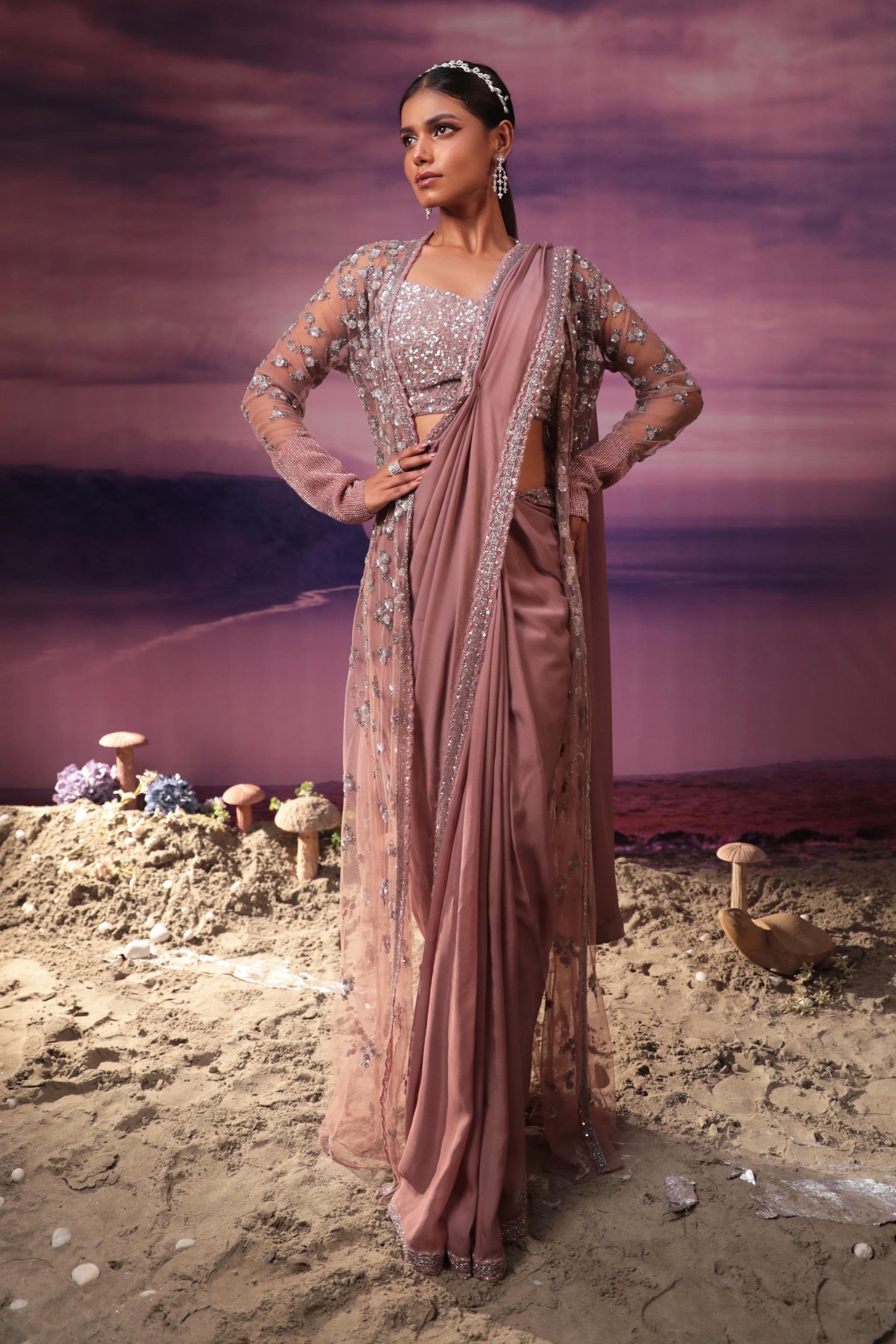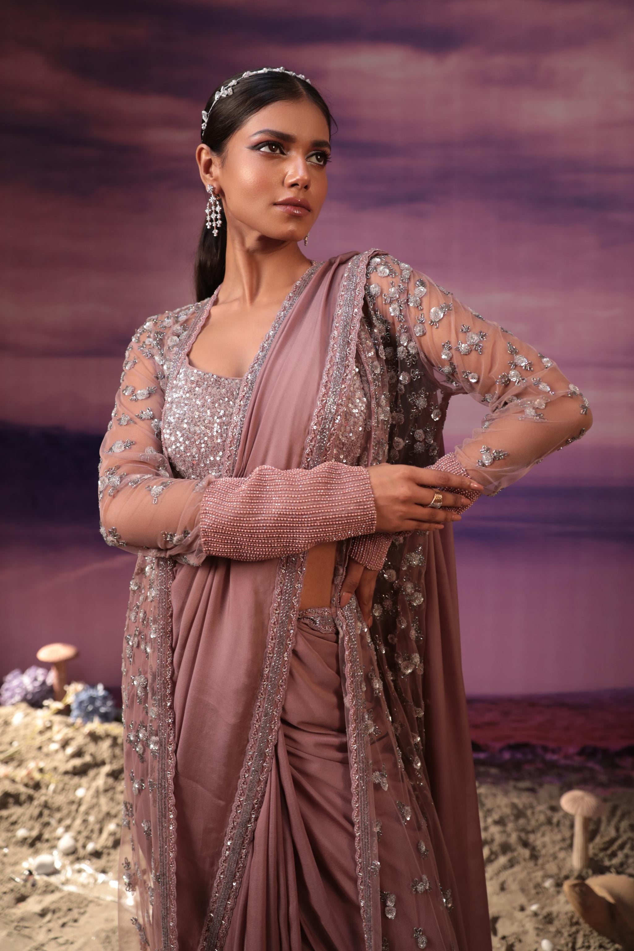 Elevate your elegance with this exquisite ensemble featuring a jacket adorned with floral booties and pearl detailing on the cuffs. The sequins sheathing on the blouse adds a touch of sparkle, while the scalloped-bordered saree completes the look with grace and sophistication. Perfect for weddings or special celebrations.
