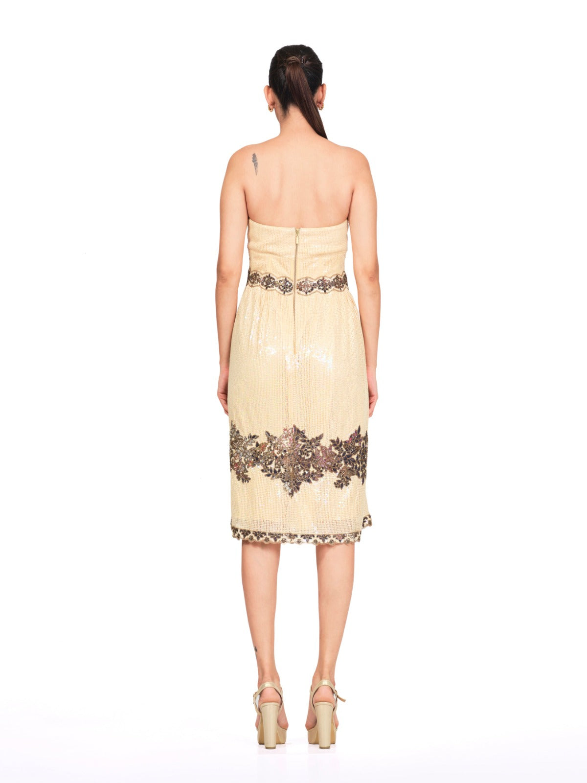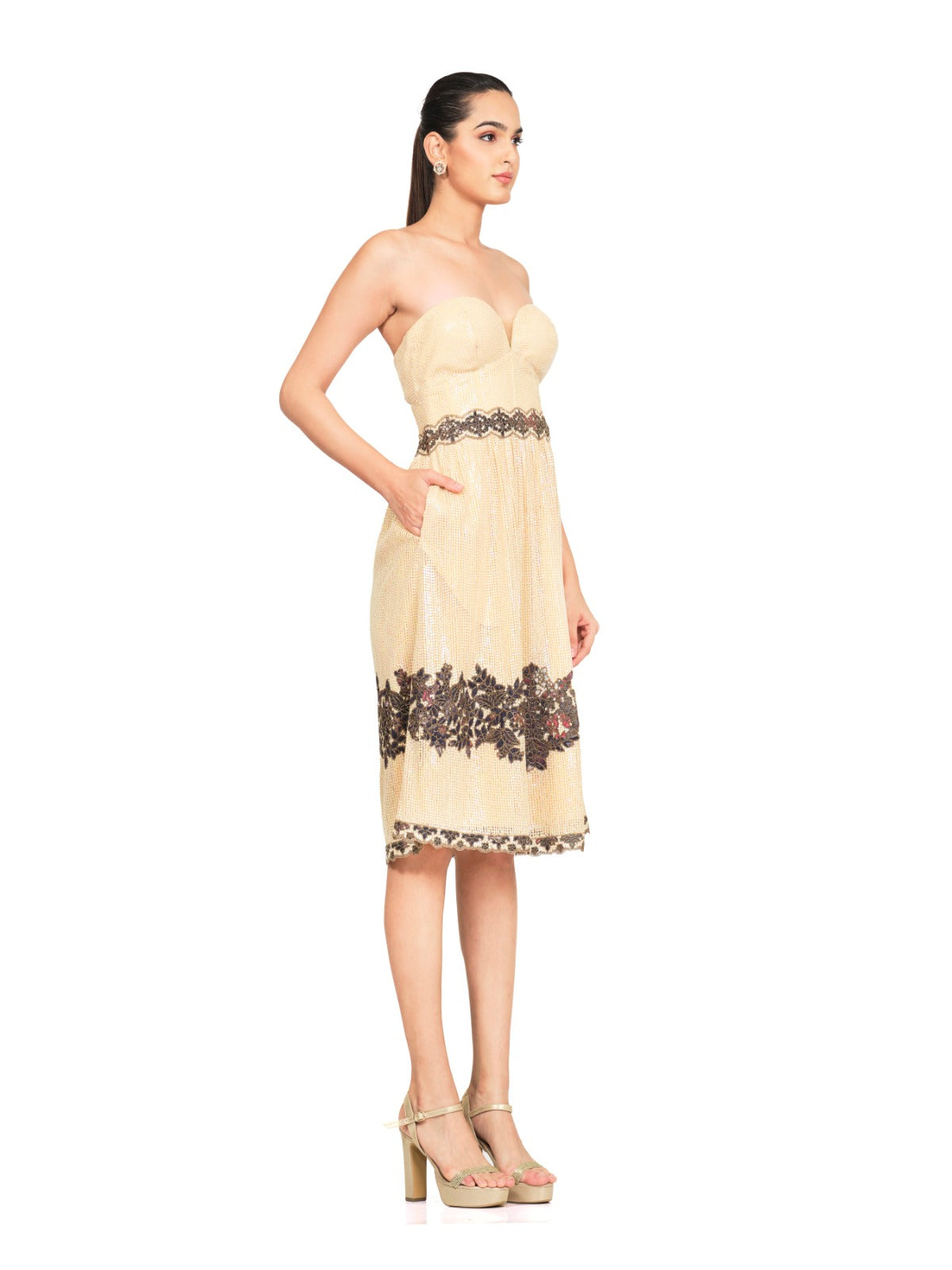 This elegant beige dress designed in a knee-length silhouette features a flattering sweetheart neckline and built-in cups for a seamless fit. Adorned with exquisite antique placement embroidery it combines timeless sophistication with refined detailing. Perfect for any special event this dress offers both comfort and classic style in a beautifully crafted design.