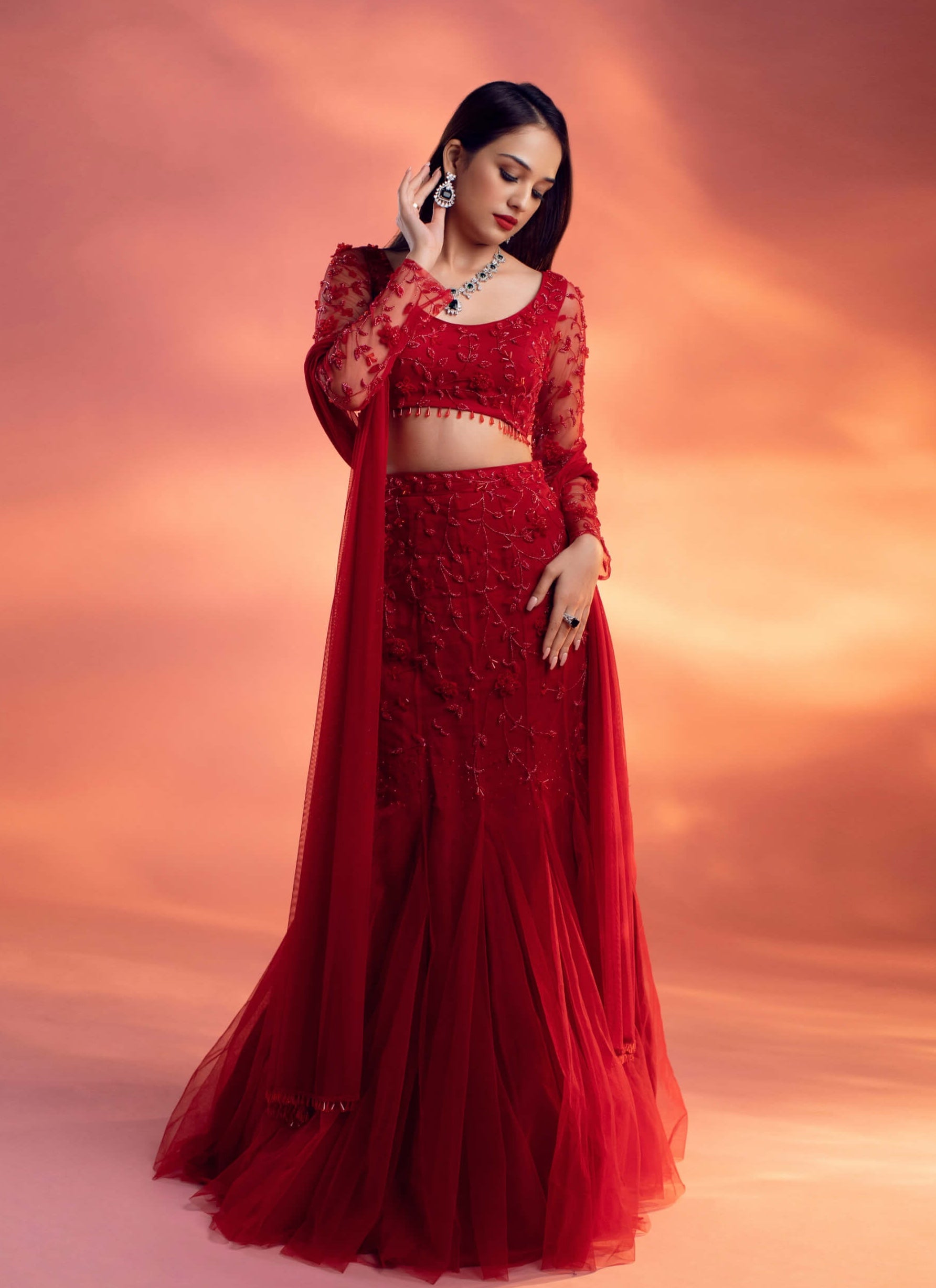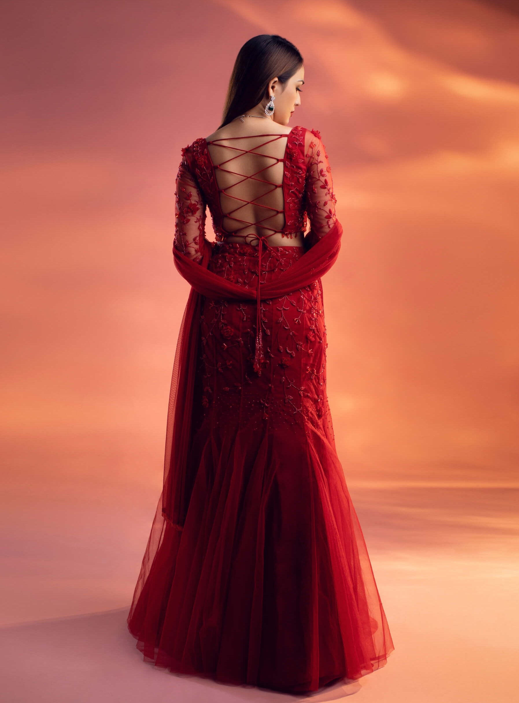 Unveil a stunning blend of elegance and artistry with our red fishtail lehenga set. This striking ensemble features intricate floral motifs embroidered with delicate net fabric shimmering glass beads and lustrous round crystal beads. The fishtail silhouette of the lehenga adds a dramatic flair while the detailed embroidery enhances its opulent charm. Perfect for making a grand entrance at any special event this set seamlessly merges traditional beauty with contemporary sophistication ensuring you make a memorable impression.