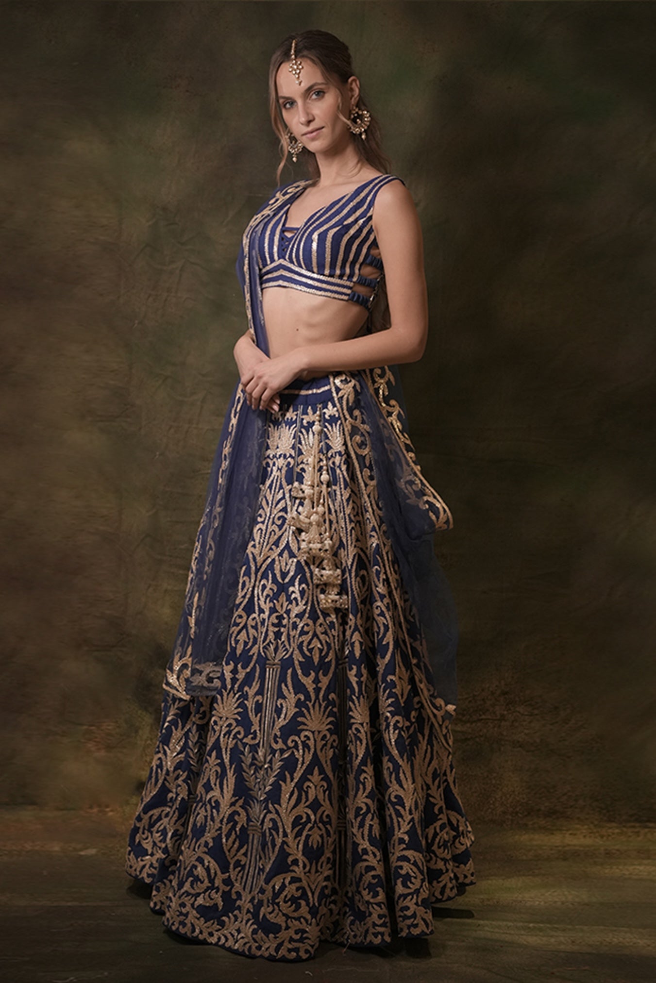 Immerse yourself in the striking elegance of this lehenga, where bold electric blue hues are paired with exquisite hand-done gota work by specialized artisans. The lehenga features intricate embroidery that highlights its rich craftsmanship. It is complemented by a contemporary v-neck blouse, adding a modern flair, and finished with an embroidered border dupatta that enhances the ensemble’s sophistication. Perfect for making a memorable impression, this lehenga seamlessly blends traditional artistry with contemporary design.
