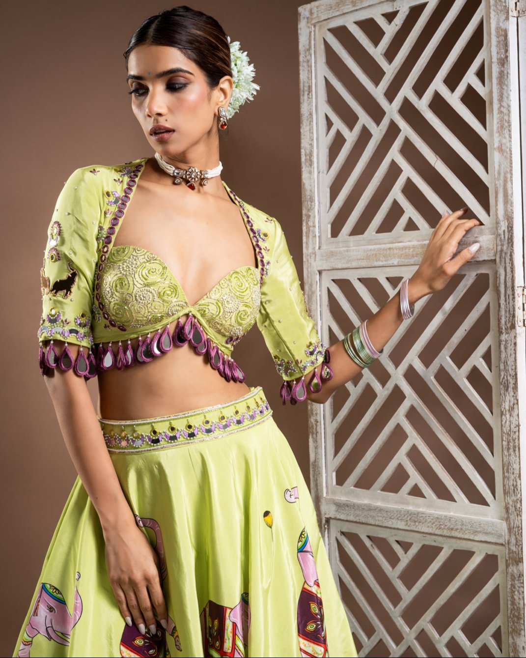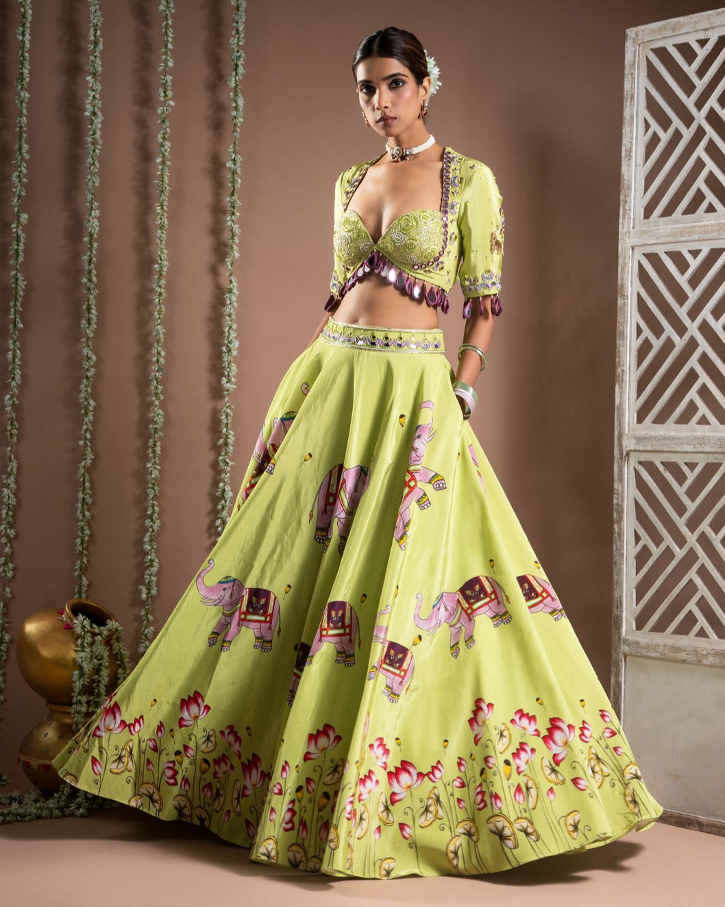Make a bold statement with the Elephant Print Green Heavy Lehenga Set, an exquisite blend of traditional Indian design and contemporary artistry. Crafted from luxurious, heavy fabric in a vibrant green shade, this lehenga set features intricate elephant prints, adding a unique and artistic touch to a classic silhouette. Perfect for weddings, cultural celebrations, or festive occasions, this lehenga set is a true celebration of heritage and modern style.