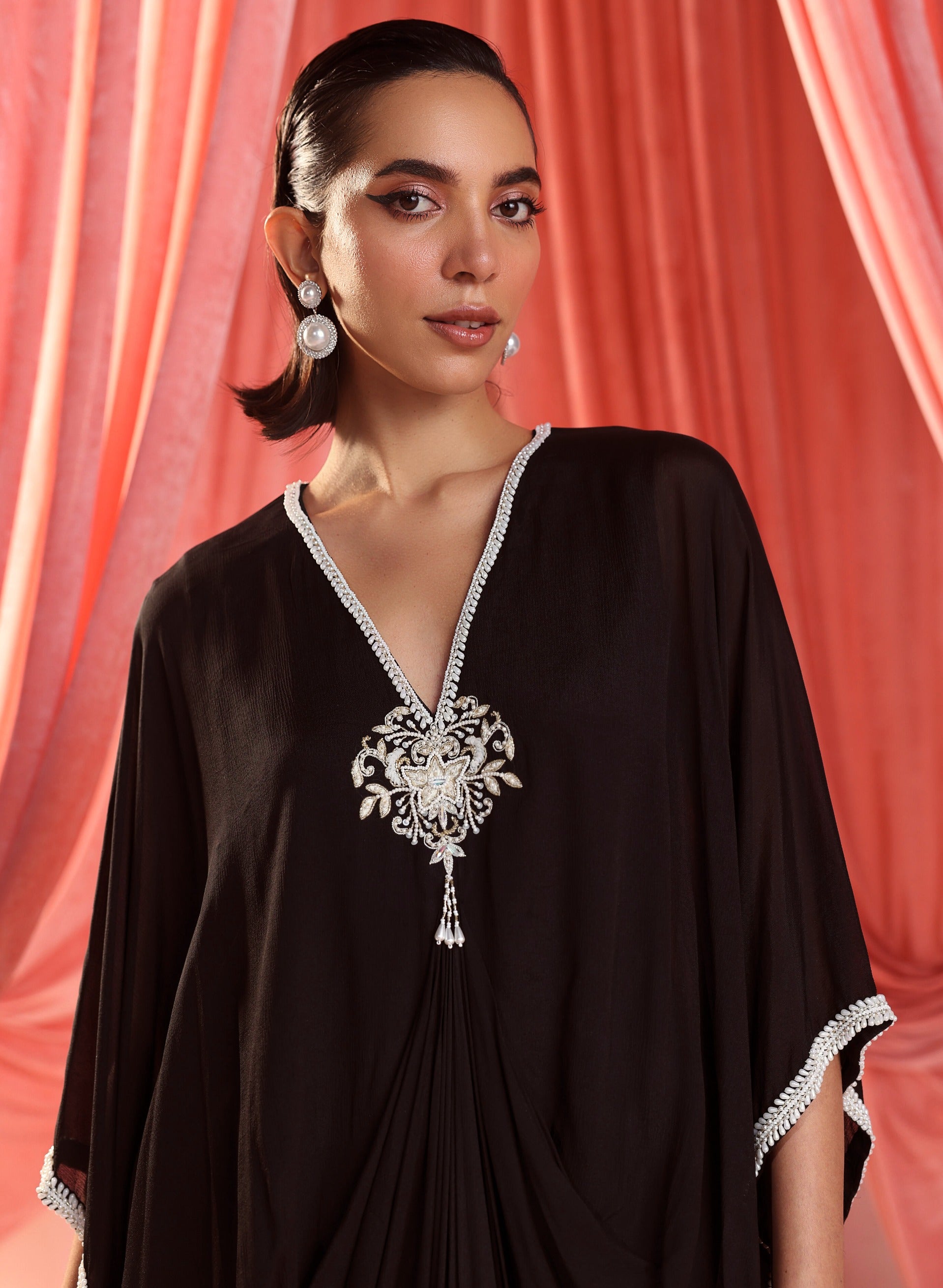 embellishments on the neckline and sleeves. This luxurious kaftan features a flowing, graceful silhouette that enhances any figure, while the carefully crafted embellishments add a touch of opulent charm. Ideal for special occasions or high-profile events, this kaftan combines classic design with contemporary flair. Made from premium fabrics, it offers both style and comfort, ensuring you look and feel your best. Elevate your wardrobe with this statement piece and embrace a new level of elegance and refinement.