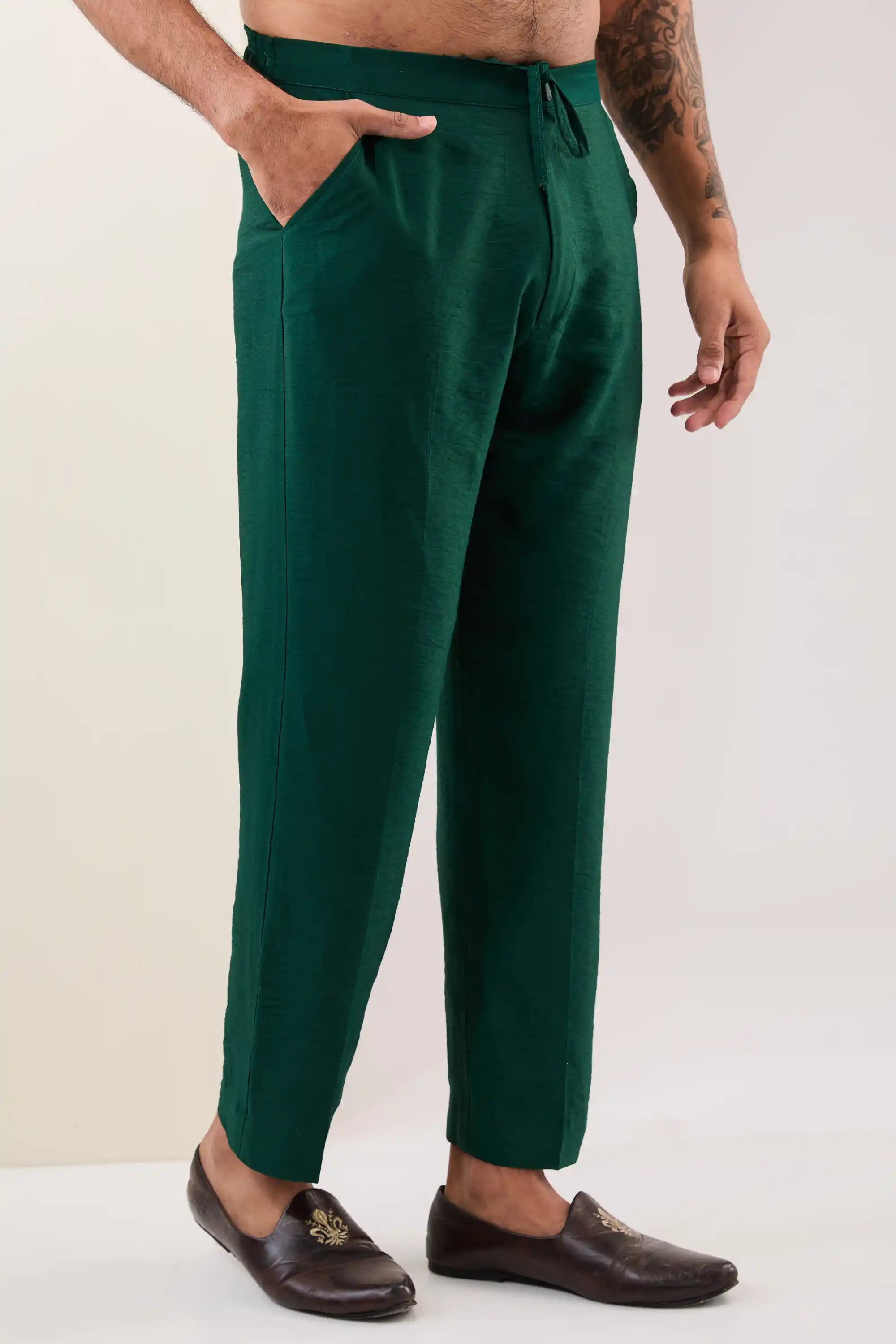 Make a vibrant statement with this emerald green unlined kurta, featuring exquisite silver zari booti and sequins, complemented by cheerful yellow bandhani detailing on the collar, cuffs, and placket. Paired with matching cotton silk pants, this ensemble beautifully blends tradition and modern style, perfect for festive occasions or special celebrations.