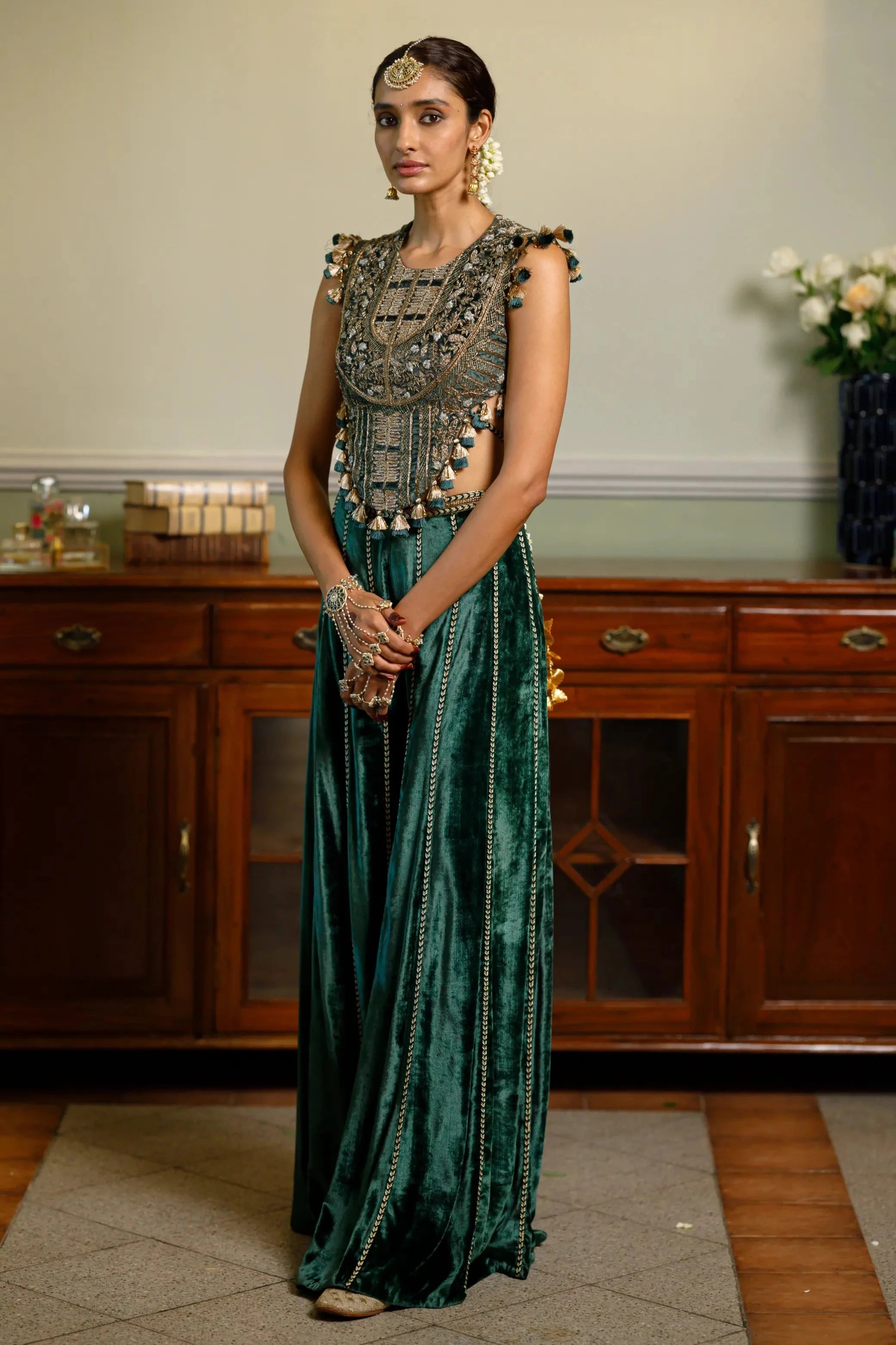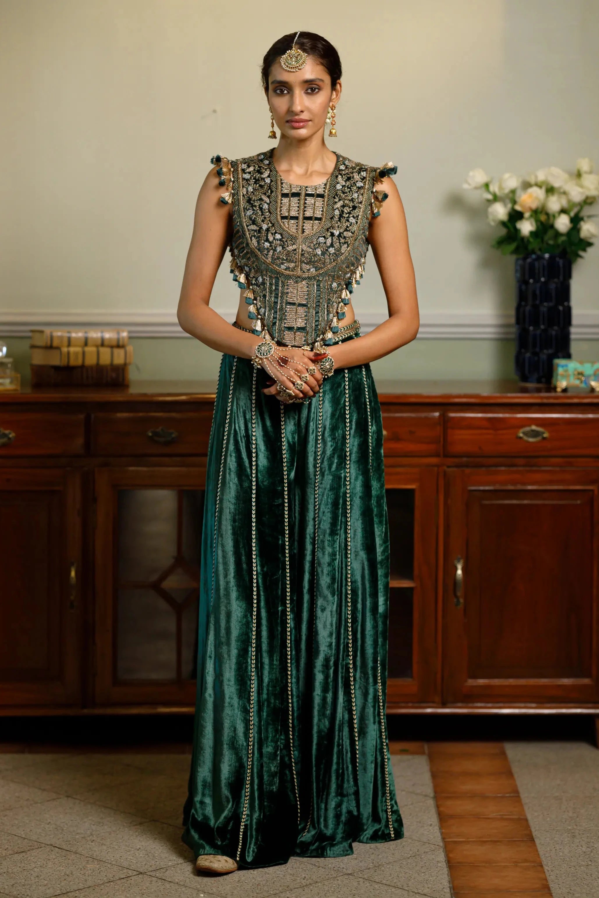 The Benazir Emerald Green Embroidered Back Tie-Up Choli paired with a stylish sharara pant creates a stunning and contemporary look. The intricate embroidery on the choli adds sophistication, while the back tie-up design offers a flattering fit. The sharara pant adds volume and elegance, making this set perfect for weddings, festivals, or special occasions. A perfect blend of tradition and modern style for any celebration.