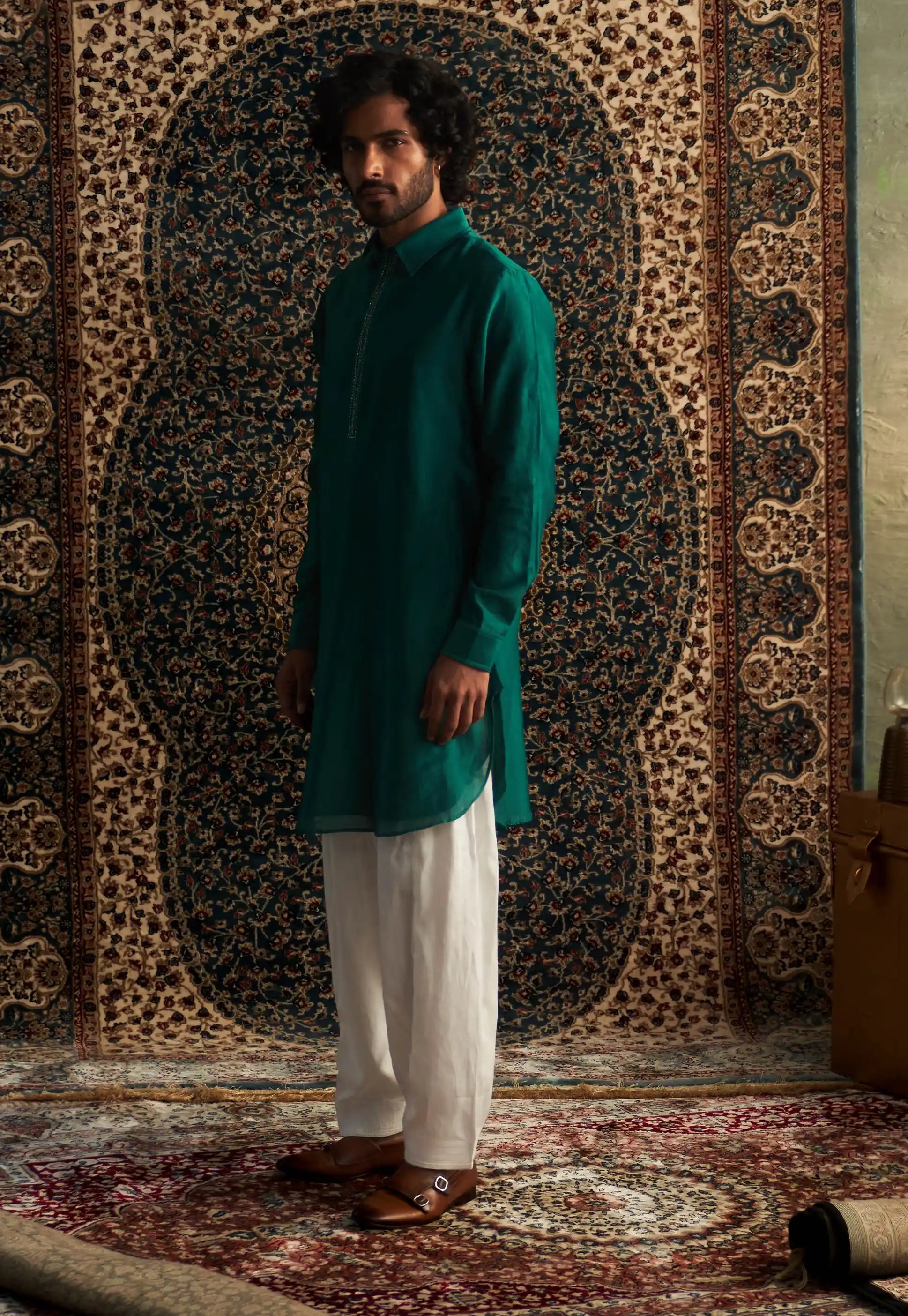 Elevate your style with our versatile emerald green Pathani kurta set, featuring subtle embroidery on the placket that adds a refined touch. Paired with a classic white salwar, this outfit is perfect for mehendi, festive occasions, or casual gatherings. Effortlessly stylish and comfortable, it’s a must-have addition to your wardrobe that ensures you stand out with elegance at every event. Embrace tradition with a contemporary flair!