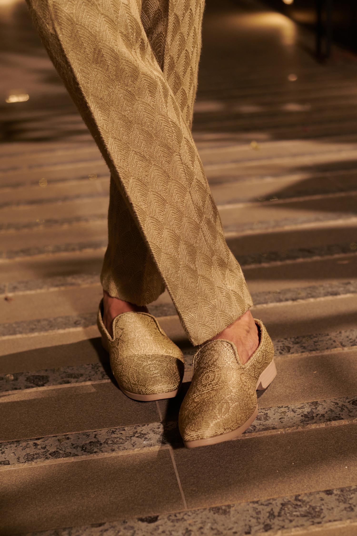 This endive green jacket set blends modern sophistication with artisanal hand-thread work. The open-front silhouette sleek standing collar and tapered pants create a sharp and stylish look perfect for formal gatherings.