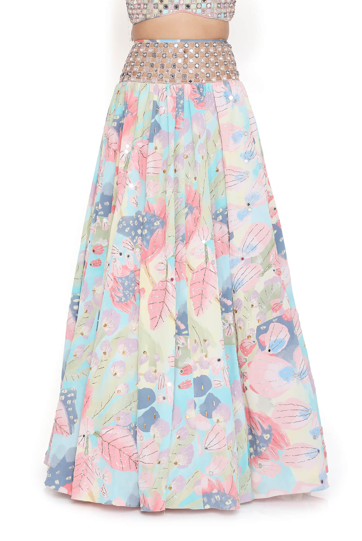 Immerse yourself in elegance with the Euphoria Print Crepe Lehenga. This enchanting set features a stunning crepe fabric adorned with intricate embroidery, creating a captivating visual impact. The lehenga showcases a beautifully embroidered tie-up back that adds a touch of sophistication and a perfect fit. Complemented by a mirror work belt, this ensemble offers a dazzling blend of traditional craftsmanship and contemporary flair. Ideal for festive occasions and special events, it ensures you radiate grace and style.