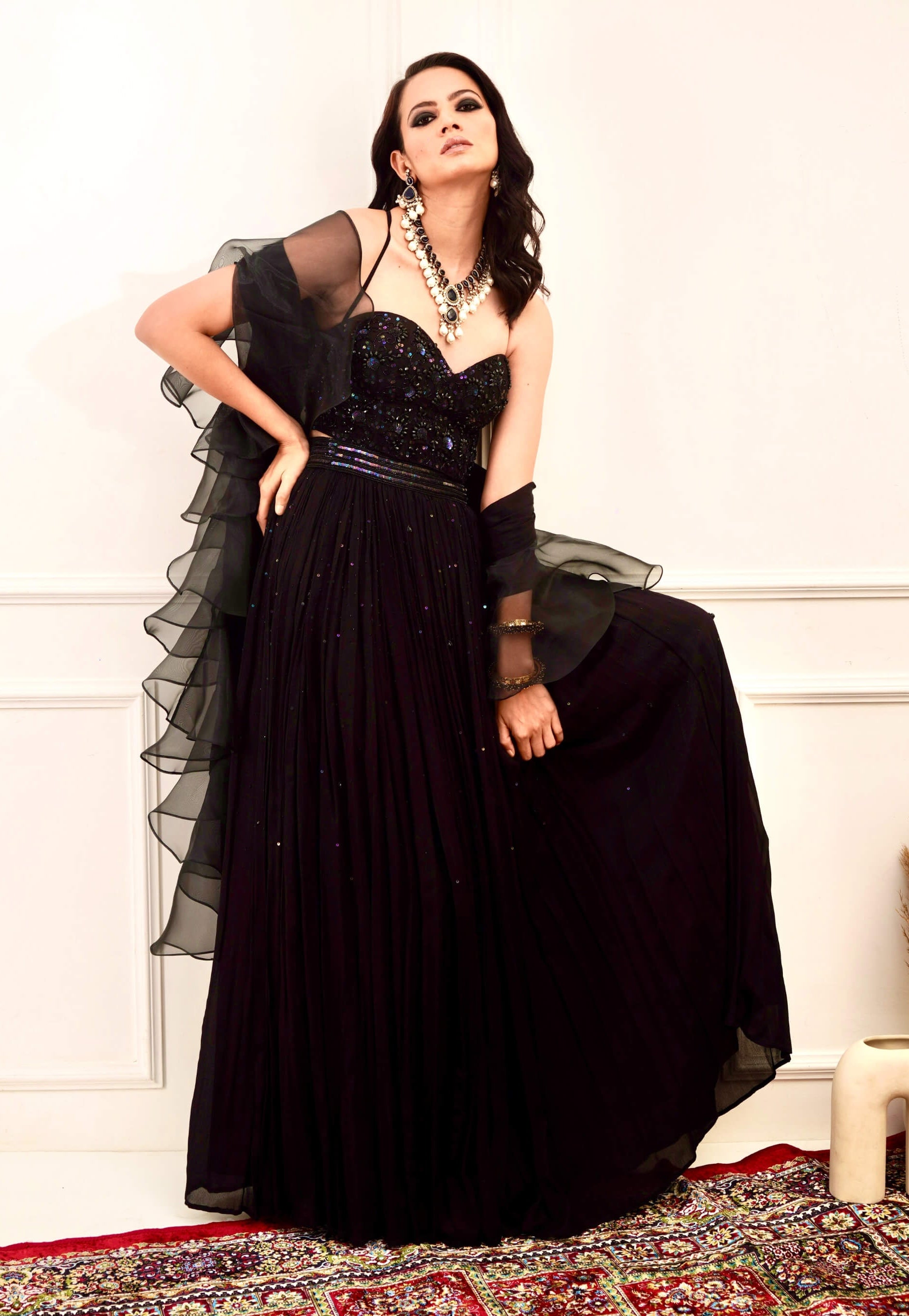 Elegance meets contemporary allure in this striking ensemble featuring a black corset blouse with delicate straps, perfectly paired with a flowing black chiffon pleated lehenga. The ensemble is adorned with intricate details, showcasing a harmonious blend of traditional craftsmanship and modern design. Complete with a ruffled dupatta that adds a touch of sophistication, this outfit exudes grace and charm, making it an ideal choice for special occasions and celebrations.