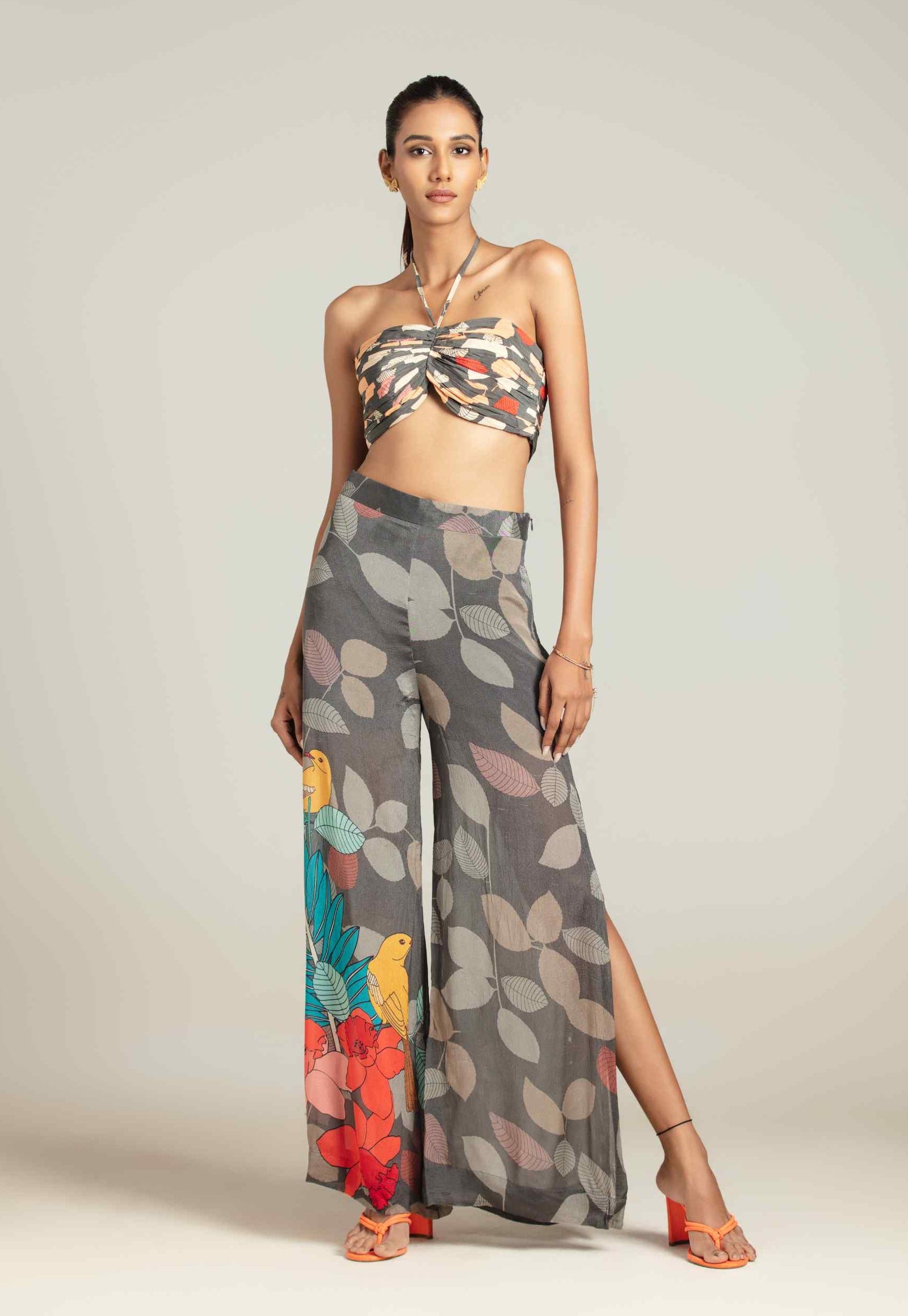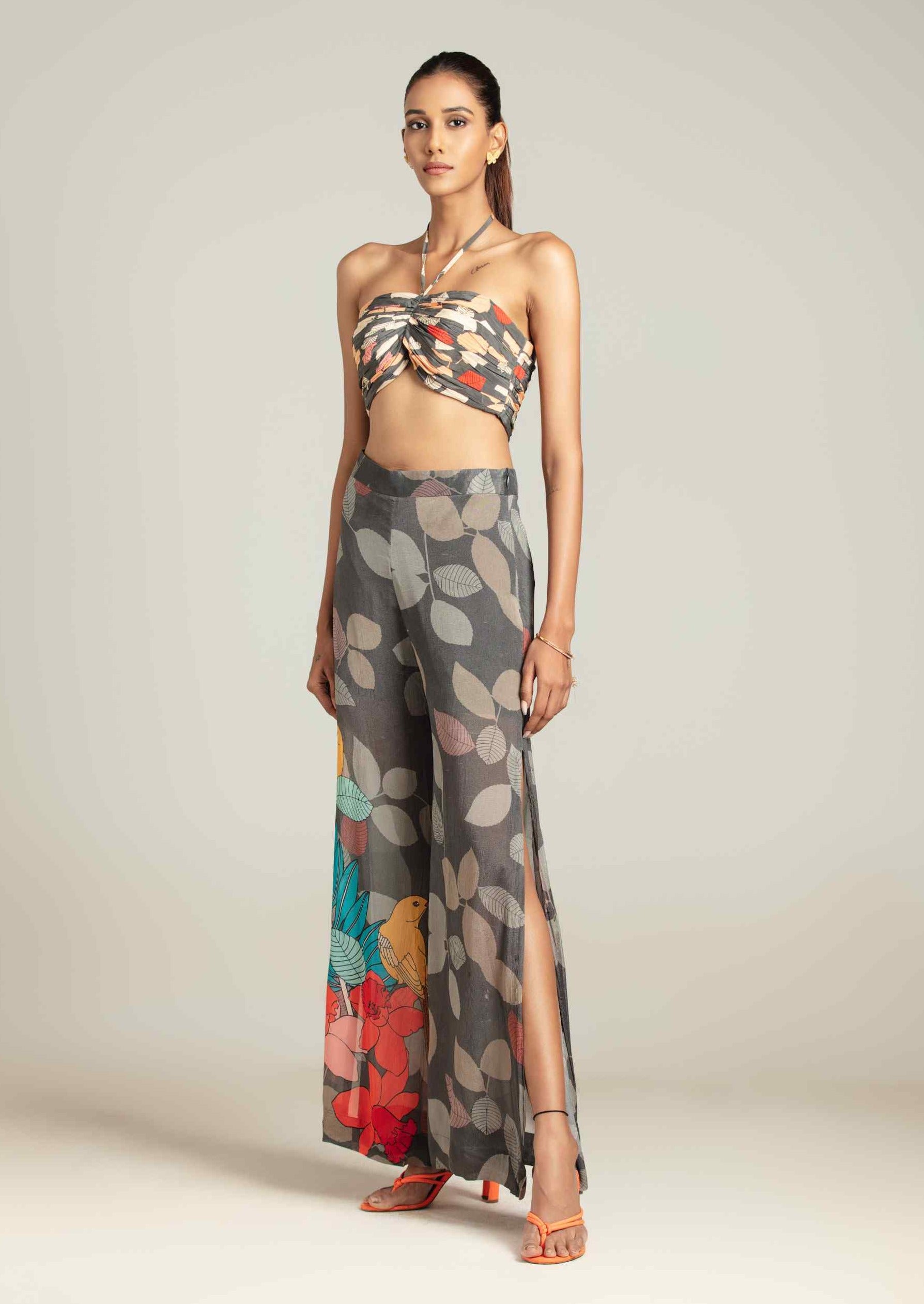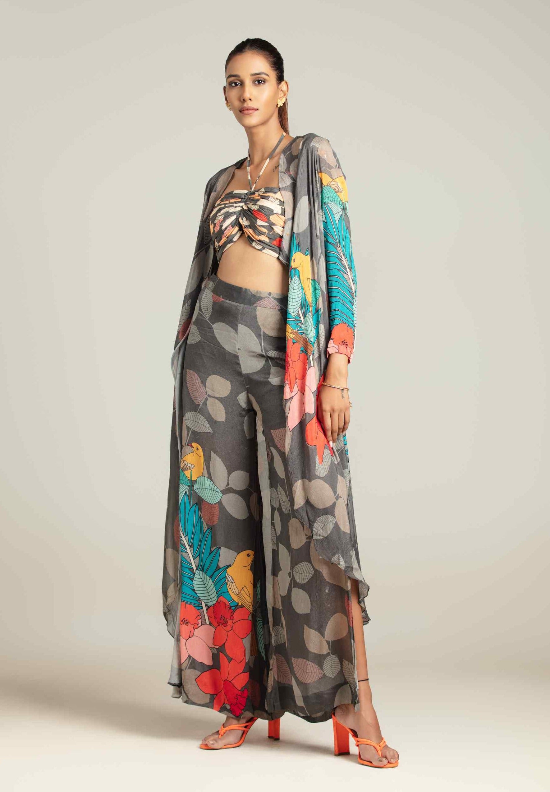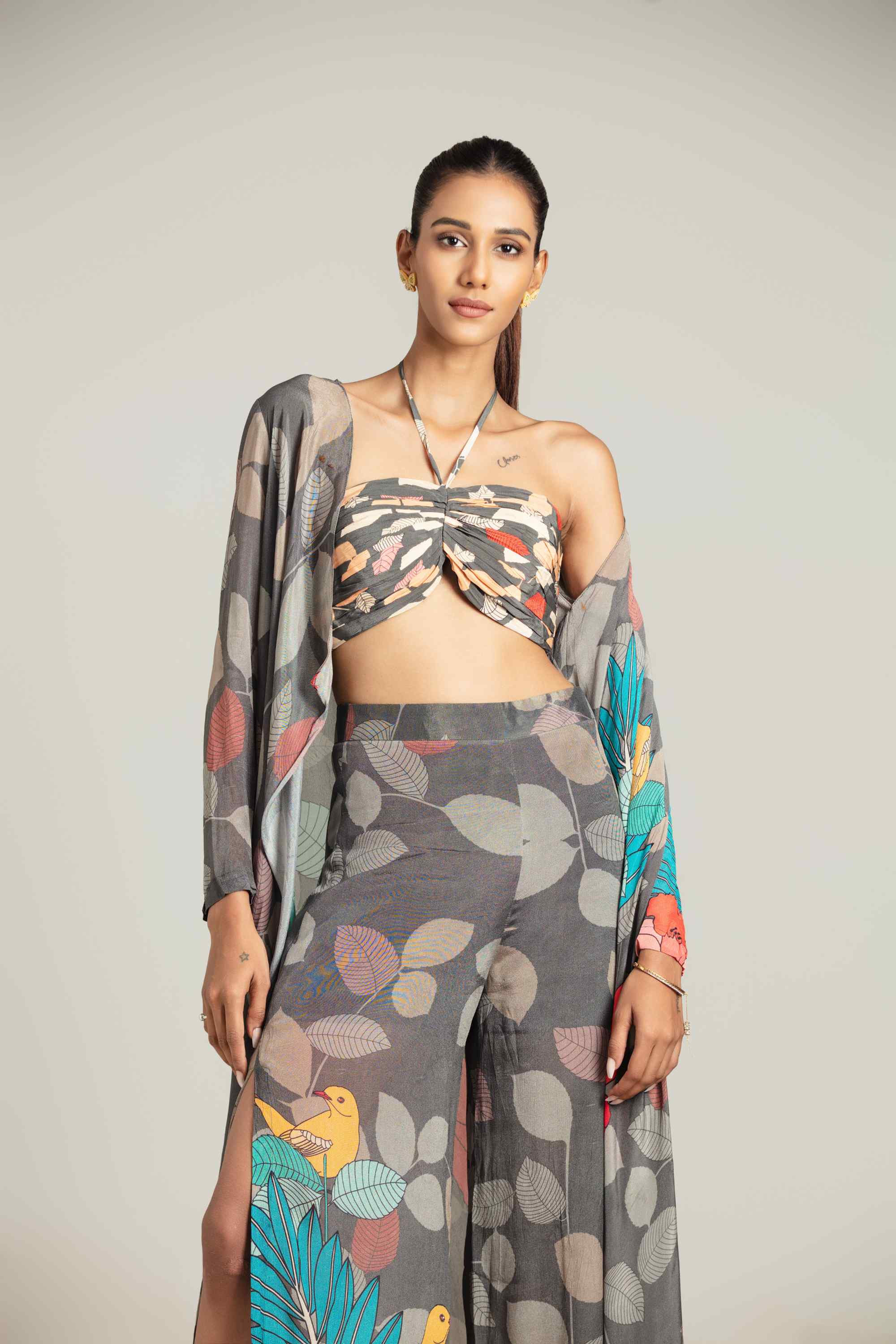 Multicolor exotica cape with bustier and high slit pants