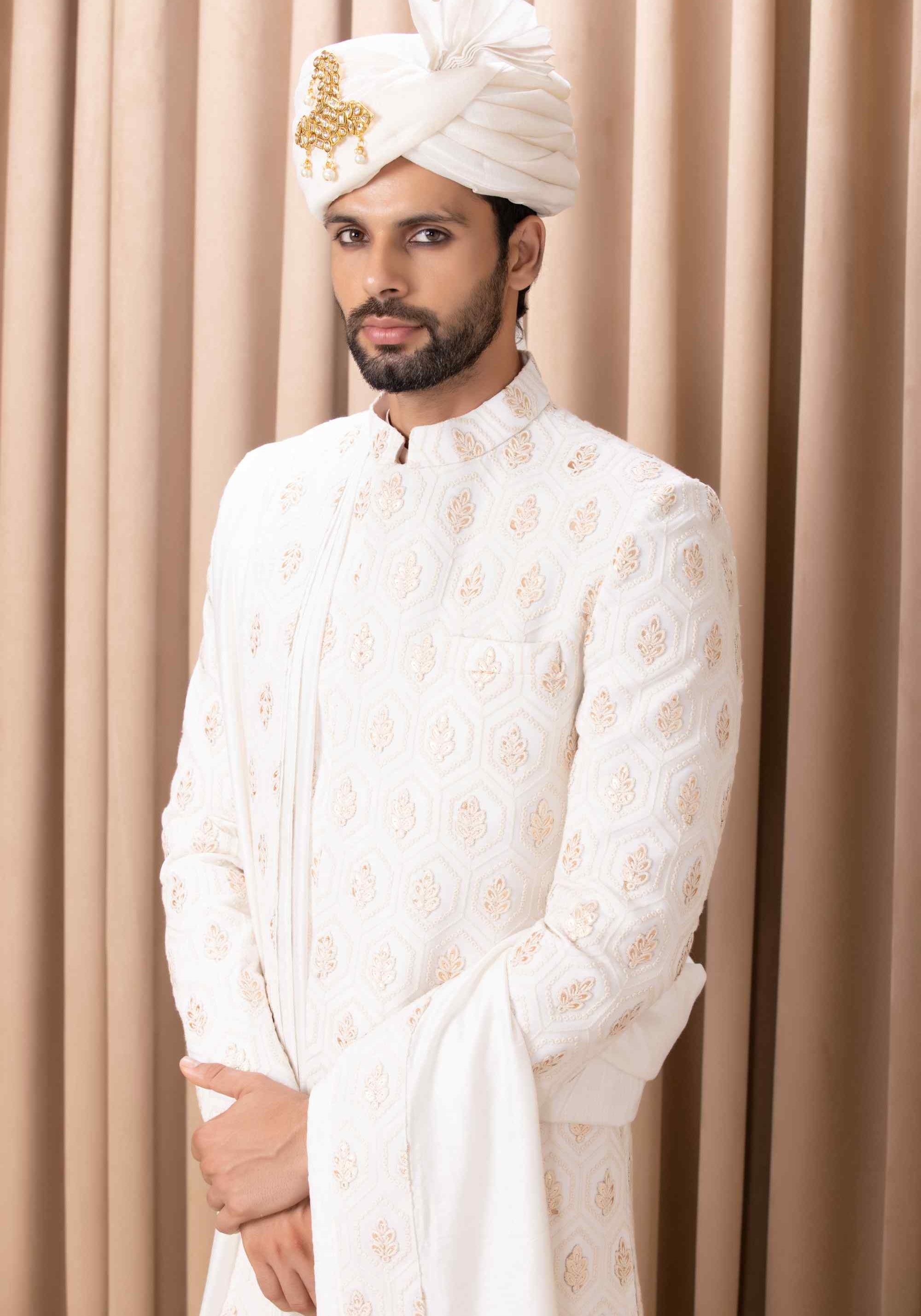 Step into refined elegance with our traditional machine-embroidered ivory sherwani. Adorned with intricate detailing, this sophisticated piece seamlessly merges classic craftsmanship with modern sophistication, making it perfect for a classy wedding. The ensemble includes a matching ivory cotton silk kurta, an exquisitely embroidered stole, and an ivory churidaar, ensuring a cohesive and polished appearance. Designed for the groom who values both tradition and contemporary style, this outfit promises to create a lasting impression on your special day.