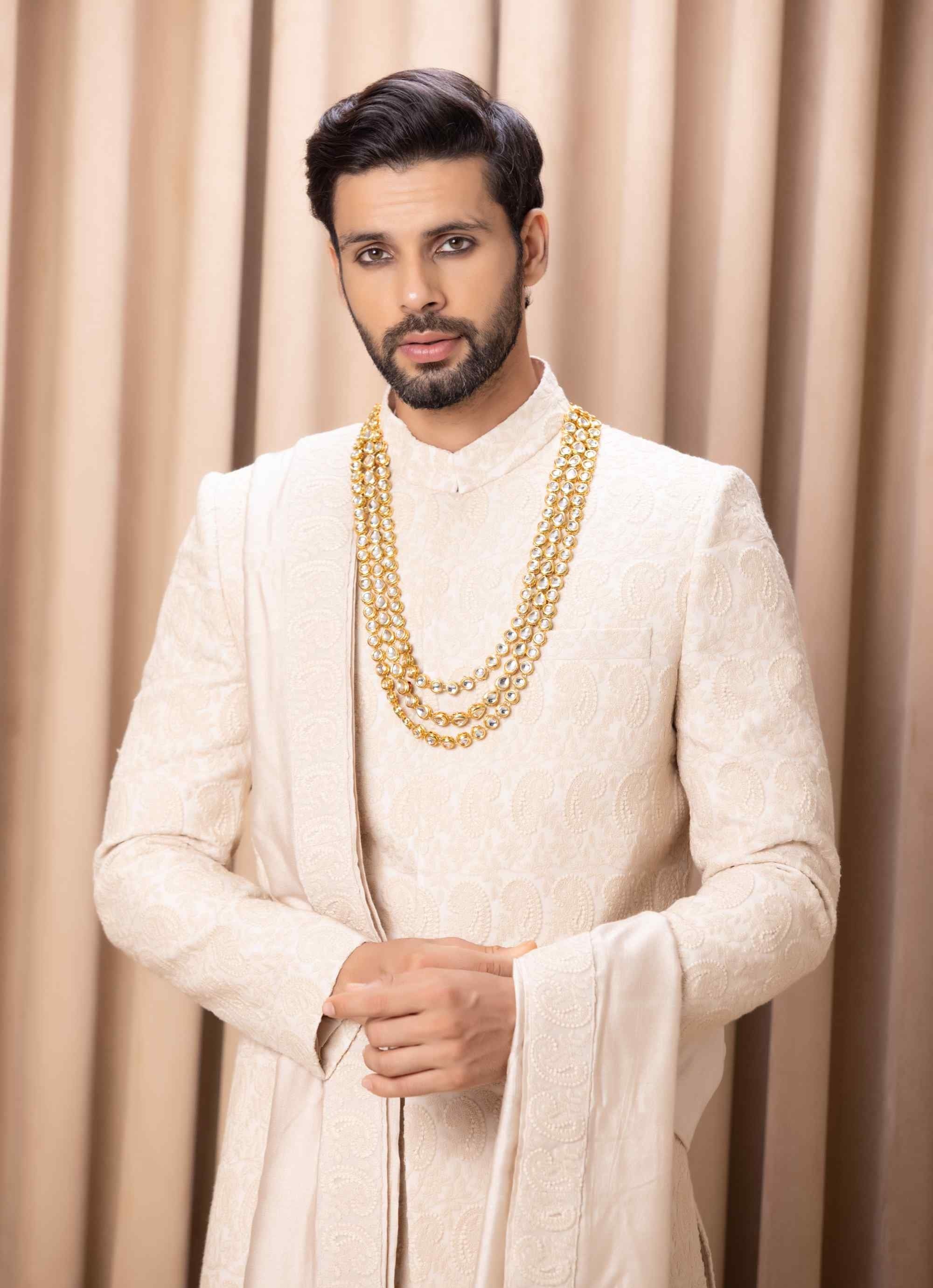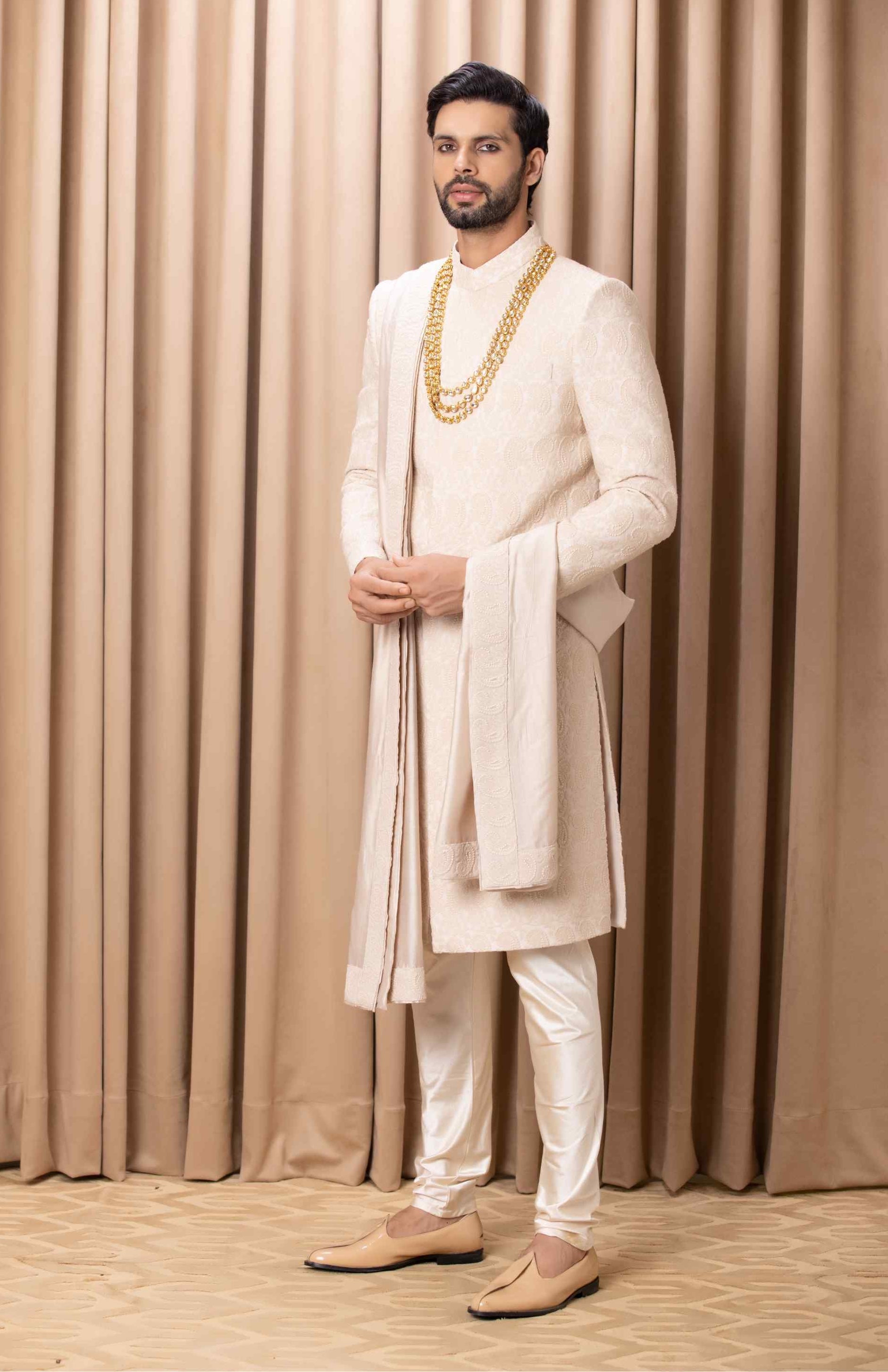 Embrace classic elegance with our traditional machine-embroidered sherwani in refined beige. This sophisticated ensemble features intricate detailing that combines timeless craftsmanship with modern design, making it perfect for a classy wedding. Accompanied by a matching beige cotton silk kurta, a beige embroidered stole, and a beige churidaar, this set offers a cohesive and polished appearance. Designed for the discerning groom who appreciates both tradition and contemporary style, this outfit ensures you make a memorable impression on your special day.