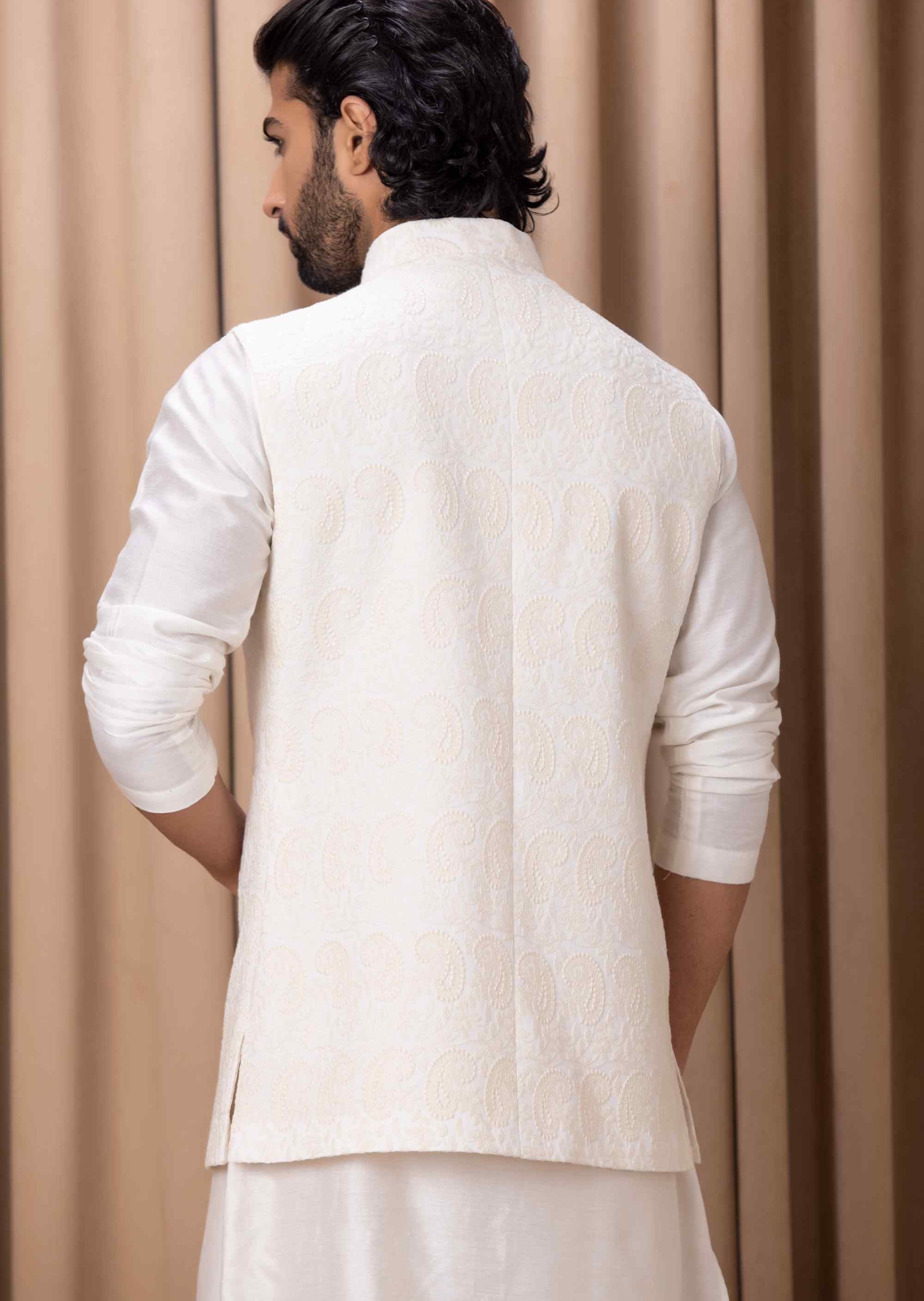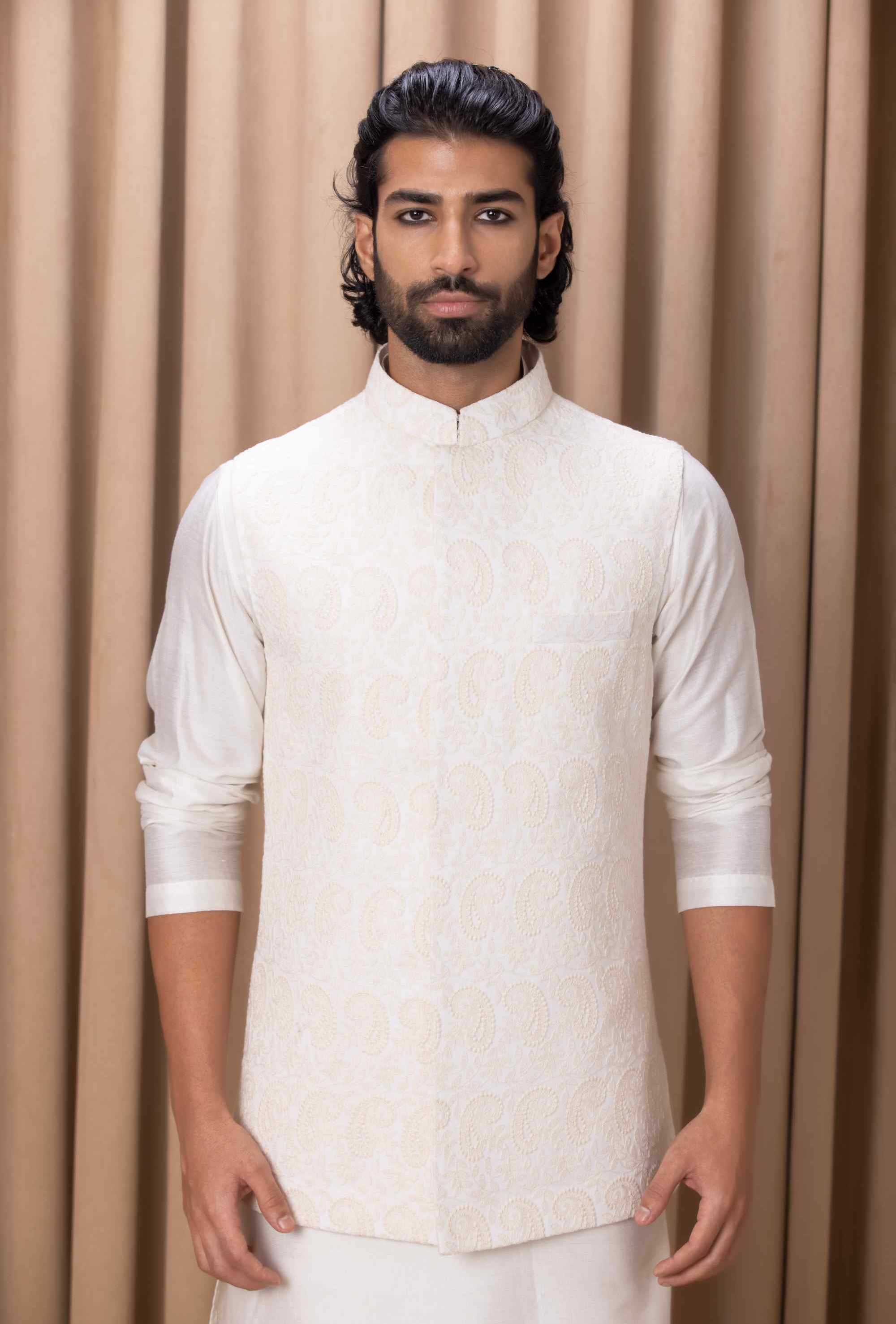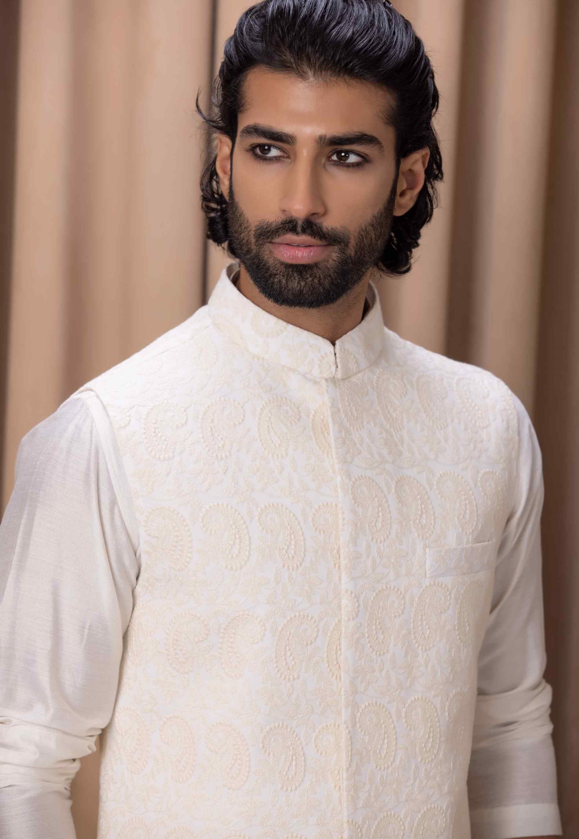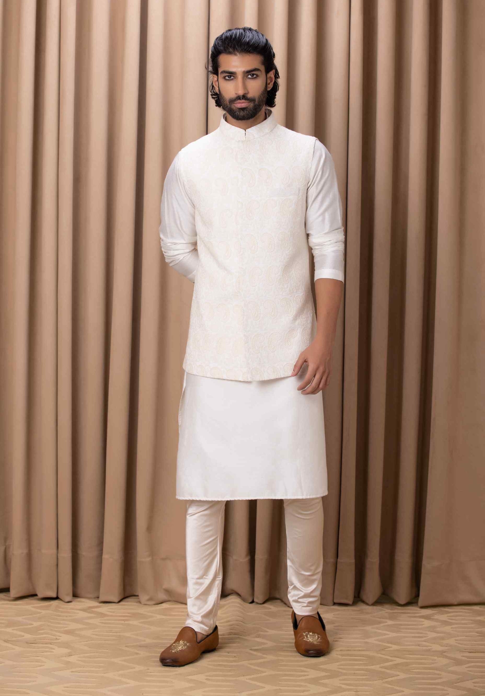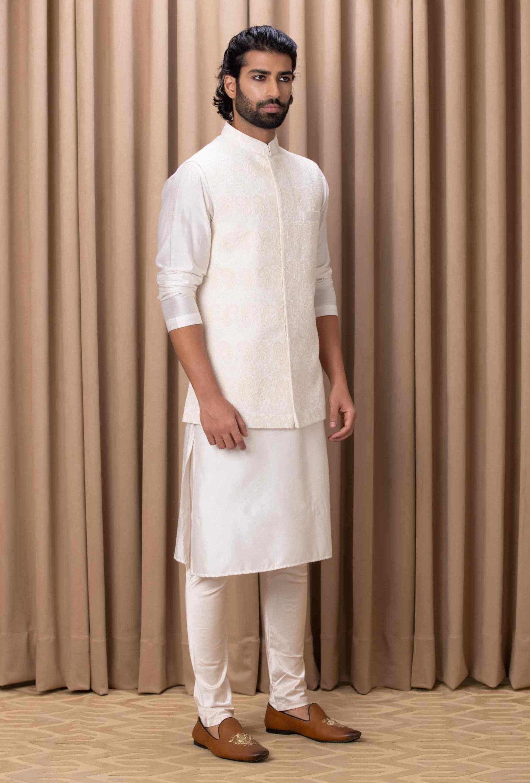 Discover timeless elegance with our traditional ivory nehru jacket, featuring delicate thread embroidery and understated minimal details. This sophisticated piece is ideal for outdoor occasions, offering a classic yet refined look. Paired with a classic ivory kurta and churidaar, the ensemble exudes a seamless and polished style. Perfect for the modern groom or groomsmen who appreciate subtle luxury and traditional craftsmanship, this outfit ensures a distinguished and memorable presence at any special event.