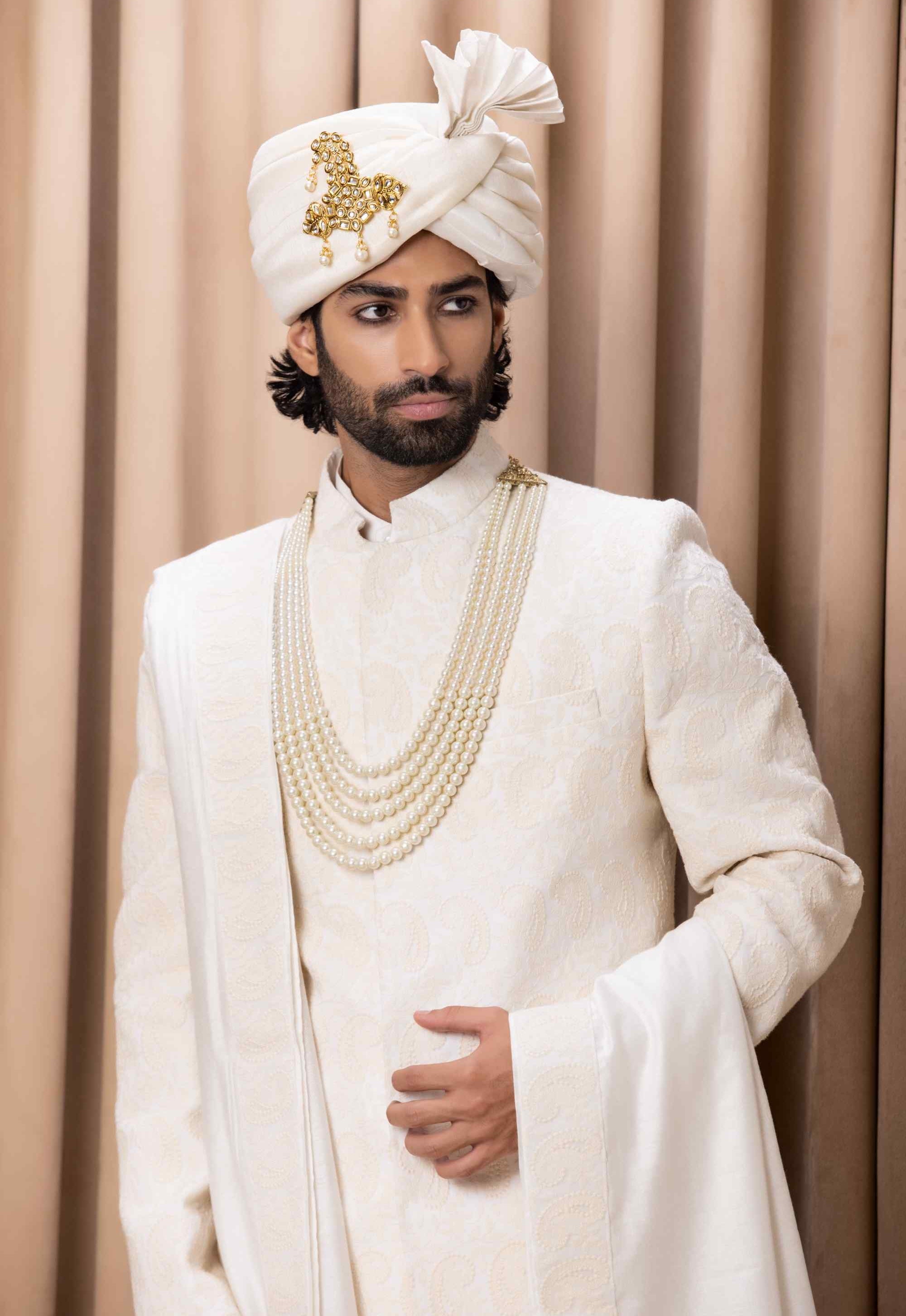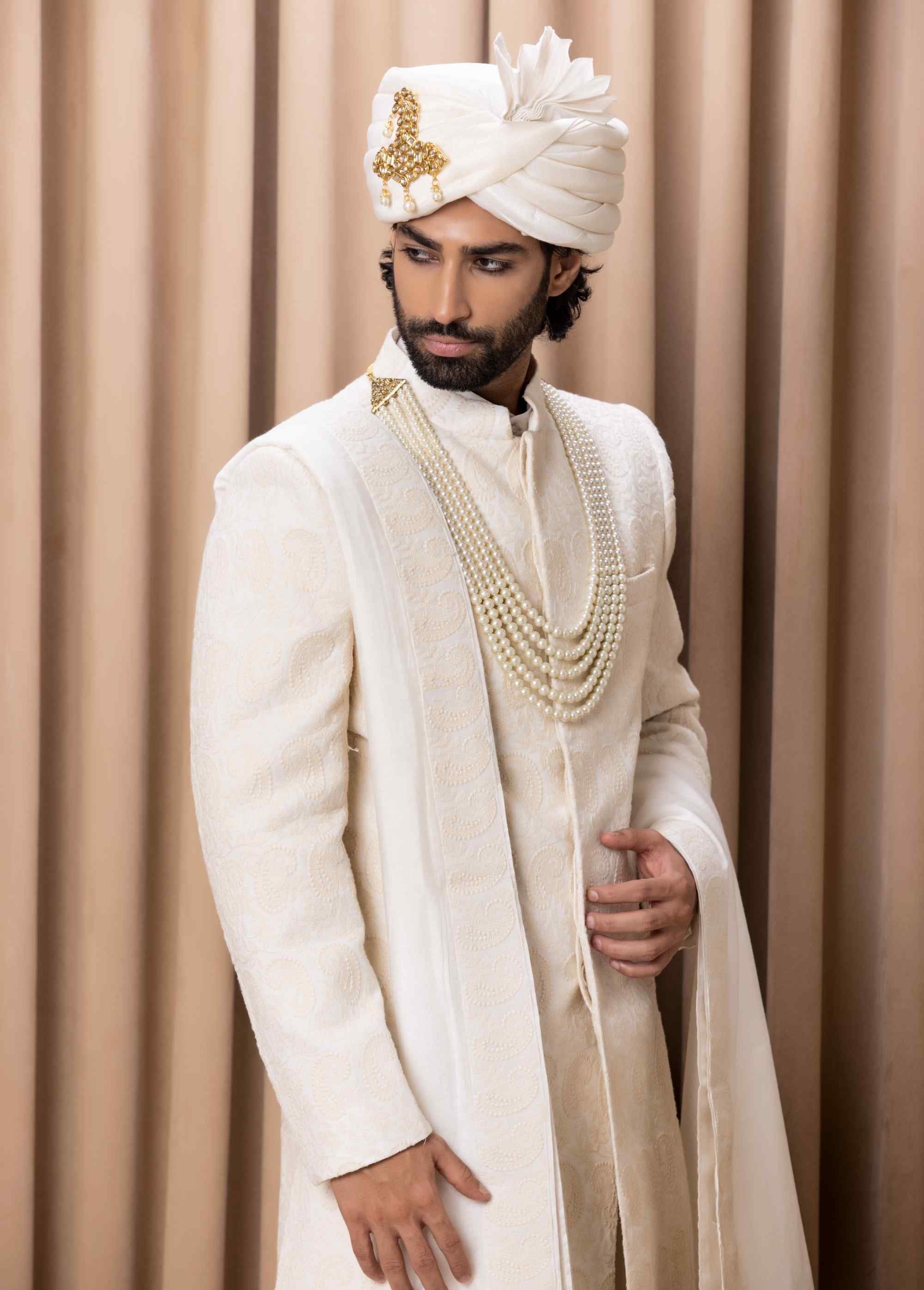 Experience refined elegance with our traditional machine-embroidered ivory sherwani. Adorned with intricate detailing, this exquisite piece blends timeless craftsmanship with contemporary sophistication, making it the perfect choice for a classy wedding. The ensemble includes a matching ivory cotton silk kurta, an ivory embroidered stole, and an ivory churidaar, ensuring a seamless and polished look. Designed for the discerning groom who values both tradition and modern style, this outfit promises to make a lasting impression on your special day.