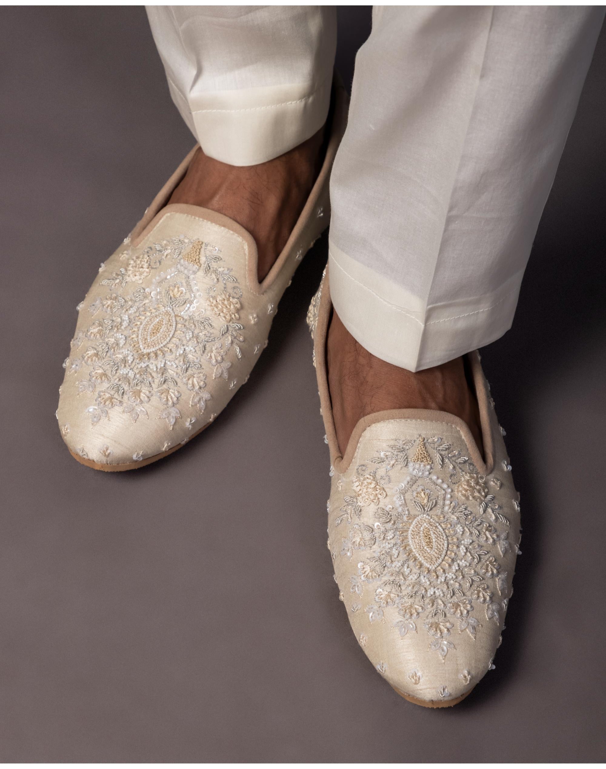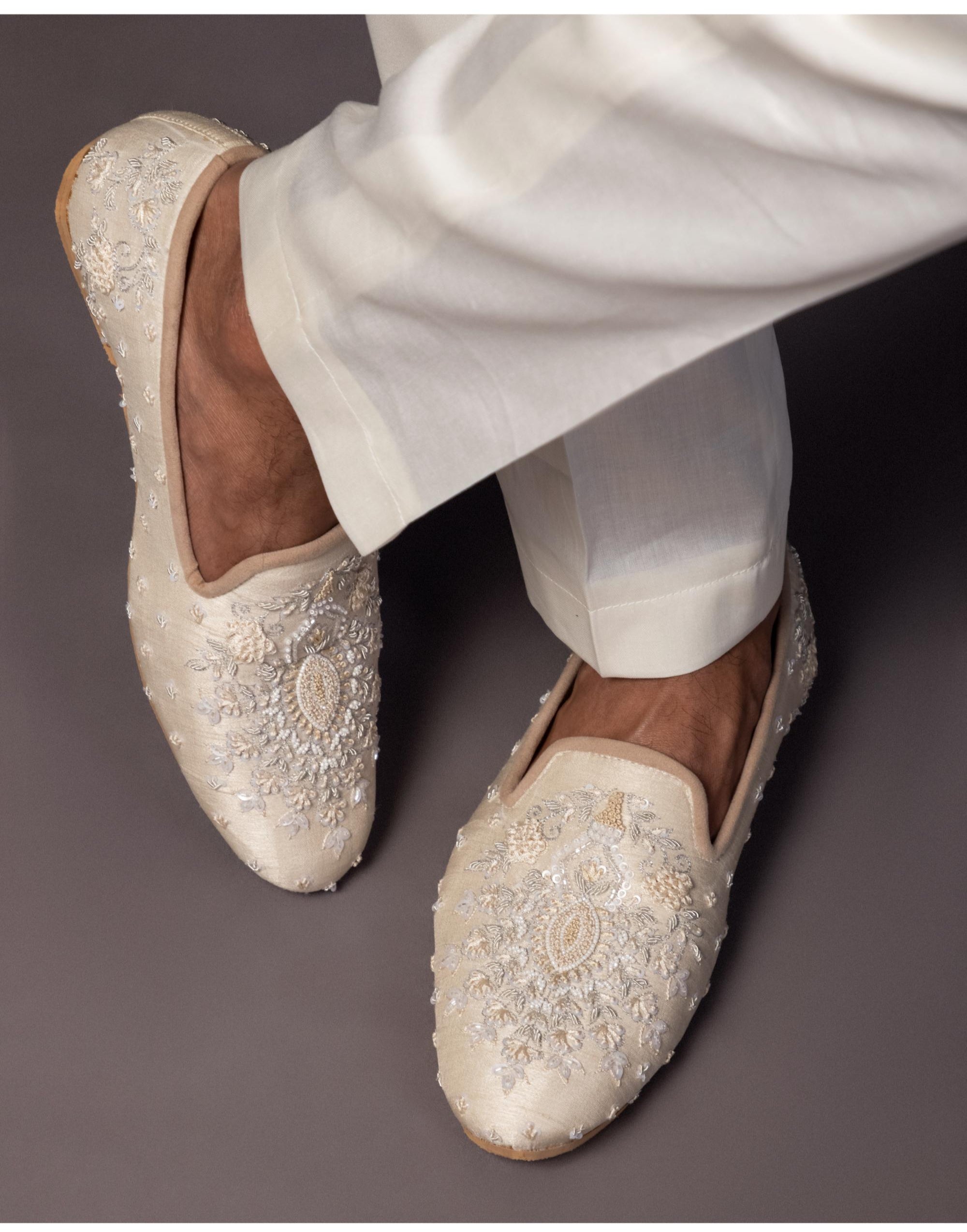 Step into regal elegance with our Fawn Shade Crown Glory Silk Jutti, exquisitely handcrafted with intricate silver bullion embroidery and delicate Dabka work. Designed for those who appreciate heritage craftsmanship and timeless luxury, this refined pair adds a touch of sophistication to any festive or wedding ensemble. Elevate your style with this perfect blend of tradition and opulence.