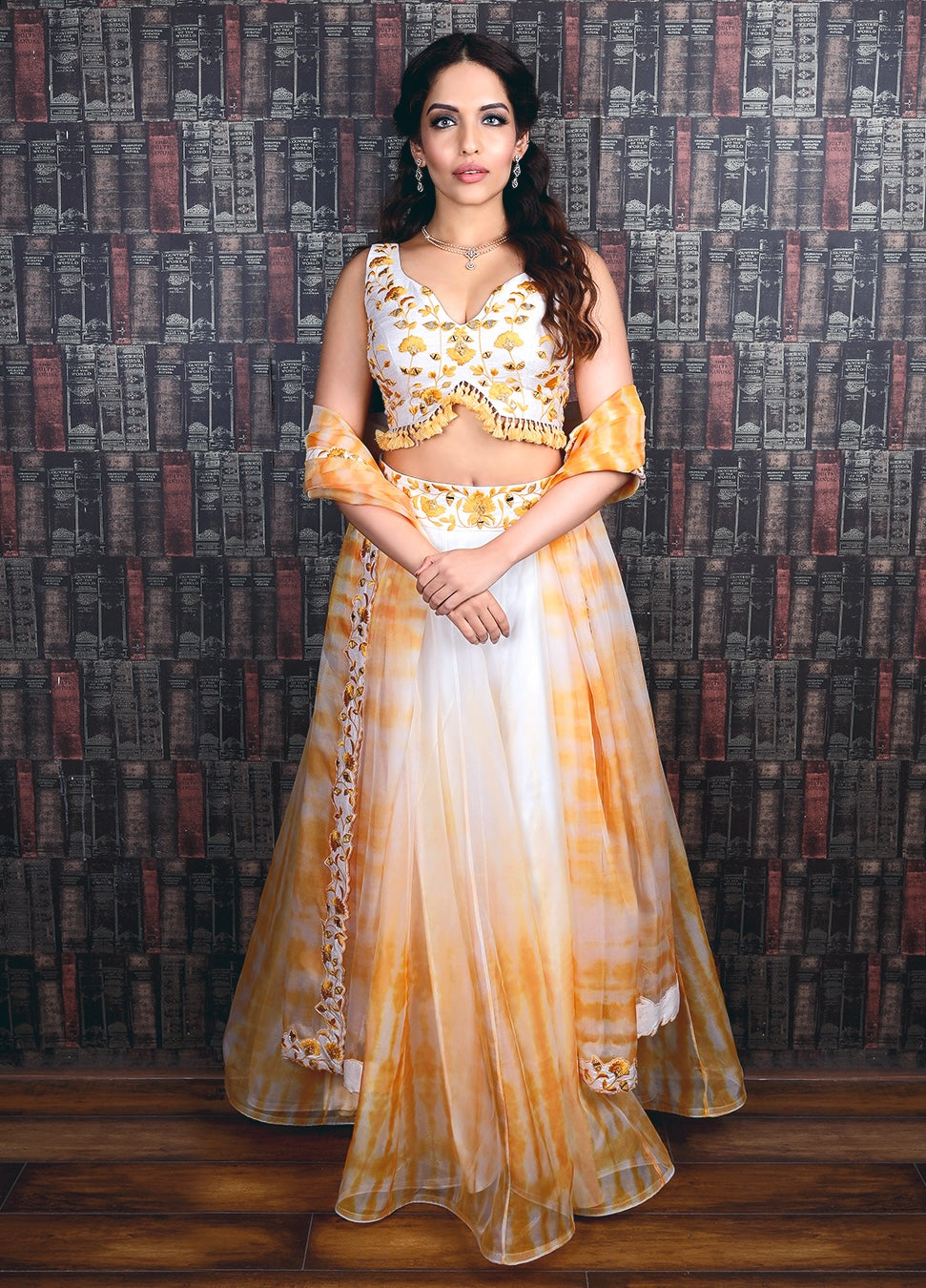 Enveloped between tie dye yellow hues and traditional resham embroidery lies this lehenga. The organza digitally printed tie dye lehenga has an embroidered belt. The blouse is embroidered with resham and mirror work and has tie-dye tassels at its ending. It’s paired with a tie dye printed dupatta with an embroidered border. the outfit colour and blouse style for you.