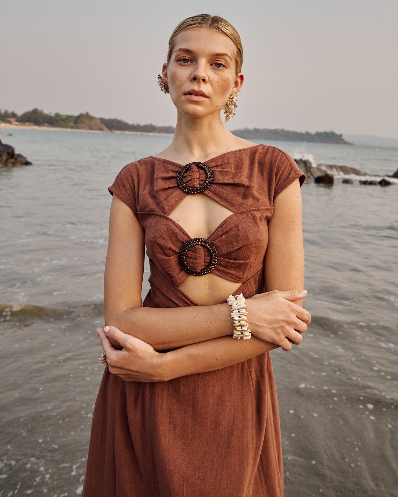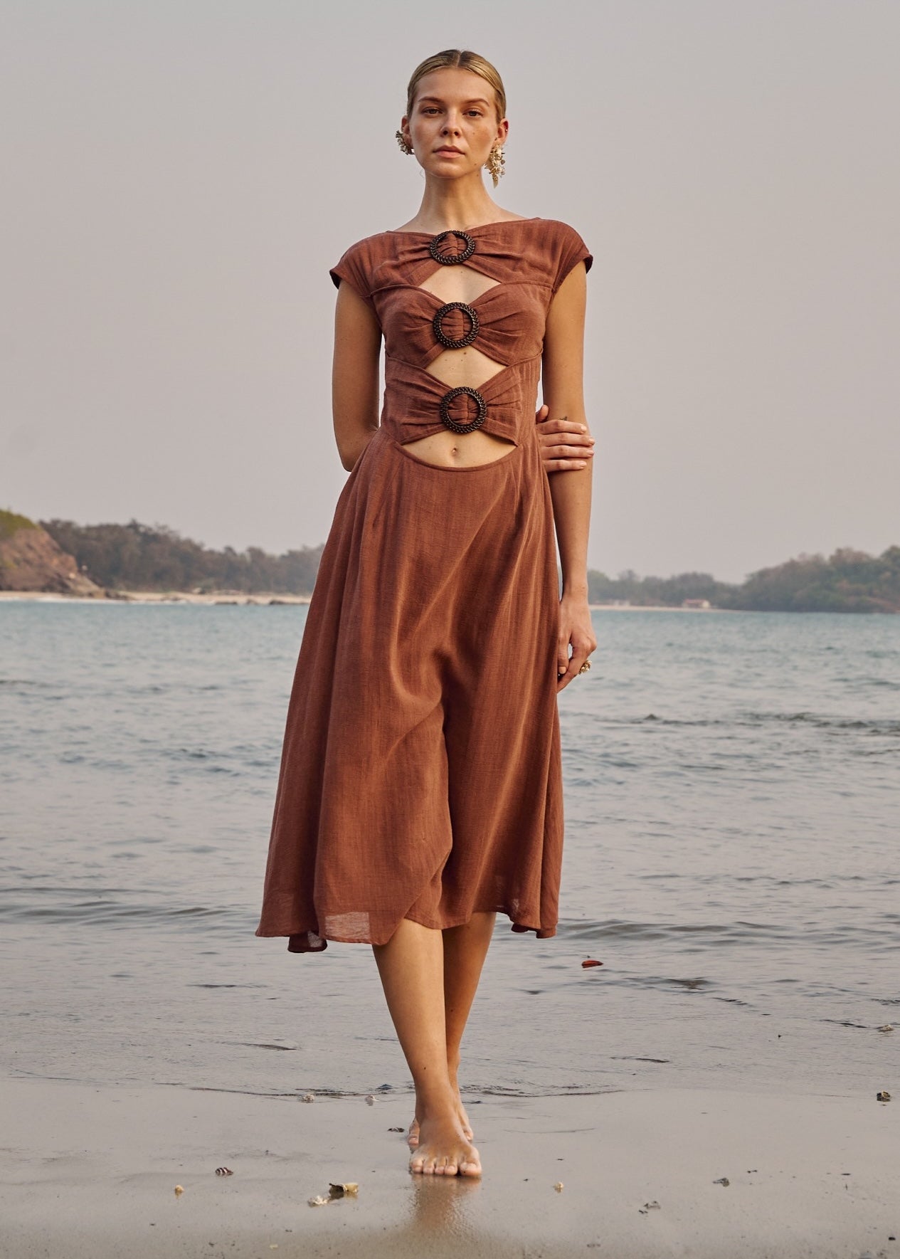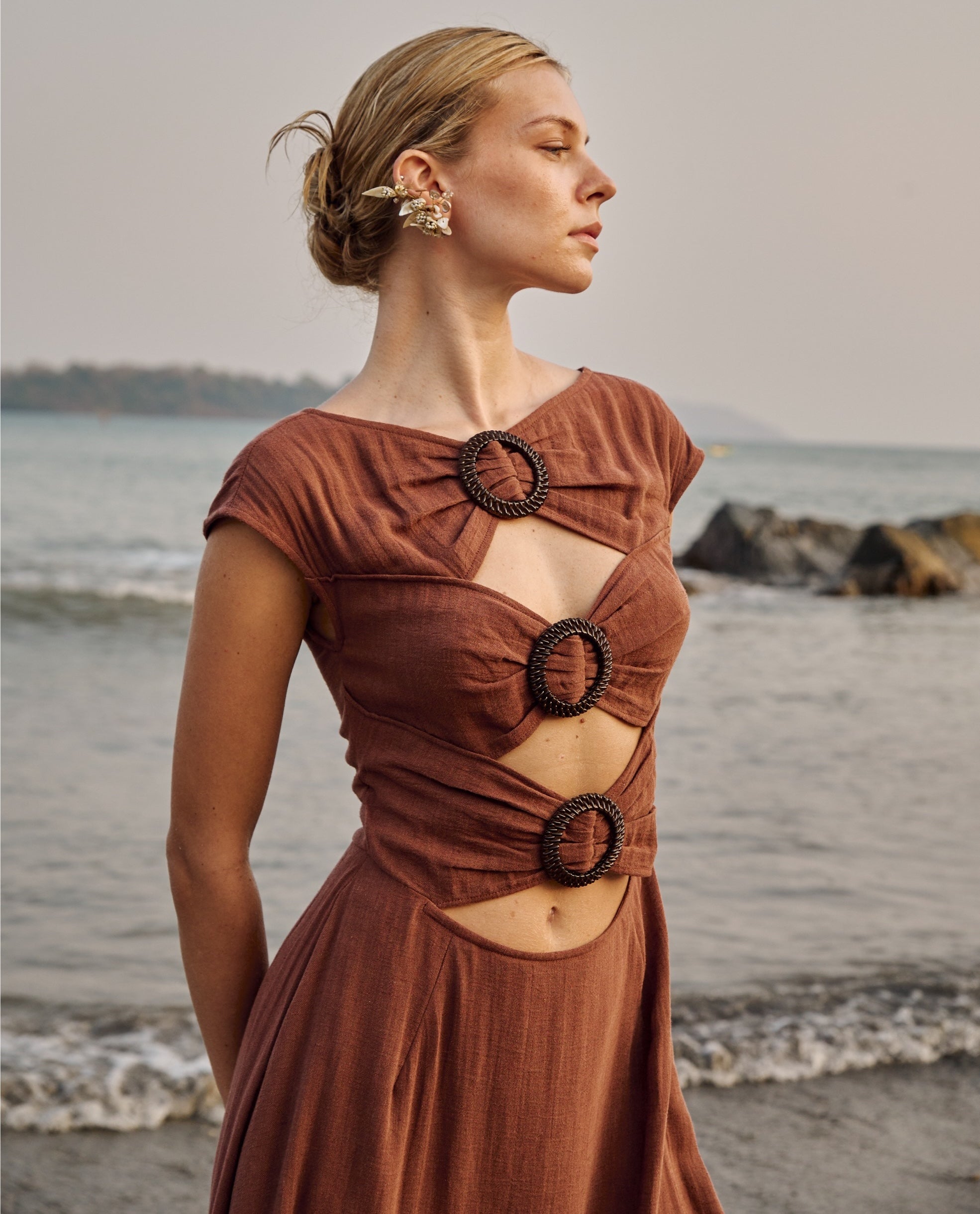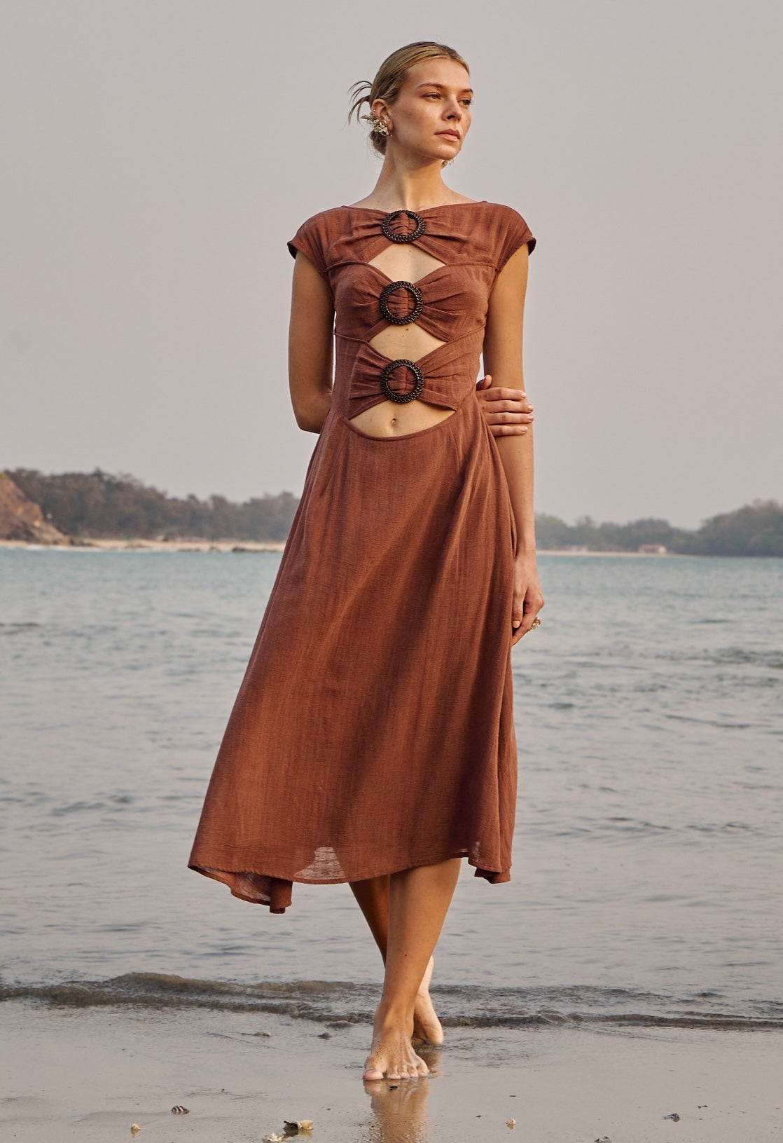 Designed to capture every gaze, the Flova dress is a true showstopper. With strategically placed cut-outs that enhance and flatter a variety of body types, this dress is both flattering and eye-catching. The boho chic buckle details add a unique touch, elevating its overall vibe. True to size and designed to fit seamlessly with your style, the Flova dress is your go-to for making a bold, unforgettable impression.