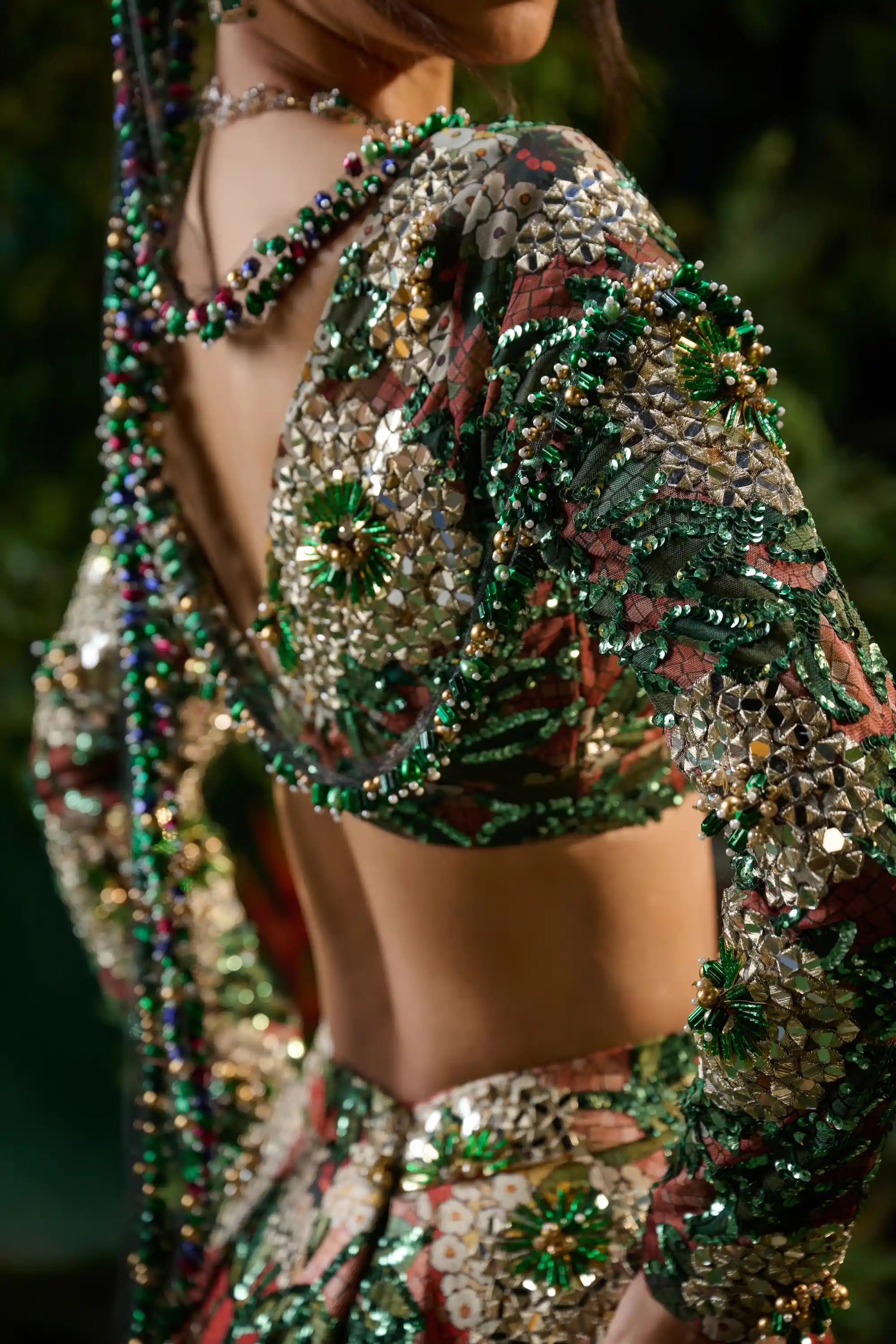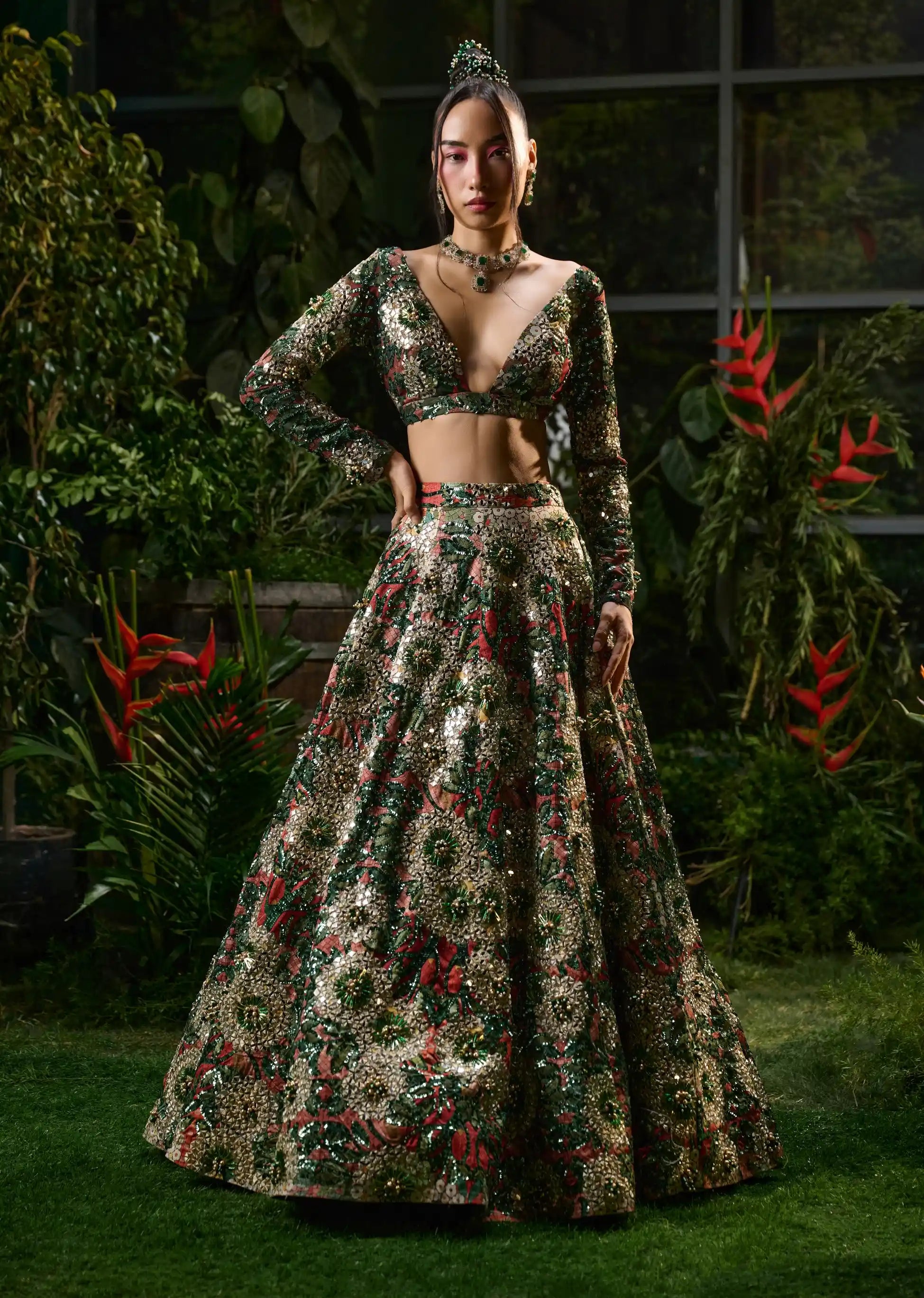 A stunning silhouette awaits! This statement piece showcases deep forest green hues, handcrafted with exquisite mirror embroidery that elegantly flows throughout the skirt. Paired with an intricately embroidered blouse, it features a plunging neckline and full sleeves, creating a modern look that’s perfect for the contemporary bride. Enhanced by intricate embellishments, this lehenga is sure to leave a lasting impression on your special day.
