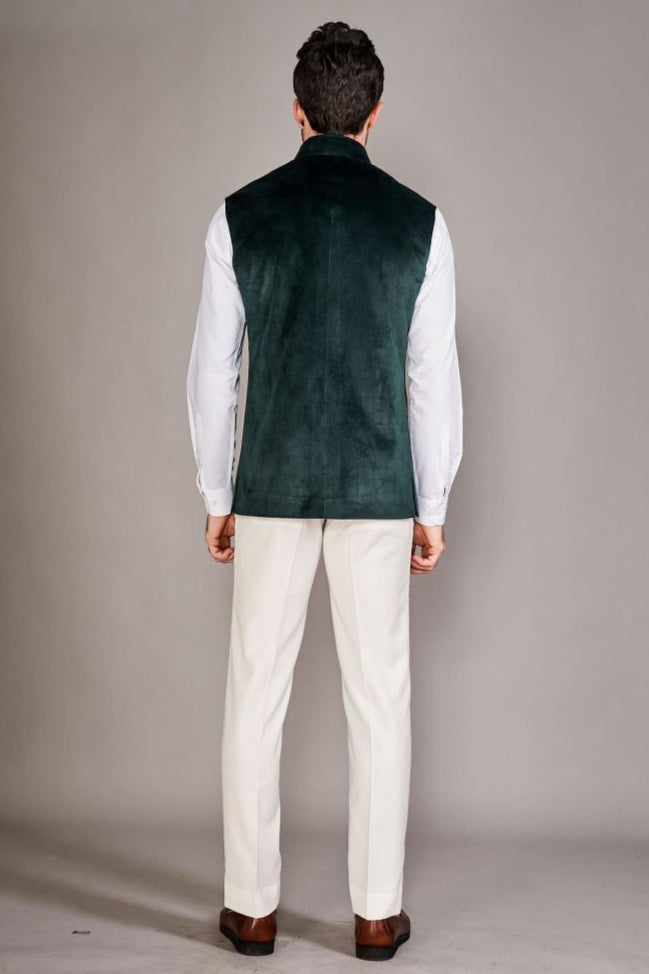 Embrace opulence with this Forest Green Velvet Bundi paired with a White Chinese Collar Shirt. The rich, luxurious velvet fabric of the Bundi offers a sophisticated, timeless appeal, while the white Chinese collar shirt provides a sleek, modern contrast. Ideal for formal events or festive occasions, this ensemble perfectly balances tradition and contemporary flair for an unforgettable look.