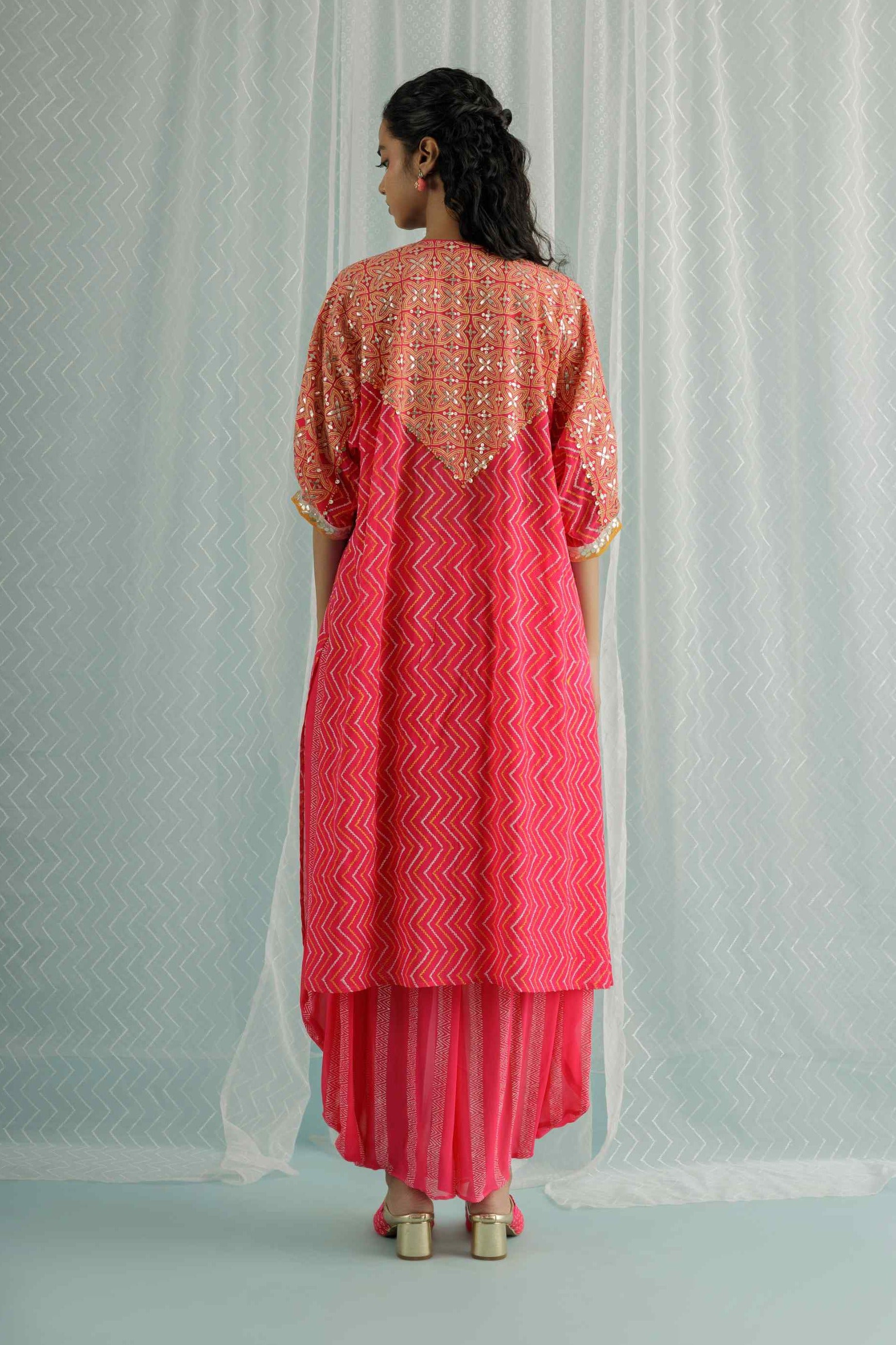 Experience refined elegance with our fuchsia georgette choga kurta, adorned with custom block printing in ivory and yellow. The design is enriched with hand-embroidered gota, sequins, and beads, adding a touch of opulence. This kurta is paired with a coordinating short inner and printed dhoti pants, combining traditional charm with modern sophistication. Perfect for special events, this ensemble ensures a stunning and graceful appearance.