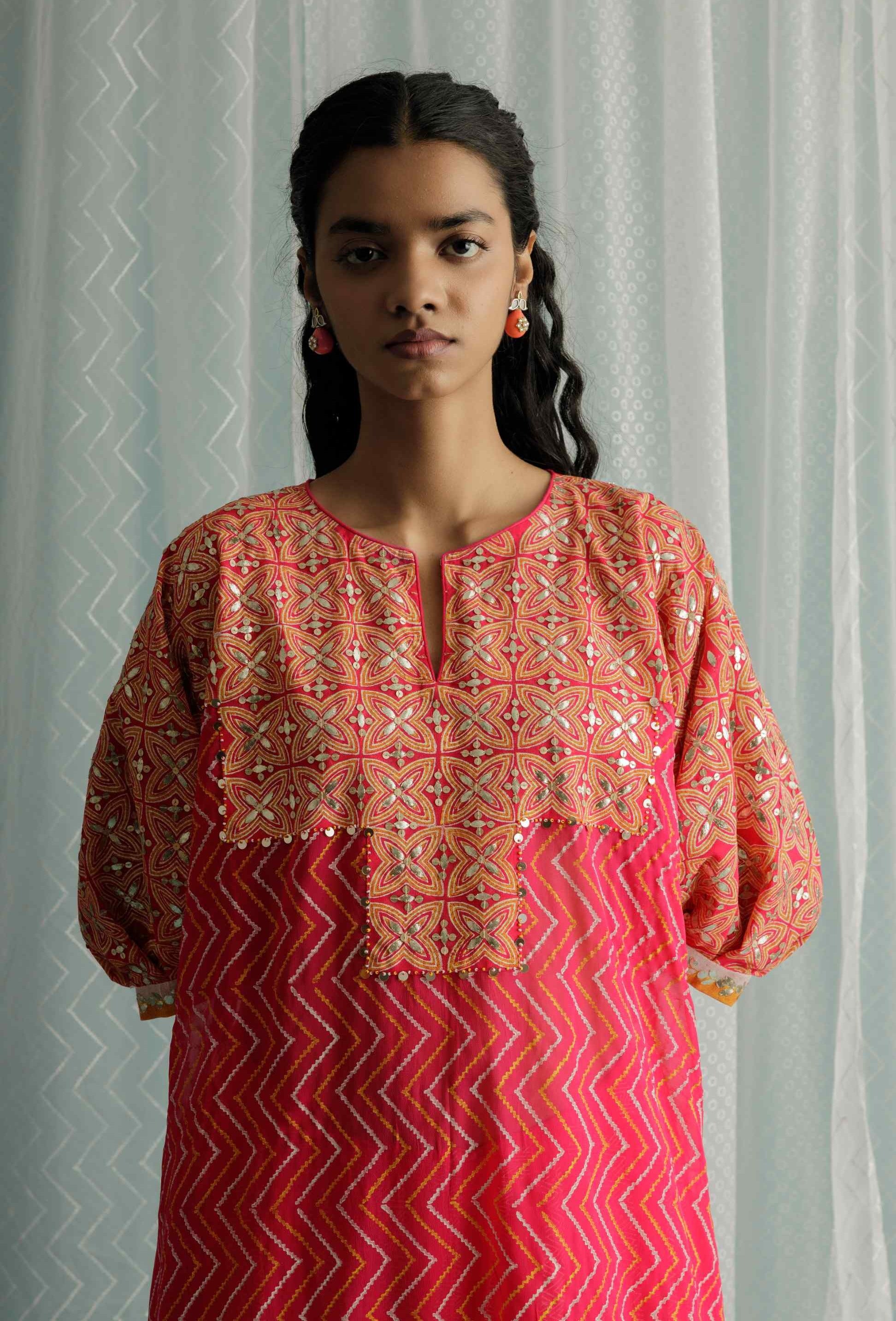 Surbhi Gupta embraces minimalism with designs inspired by architecture and global crafts. Featuring geometric motifs and symmetrical patterns, the brand combines traditional Indian techniques like block printing, tie-dye, and hand embroidery with simple, elegant silhouettes. The collections offer a refined blend of timeless craftsmanship and contemporary sophistication, perfect for those seeking understated elegance.