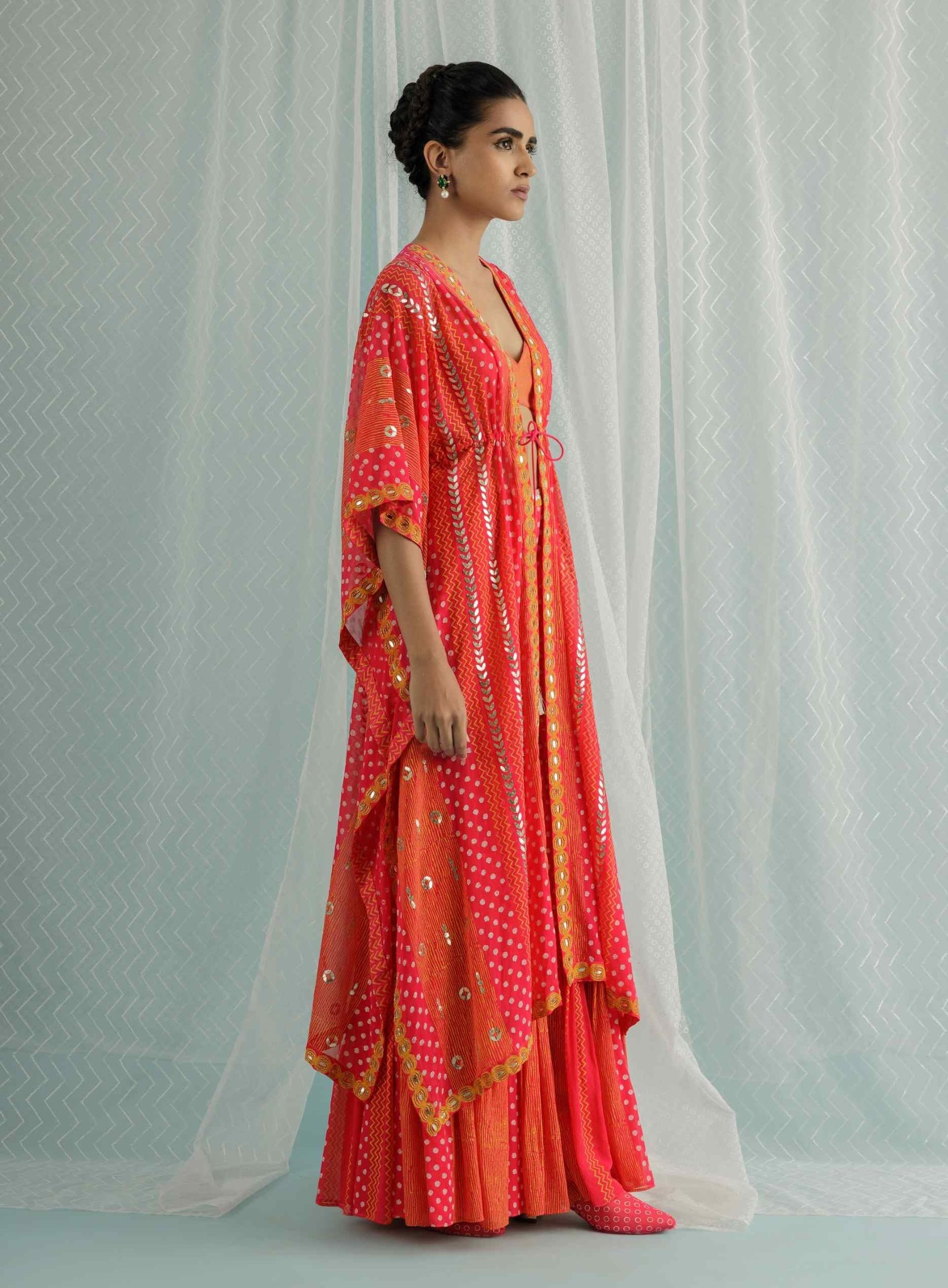Elevate your wardrobe with our fuchsia georgette tiered sharara and kaftan, featuring custom block printing in vibrant shades of yellow and ivory. The exquisite print is enhanced with intricate hand embroidery, including gota, sequins, and beadwork, adding a touch of opulent detail. This stunning set is paired with a coordinating stripe-printed blouse, creating a perfect blend of traditional elegance and modern design. Ideal for special occasions, this ensemble ensures a chic and sophisticated look that exudes grace and charm.