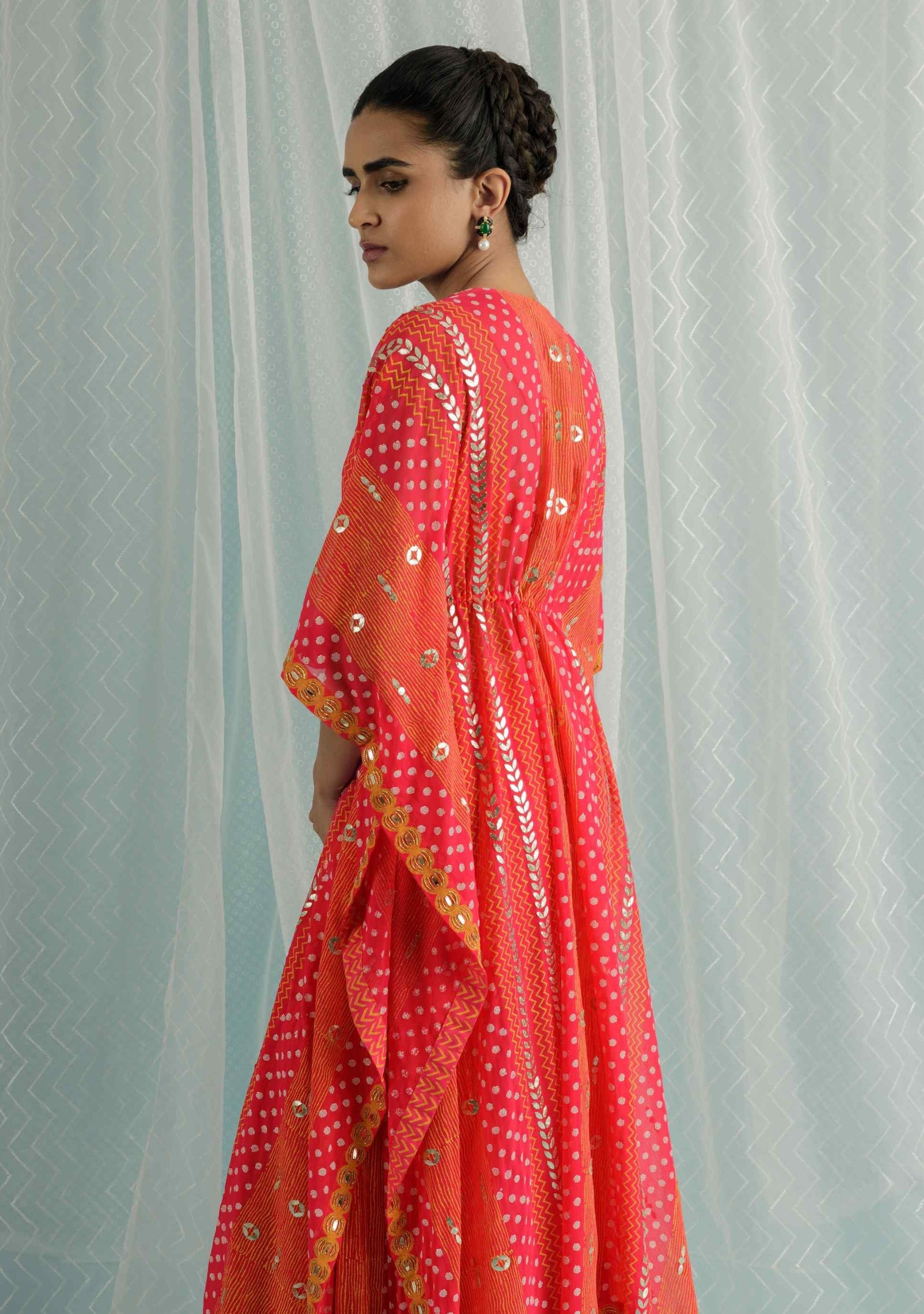 (Gota embroidery is a traditional Indian technique involving the use of metallic ribbon or zari to create intricate patterns and embellishments on fabric, often used in regal and festive attire.)