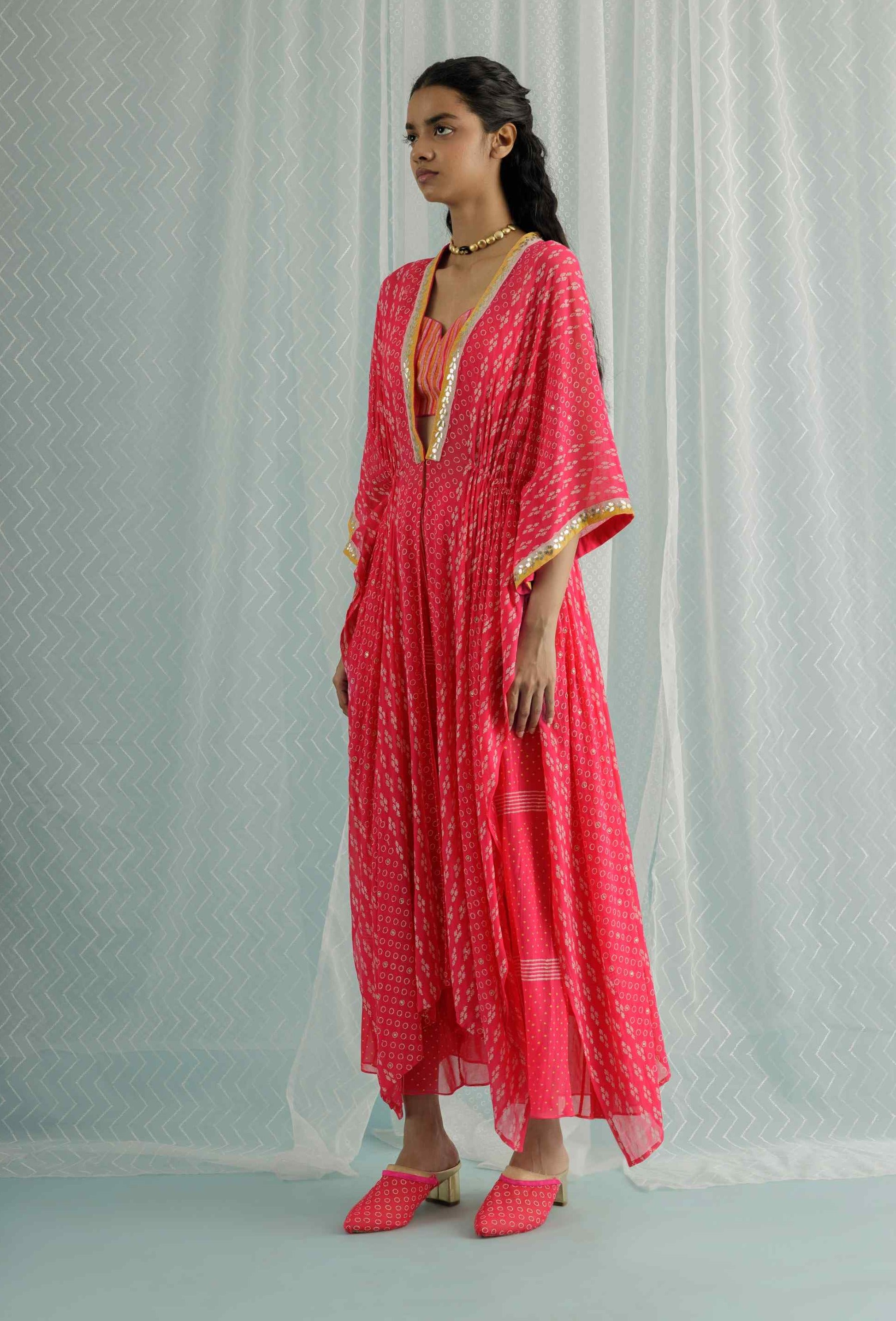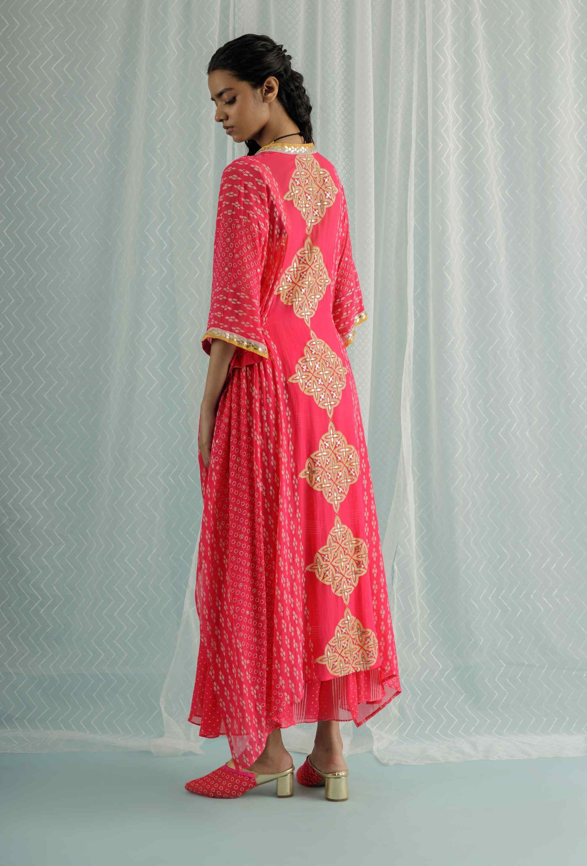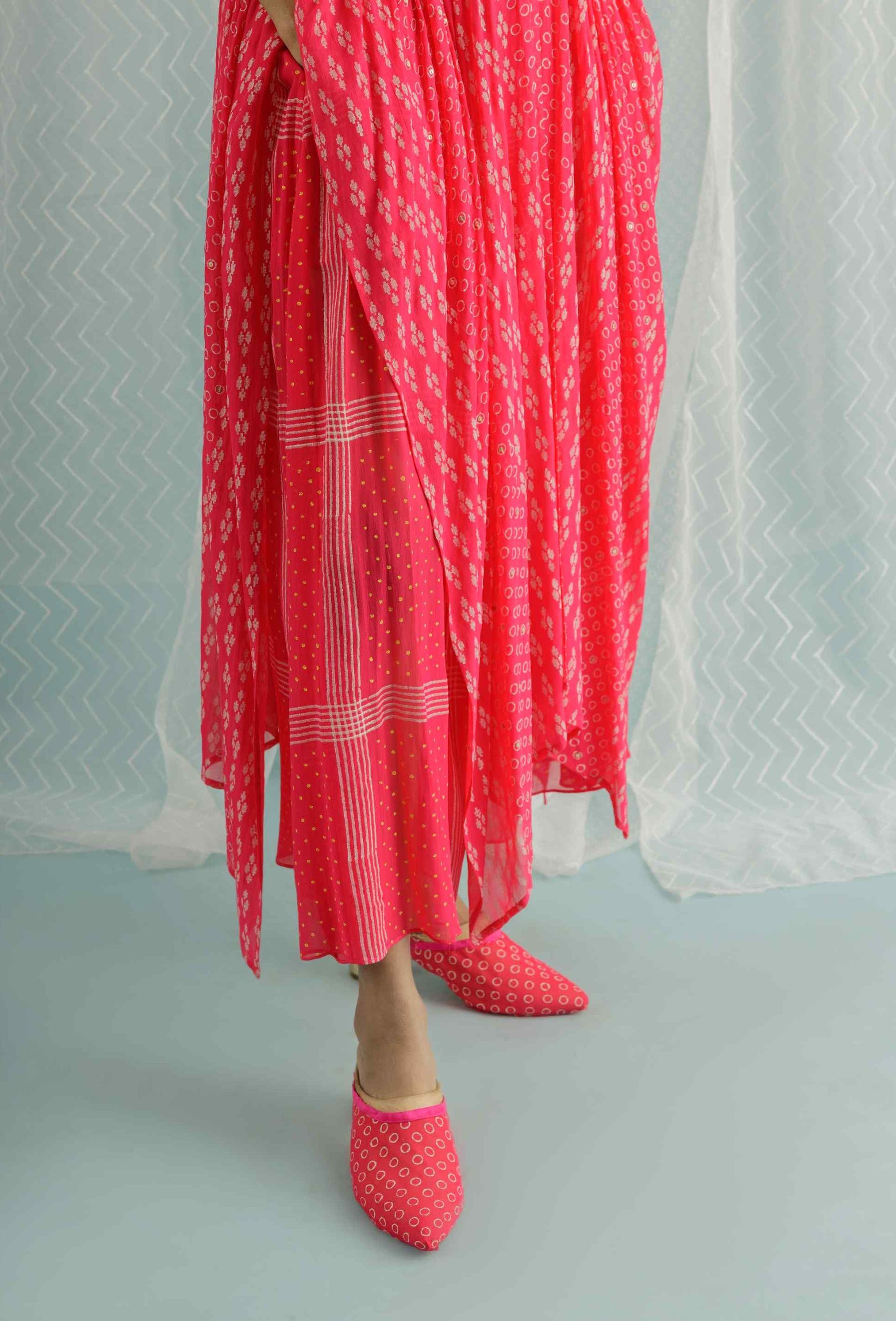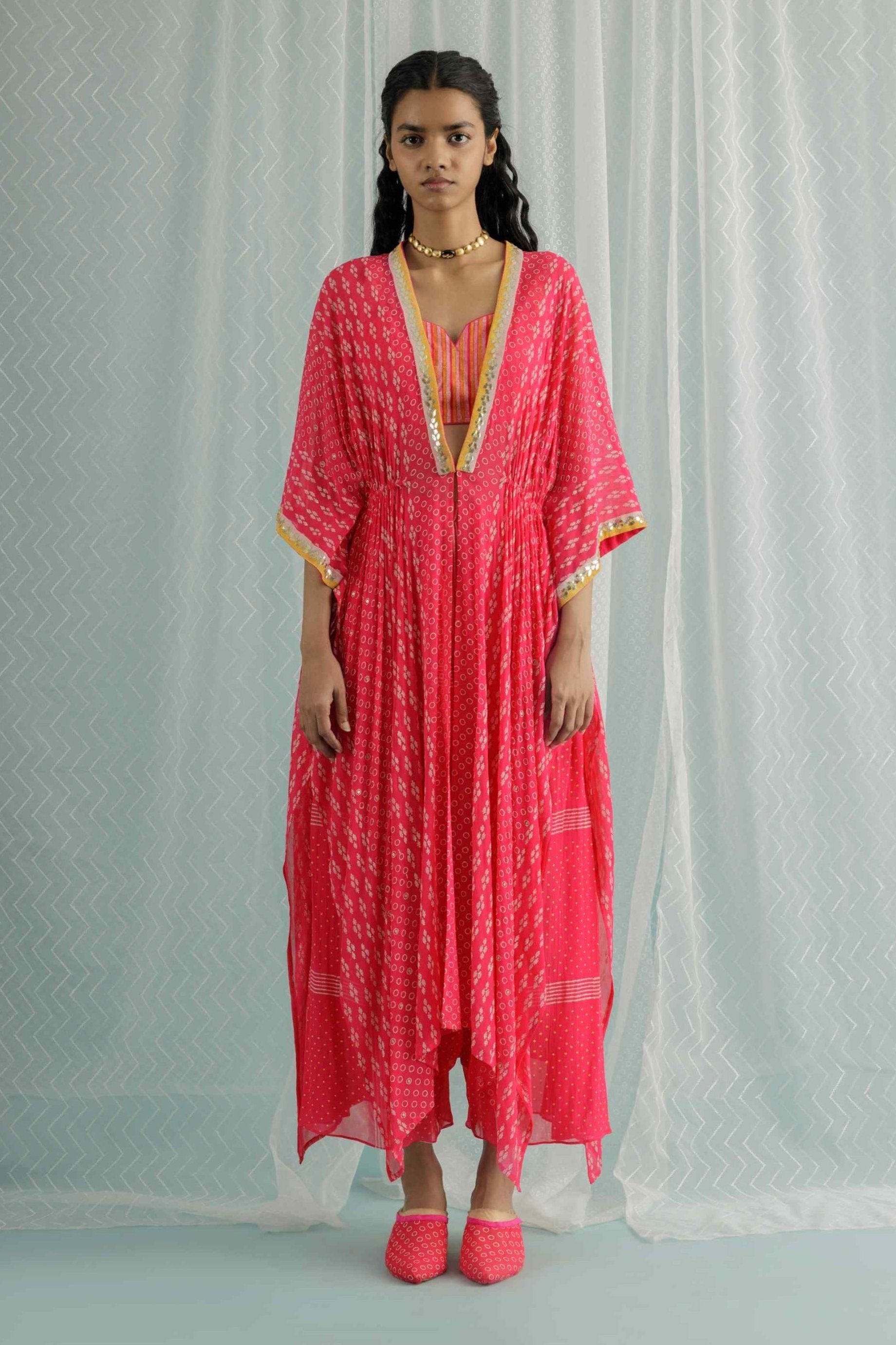 Our fuchsia georgette cape, featuring custom block printing in shades of yellow and ivory, is beautifully embellished with hand-embroidered gota, sequins, and beads. Paired with a stripe-printed blouse and printed low-crotch trousers, this ensemble combines traditional craftsmanship with modern flair. Perfect for any special occasion, it offers a sophisticated and eye-catching look that radiates grace and style.