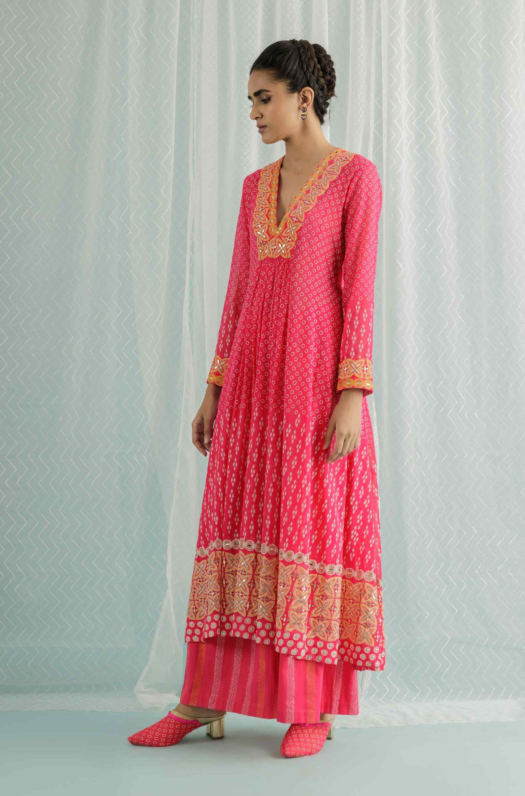 Experience the epitome of sophistication with our fuchsia georgette anarkali, showcasing custom block printing in shades of yellow and ivory. The intricate design is elevated with hand embroidery, including gota, sequins, and beadwork, adding a touch of luxurious detail. This elegant anarkali is paired with a coordinating short inner, a printed trouser, and a beautifully embroidered organza dupatta. Perfect for special occasions, this ensemble effortlessly combines traditional artistry with contemporary style, ensuring a standout appearance that radiates both charm and grace.