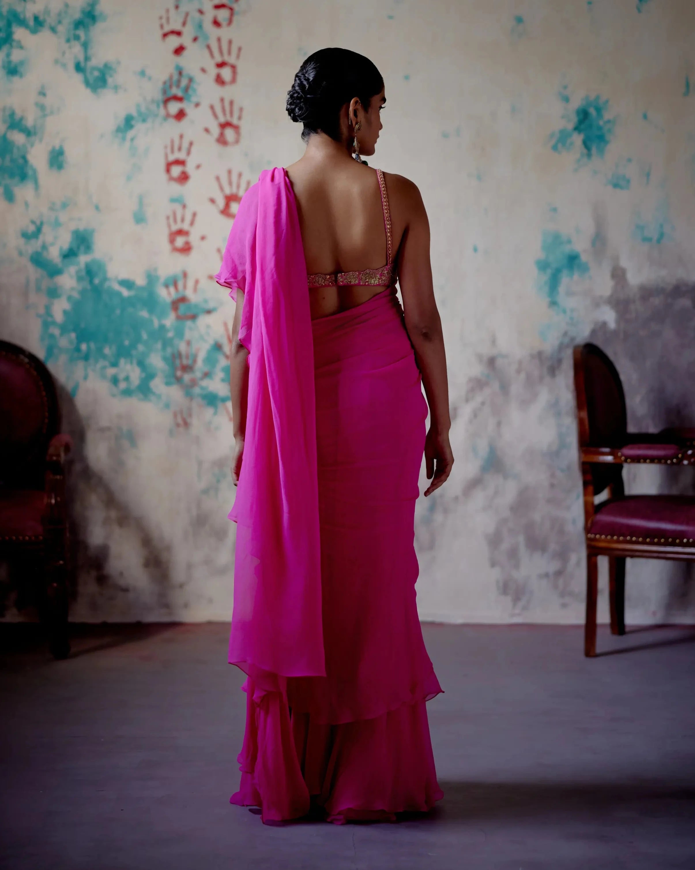 Make a striking statement with our Fuchsia Pink Draped Saree, beautifully complemented by a stylish bralet blouse. This stunning saree features a modern draped design that flows effortlessly, creating an elegant silhouette. The vibrant fuchsia pink hue adds a bold and playful touch, perfect for parties, weddings, or festive occasions.