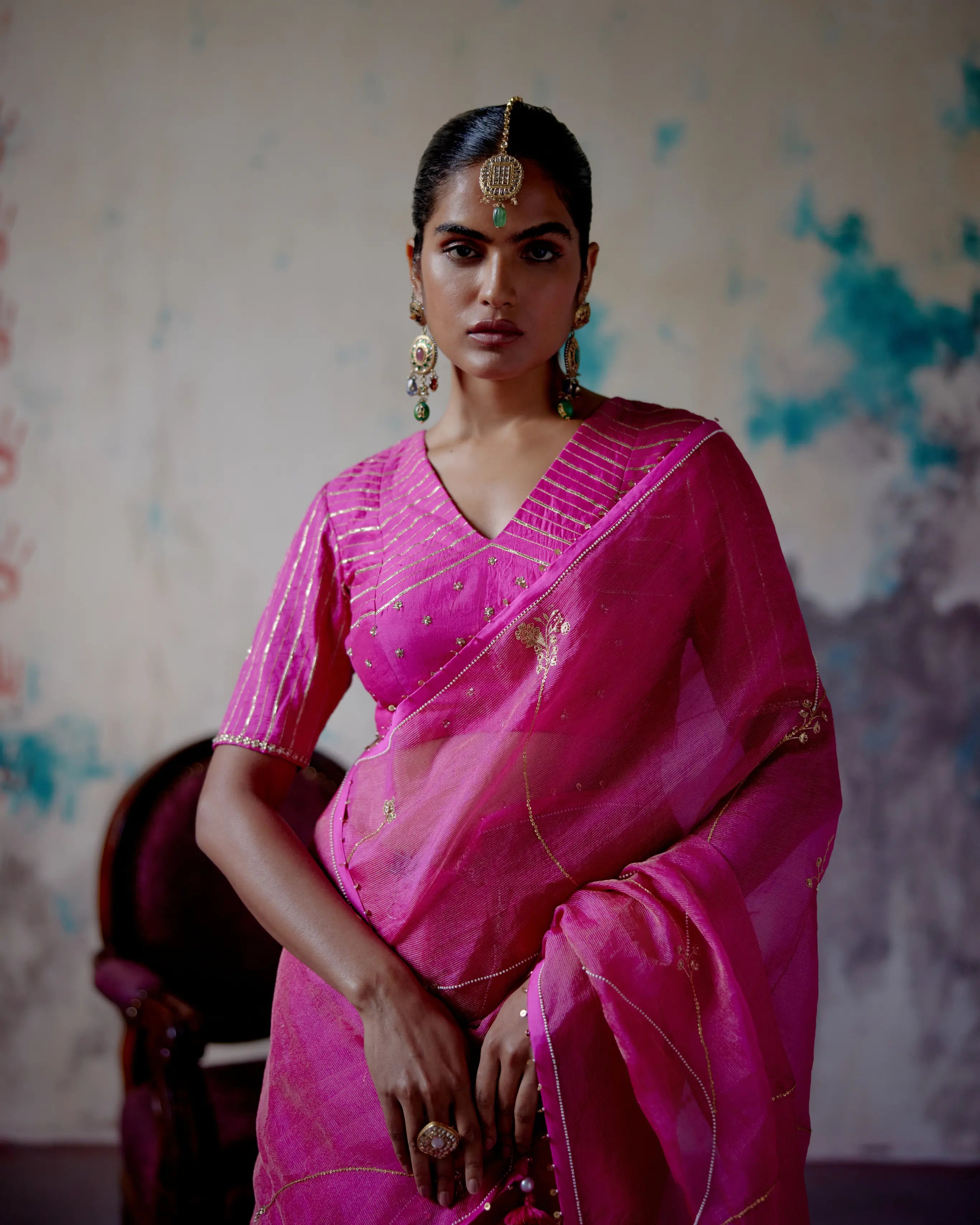 Elevate your ethnic style with our stunning Fuchsia Pink Zari Organza Saree, complemented by a beautifully crafted blouse. This exquisite saree features delicate zari work that shimmers against the soft organza fabric, creating a captivating look perfect for weddings, festive celebrations, or special events. The vibrant fuchsia pink hue adds a bold and lively touch, while the lightweight fabric drapes gracefully for effortless elegance. The included blouse enhances the overall ensemble, offering versatility in styling. Drape yourself in this luxurious saree and make a memorable statement shop now!