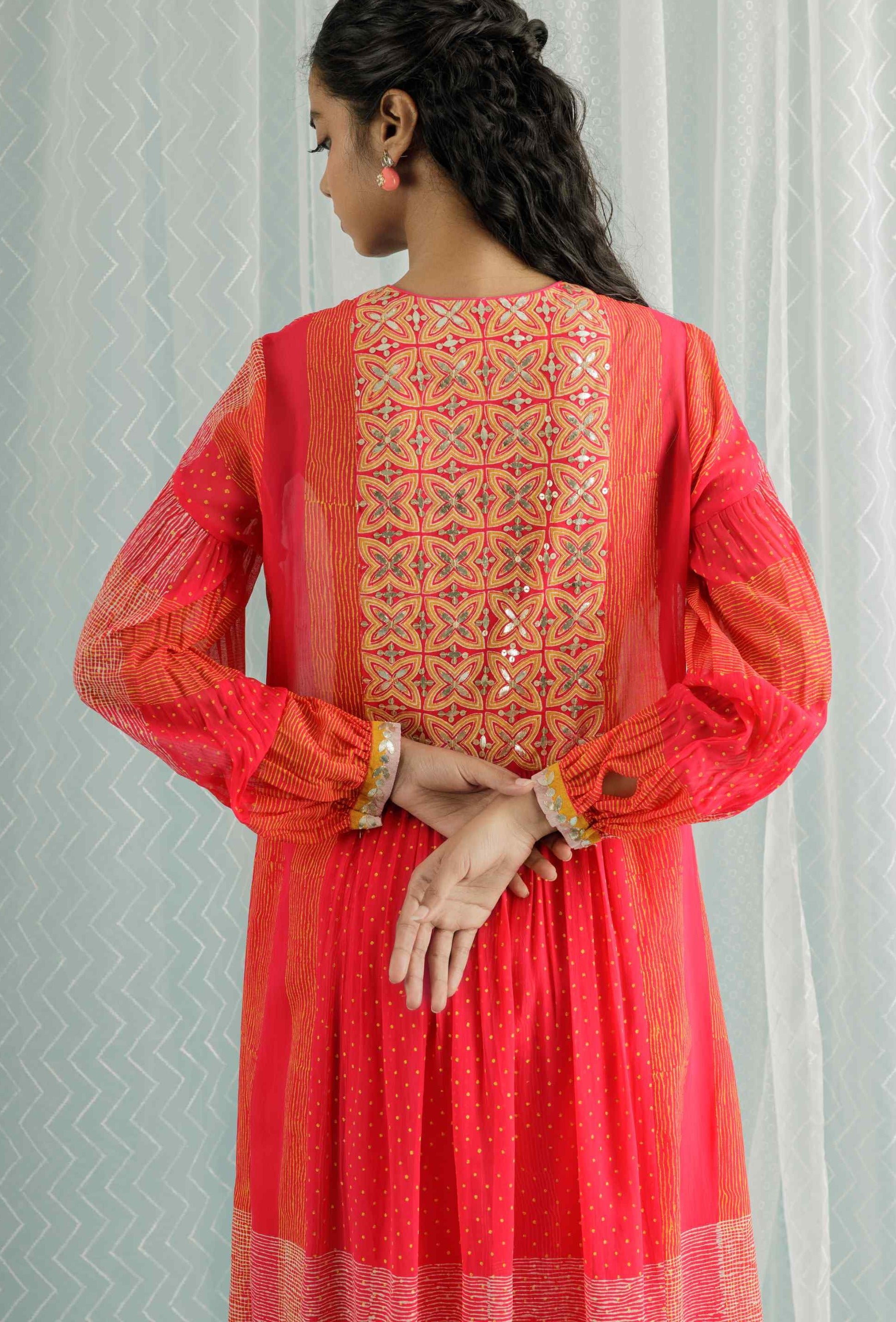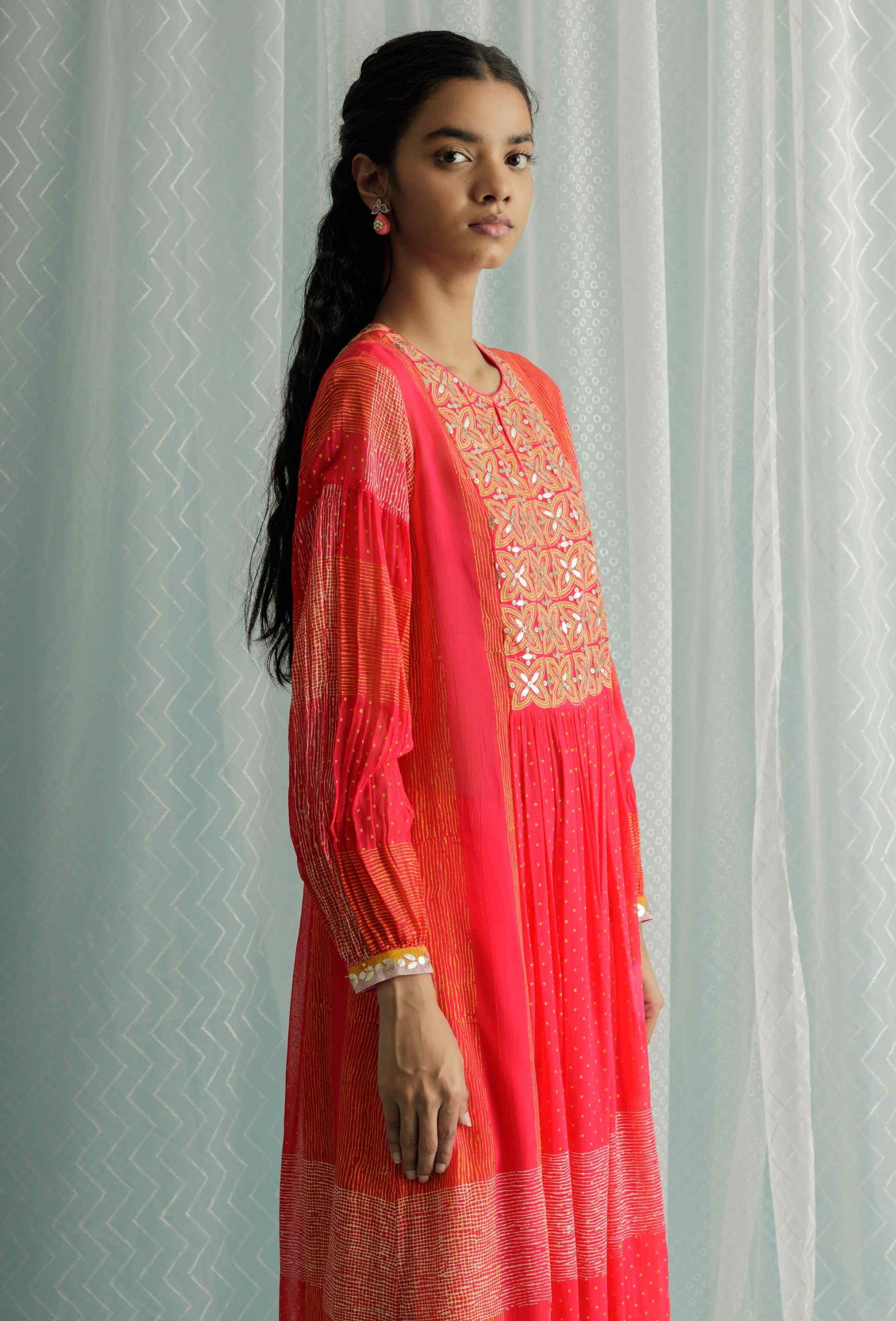 Discover vibrant sophistication with our fuchsia georgette kurta, showcasing custom block printing in shades of yellow and ivory. This striking print is beautifully enhanced with hand-embroidered gota, sequin, and beadwork, adding a touch of intricate elegance. Paired with a printed pleated trouser and a chic short inner, this ensemble offers a harmonious blend of traditional artistry and modern flair. Perfect for special occasions, it ensures a refined and standout appearance that embodies both style and grace.