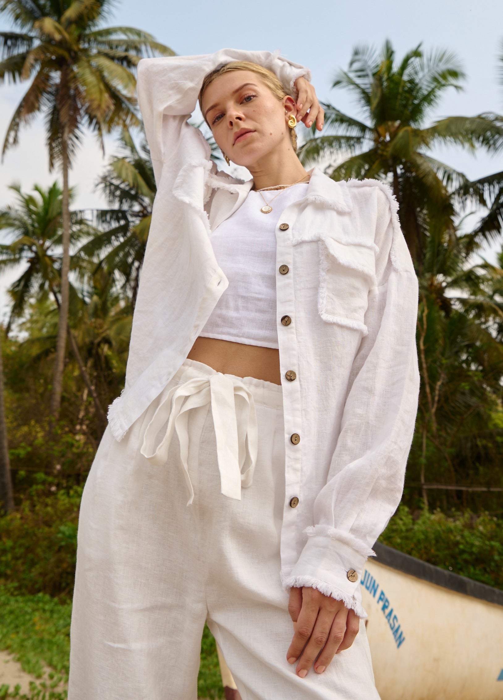 The Arnaud collection is your go-to for a chic, all-white summer look. The linen crop top features a knotted back for a hint of skin and pairs effortlessly with the elasticated, A-line Arnaud pants that come with pockets for added comfort. Complete your outfit with the Arnaud shacket, an oversized linen piece with fringing and coconut buttons, perfect for layering over any ensemble. Together, these pieces create a stylish and coordinated summer wardrobe.