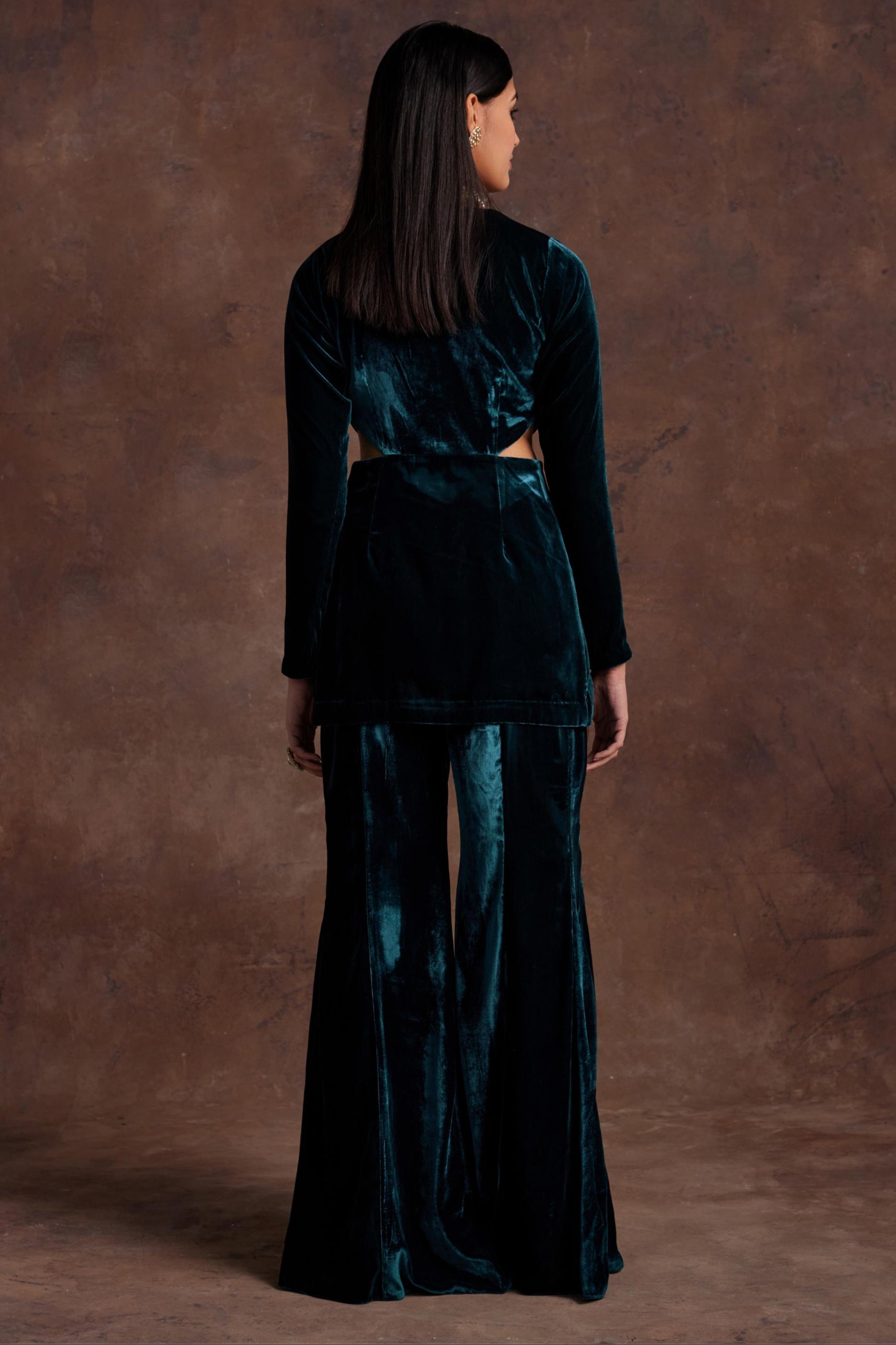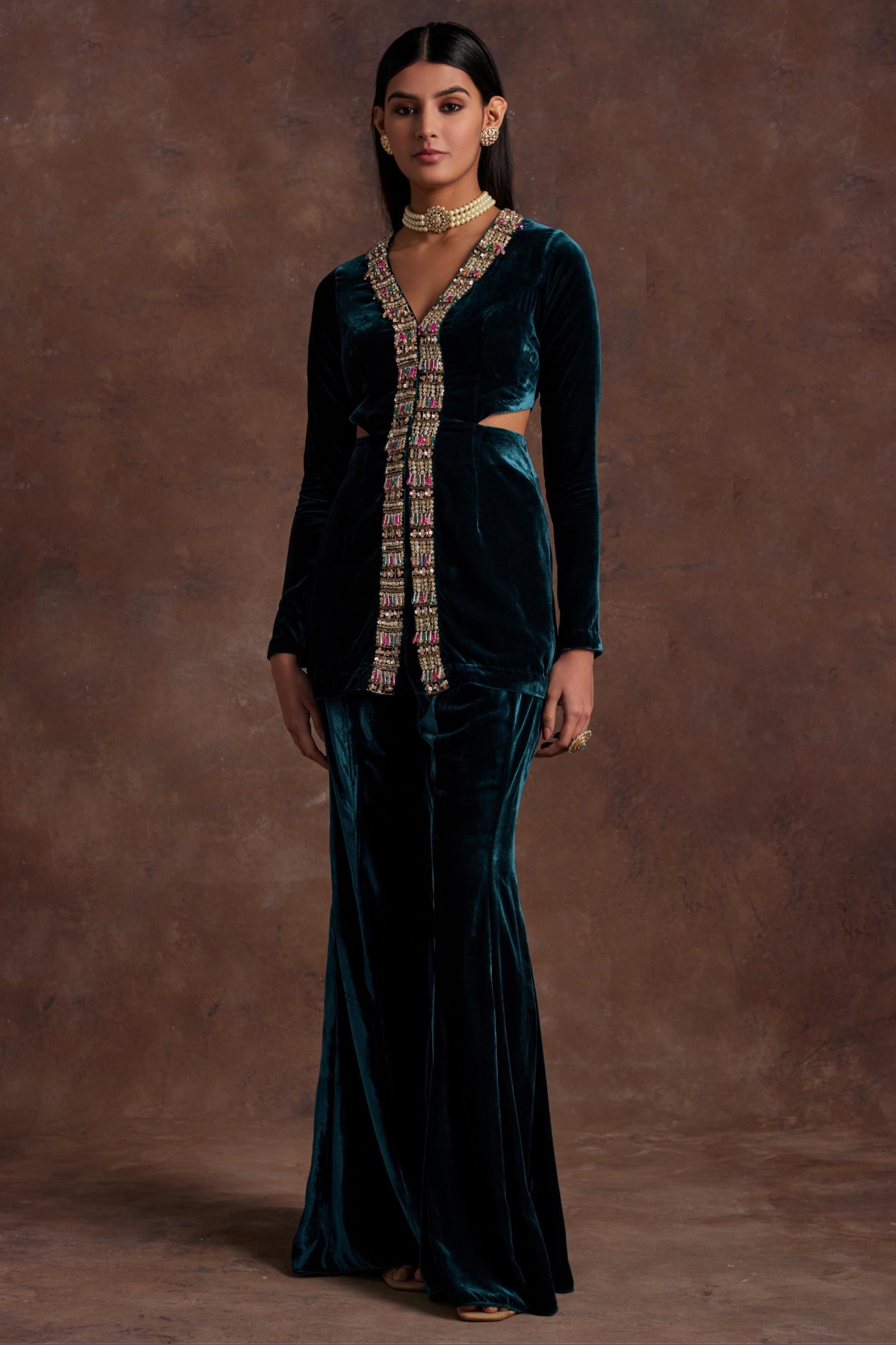 Make a bold statement with this green silk velvet pantsuit, featuring exquisite hand embroidery with tassel accents at the center front. Designed with stylish cutouts at the waist, this modern yet elegant outfit blends sophistication with a touch of drama. Perfect for evening events, it exudes confidence and charm with every detail.