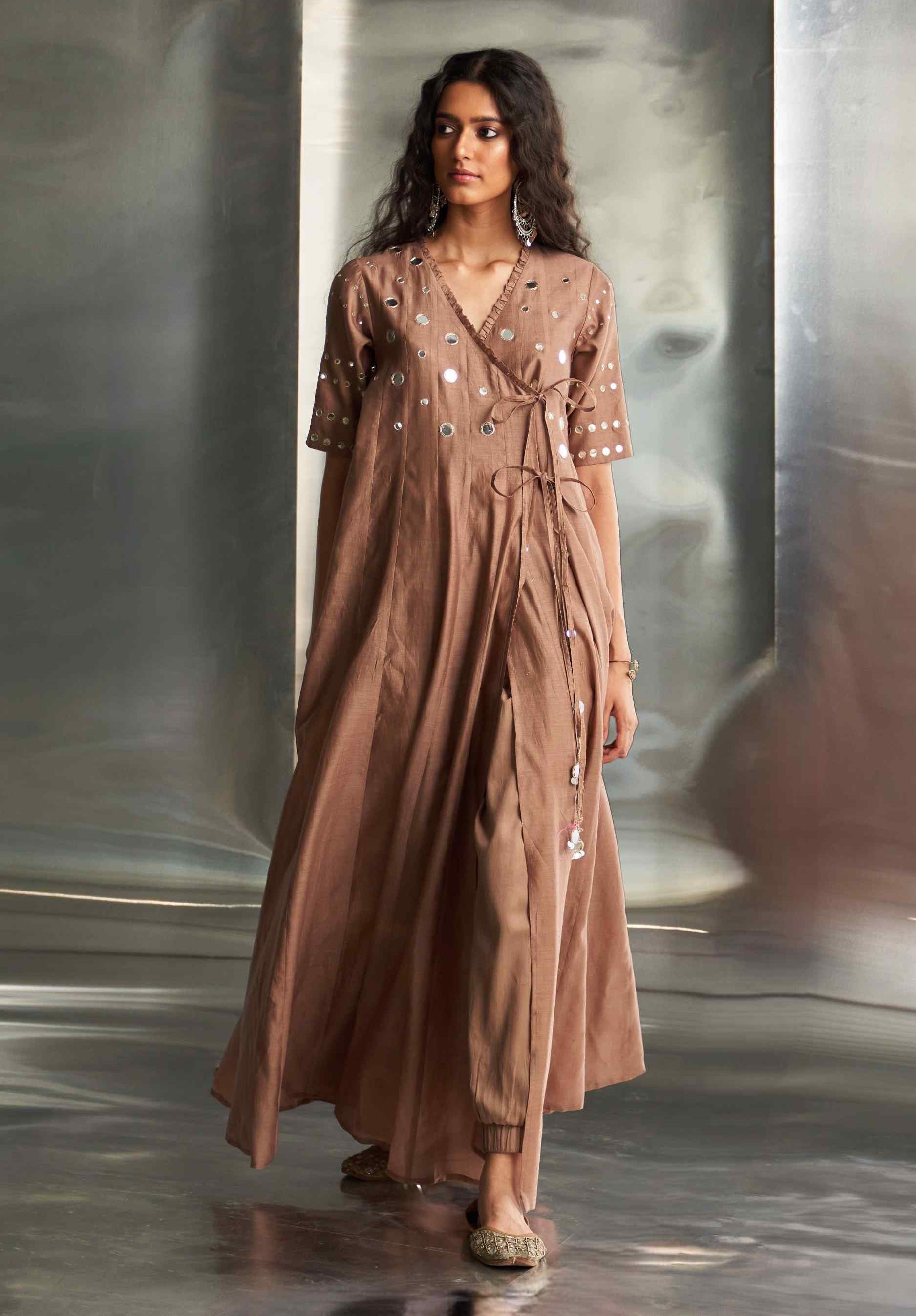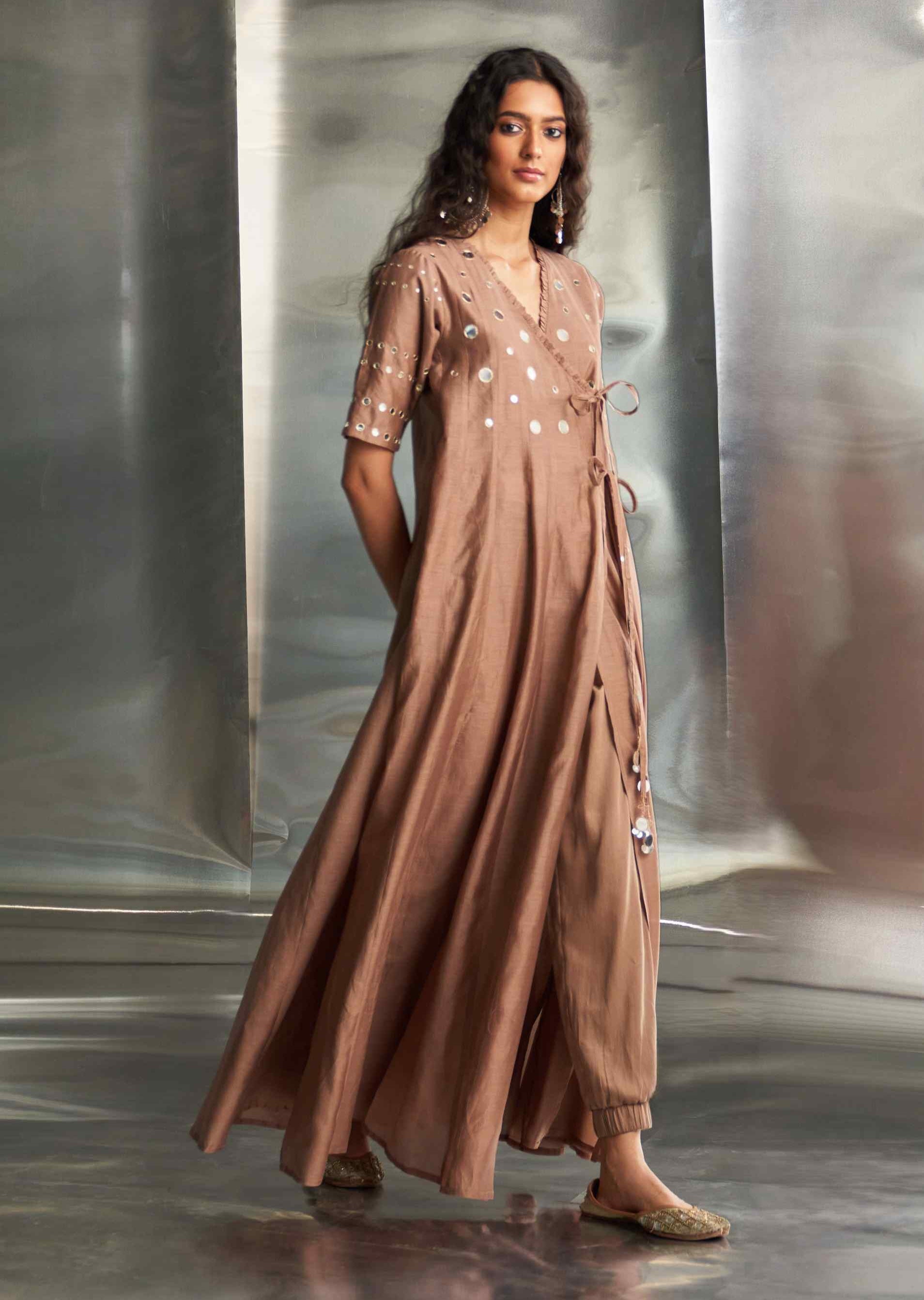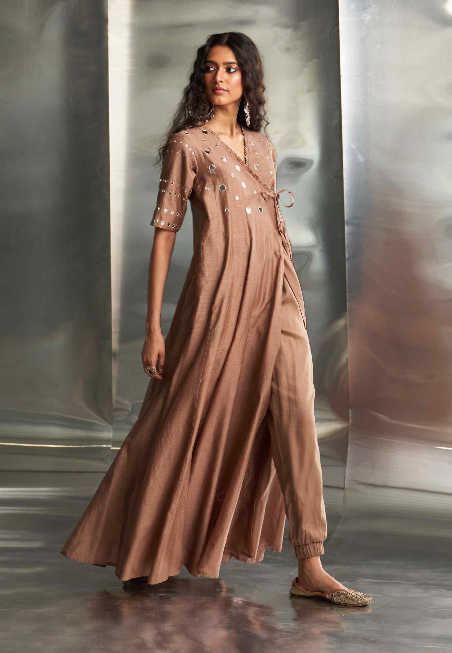 This vibrant ginger Chanderi angrakha wrap-around anarkali is adorned with intricate mirror work on the sleeves and delightful mirror tassels. It seamlessly blends traditional and modern styles, paired with chic joggers for a contemporary edge. The ensemble is completed with a Chanderi dupatta, elegantly embroidered with mirror work along the borders. The joggers feature an elasticated waistband with a drawstring for a comfortable and customizable fit.