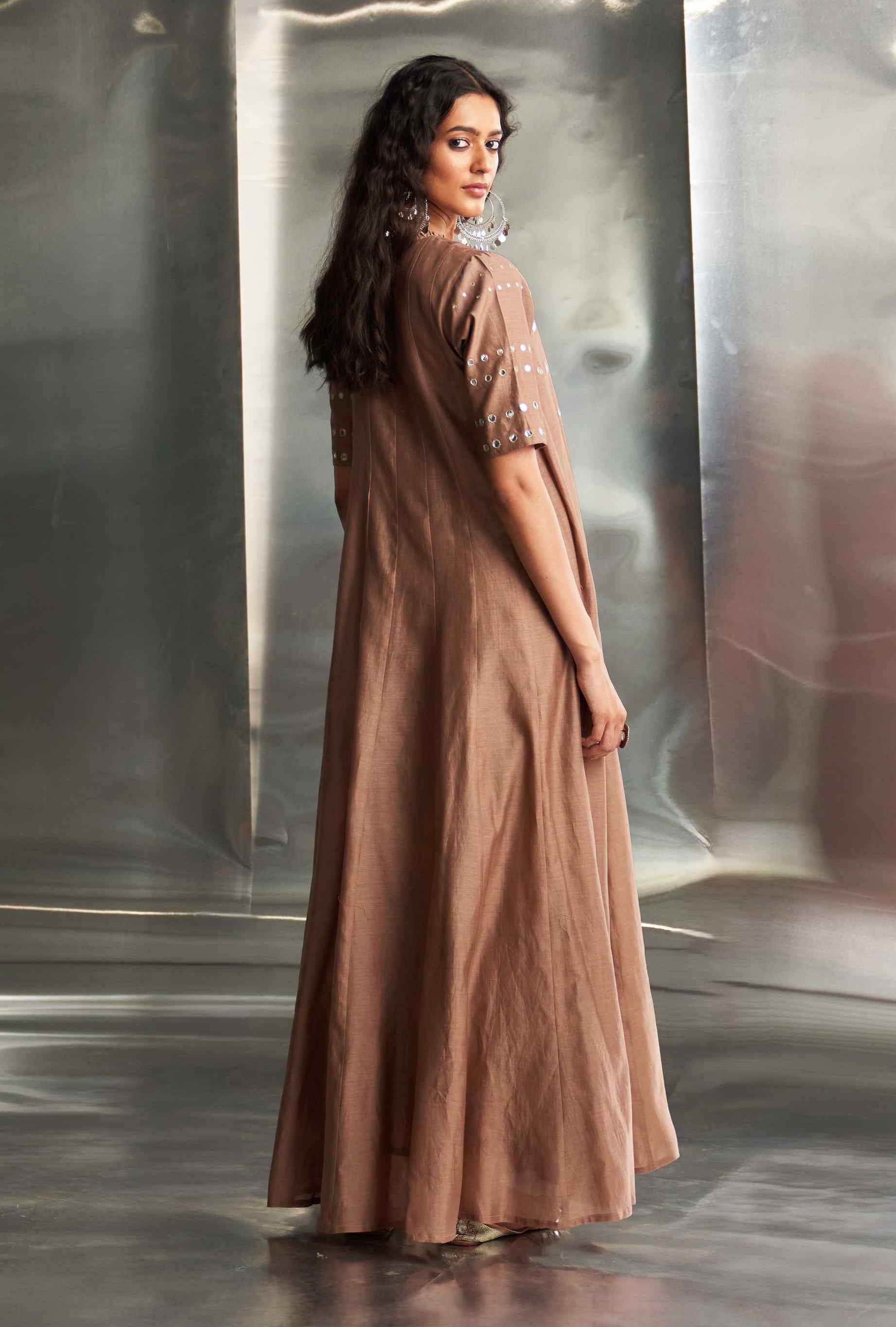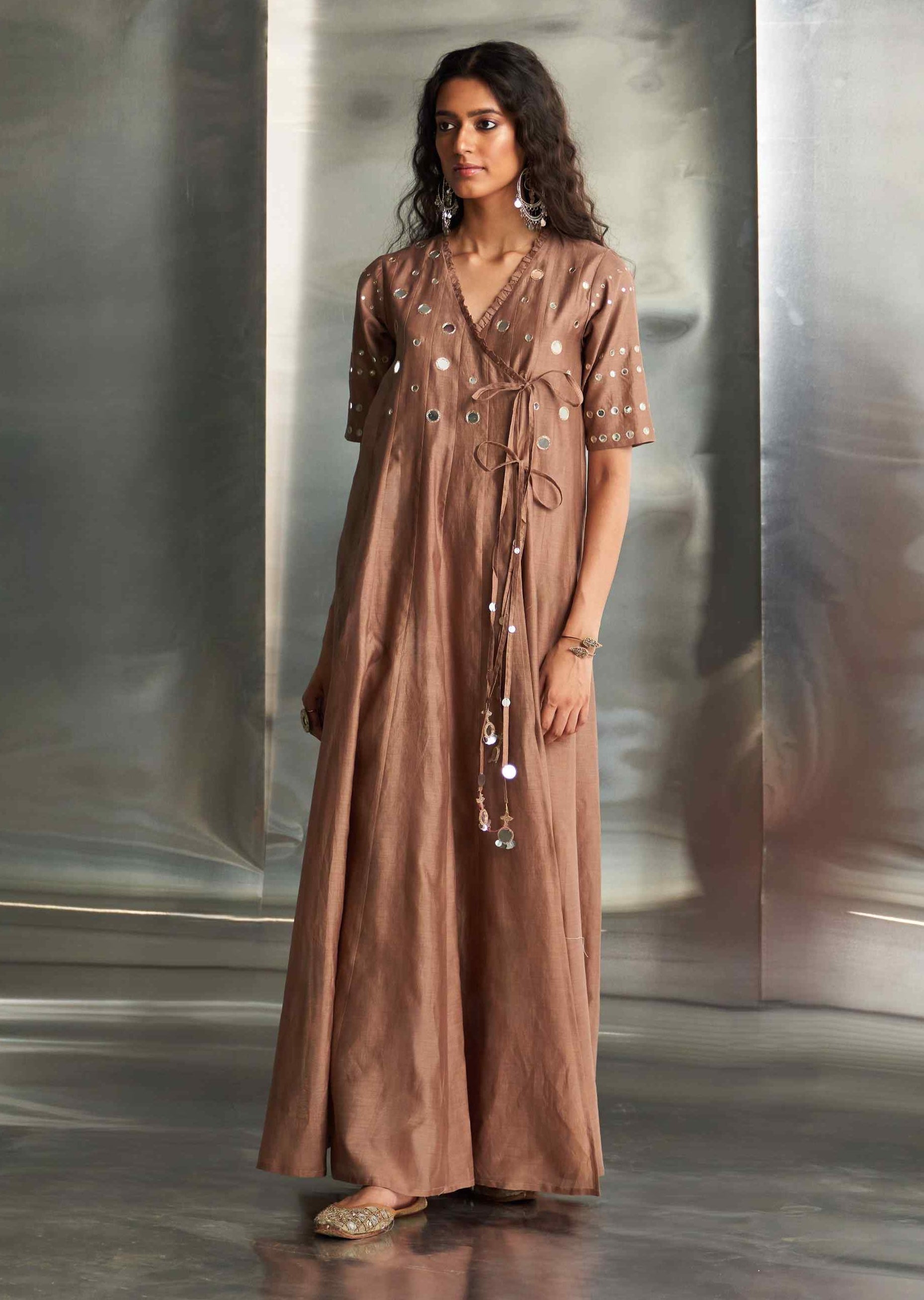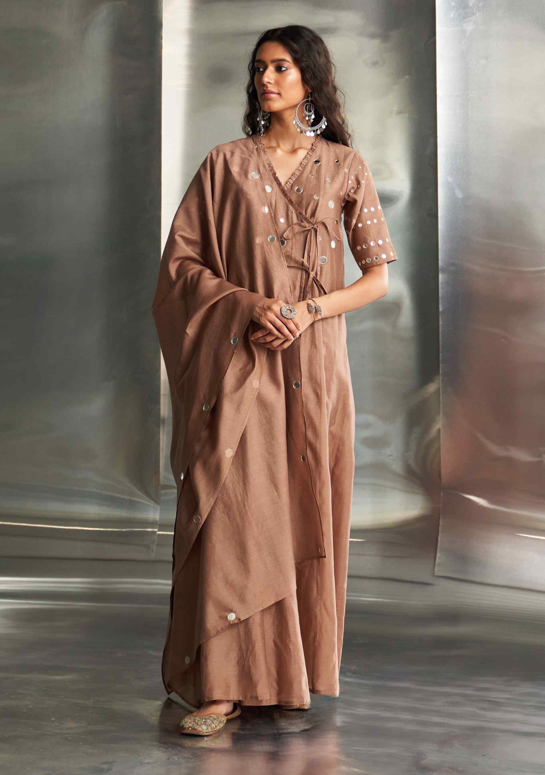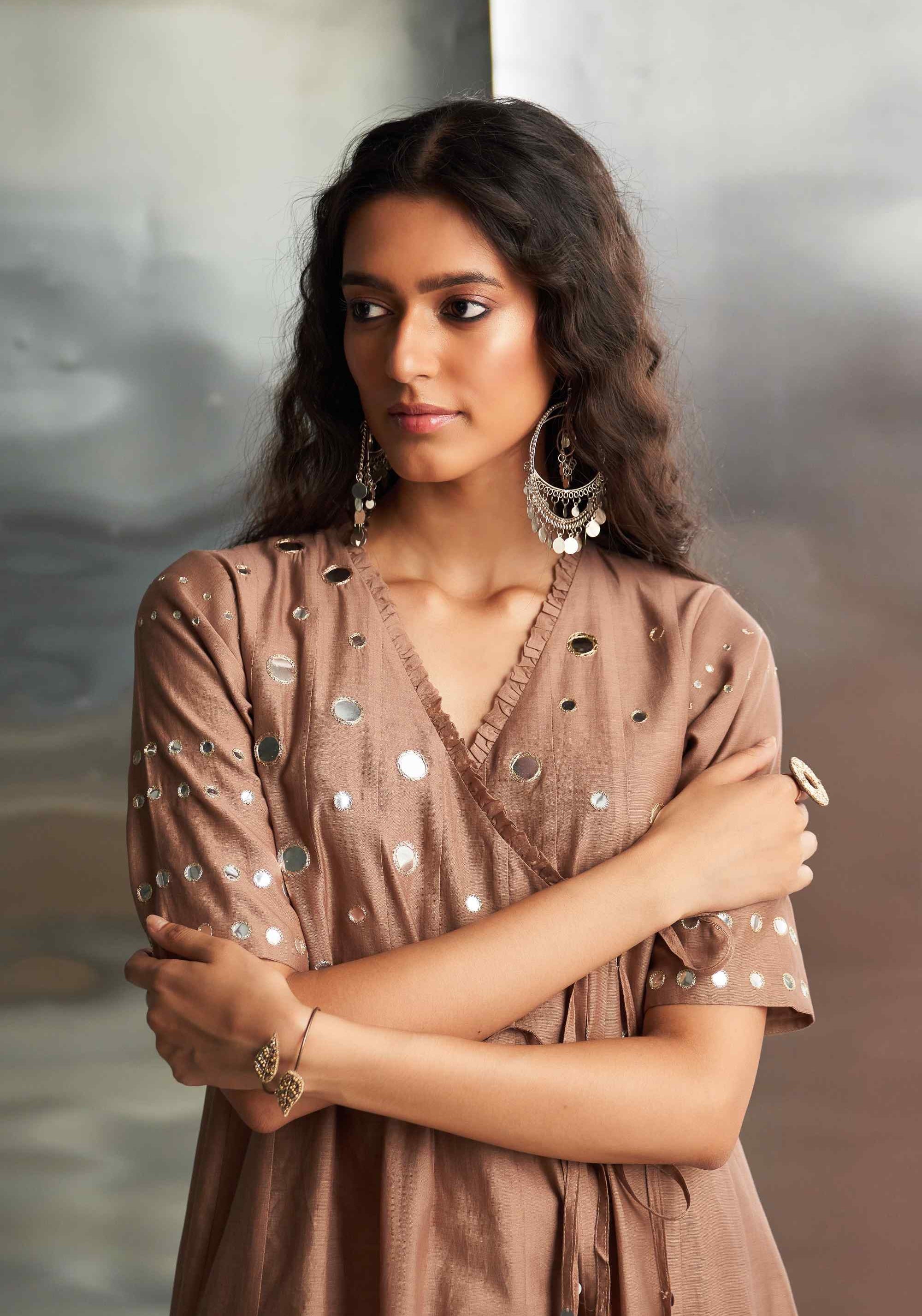 This vibrant ginger Chanderi angrakha wrap-around anarkali is adorned with intricate mirror work on the sleeves and delightful mirror tassels. It seamlessly blends traditional and modern styles, paired with chic joggers for a contemporary edge. The ensemble is completed with a Chanderi dupatta, elegantly embroidered with mirror work along the borders. The joggers feature an elasticated waistband with a drawstring for a comfortable and customizable fit.