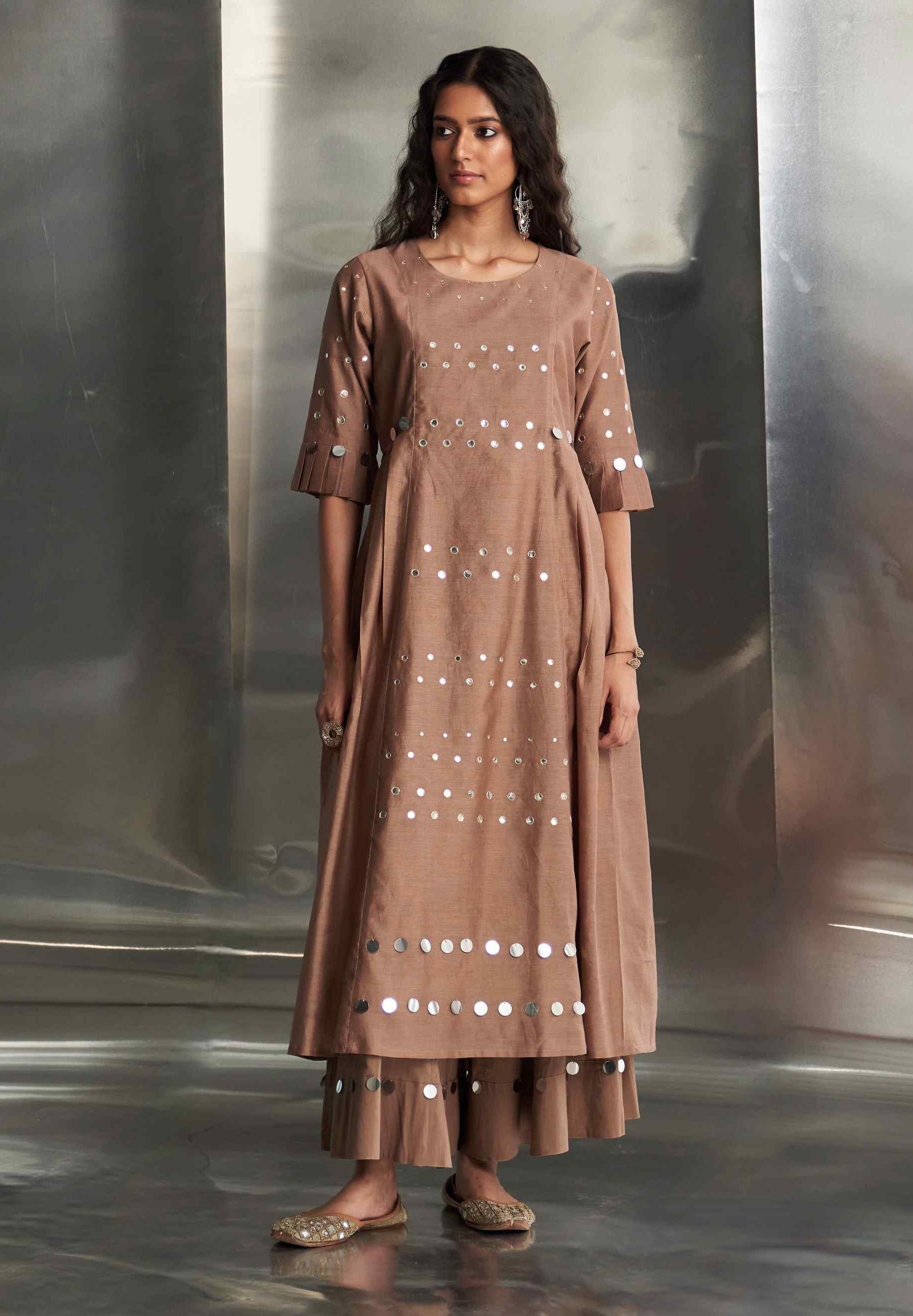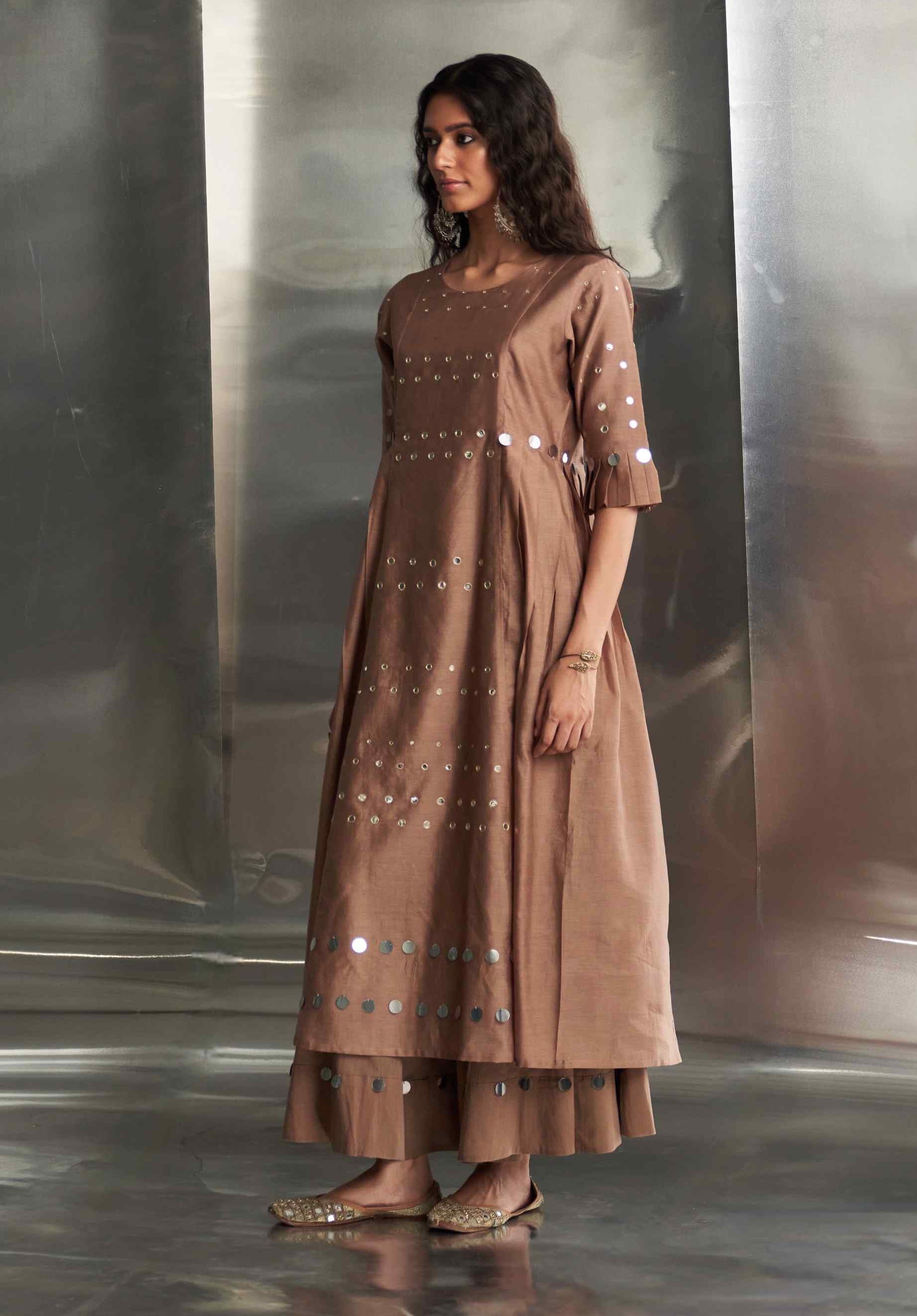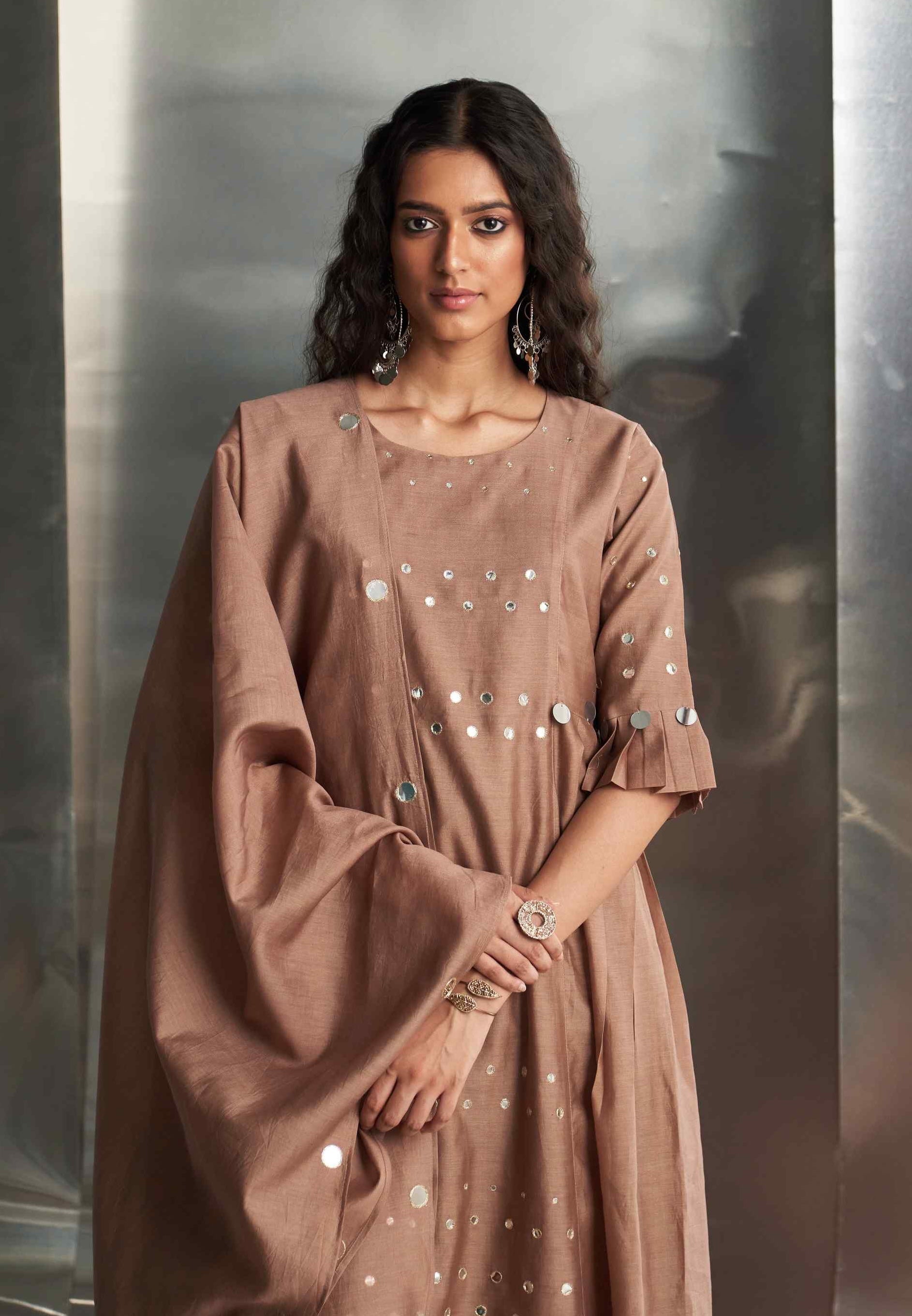 This elegant Chanderi kurta in a rich ginger hue features exquisite mirror work on the front panel and sleeves, adding a touch of glamour. The pleated sleeves offer a stylish flair, enhancing the kurta's sophisticated design. Paired with a Chanderi dupatta embroidered with mirror work along the borders, this ensemble exudes charm and refinement. The wide-flare cotton palazzos, adorned with matching mirror details, complete the look with coordinated style. These palazzos are elasticated and feature a drawstring for a comfortable and adjustable fit. Perfect for making a refined statement at any occasion.