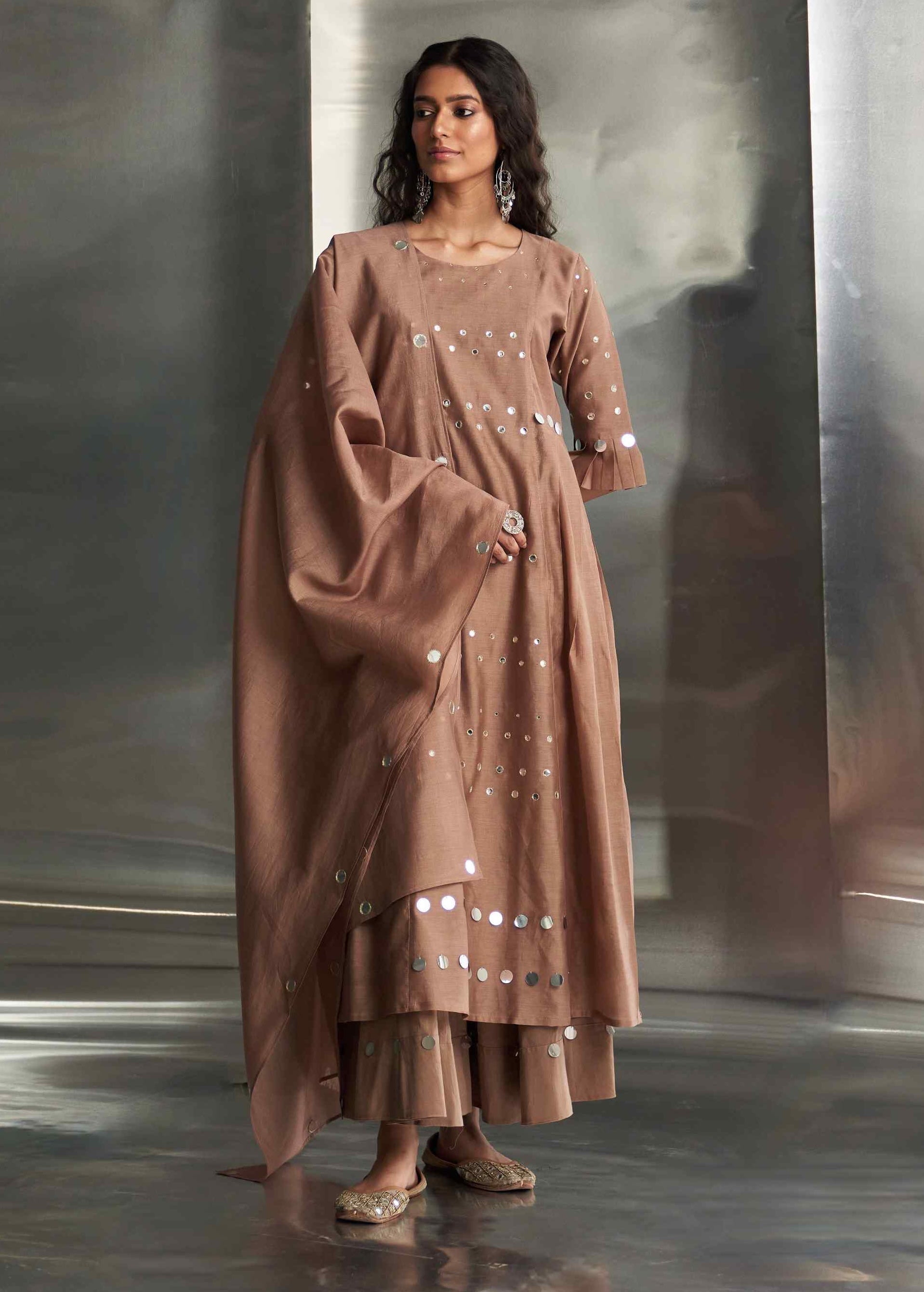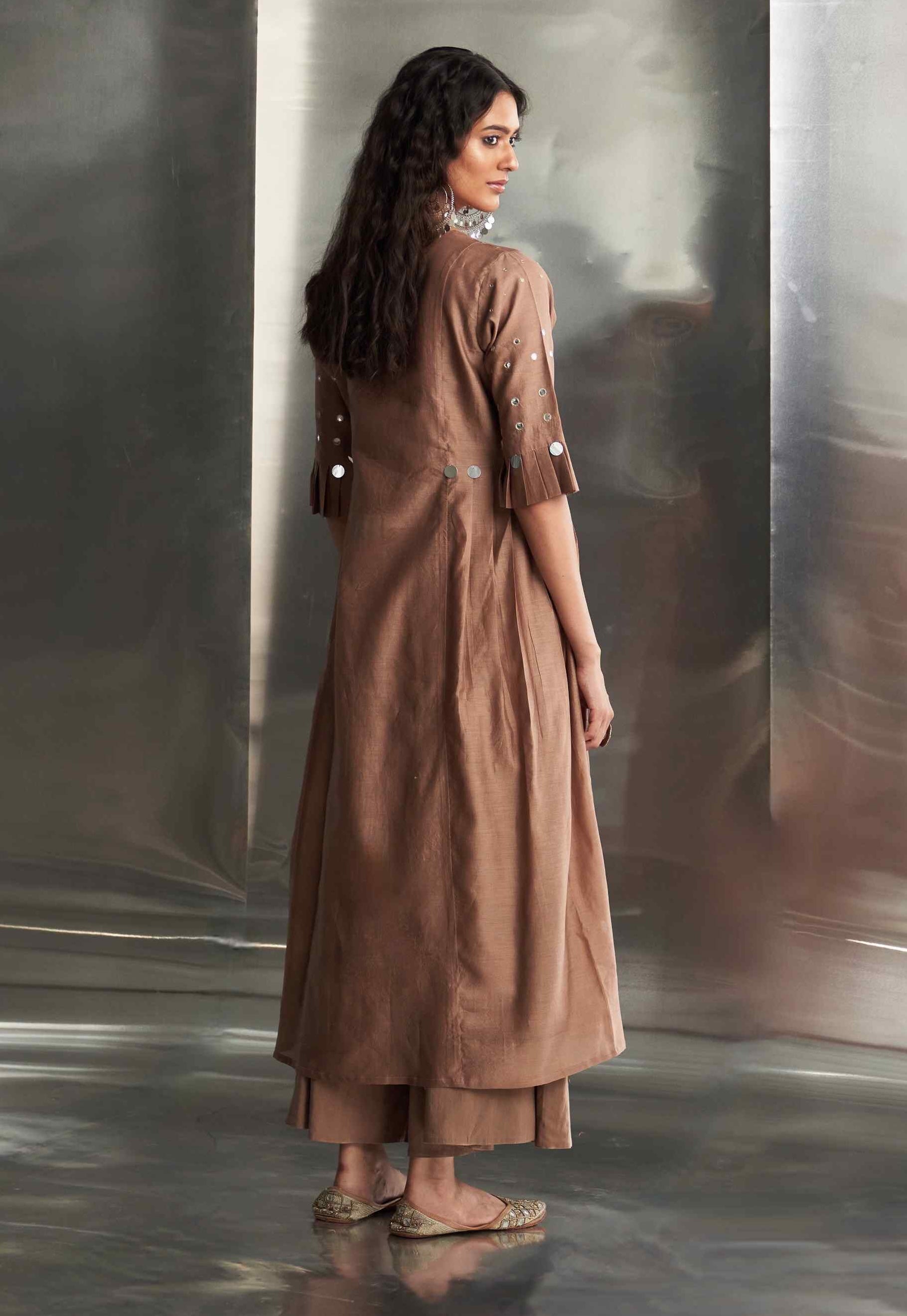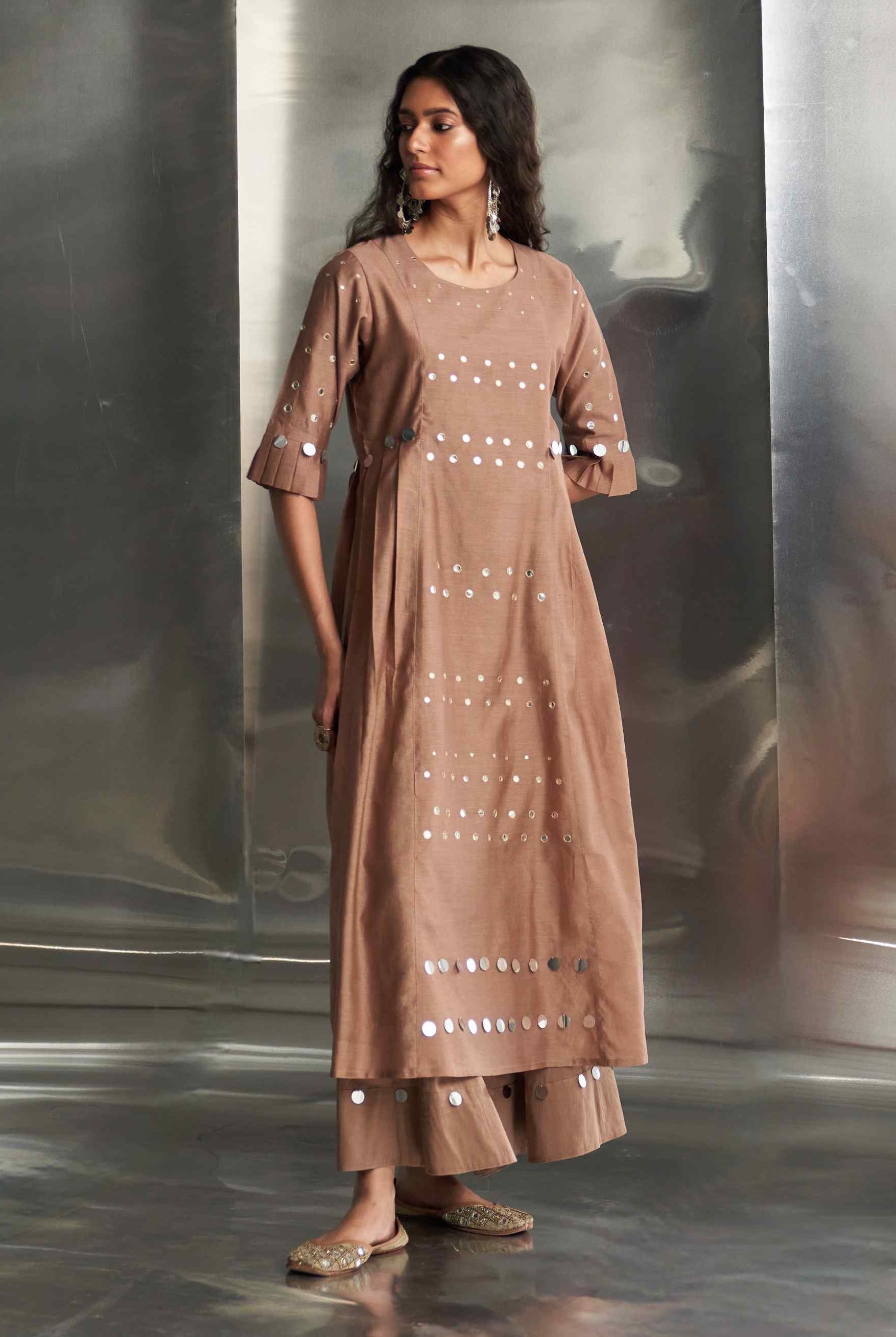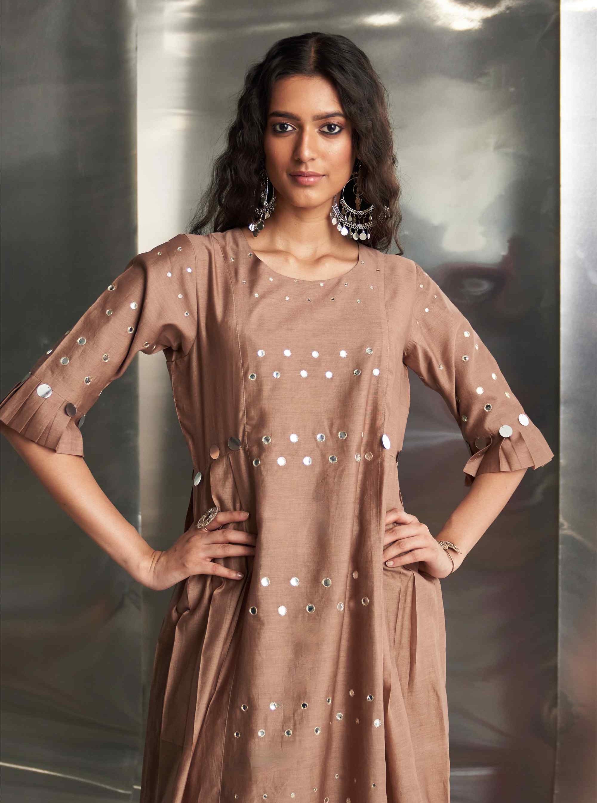 This elegant Chanderi kurta in a rich ginger hue features exquisite mirror work on the front panel and sleeves, adding a touch of glamour. The pleated sleeves offer a stylish flair, enhancing the kurta's sophisticated design. Paired with a Chanderi dupatta embroidered with mirror work along the borders, this ensemble exudes charm and refinement. The wide-flare cotton palazzos, adorned with matching mirror details, complete the look with coordinated style. These palazzos are elasticated and feature a drawstring for a comfortable and adjustable fit. Perfect for making a refined statement at any occasion.