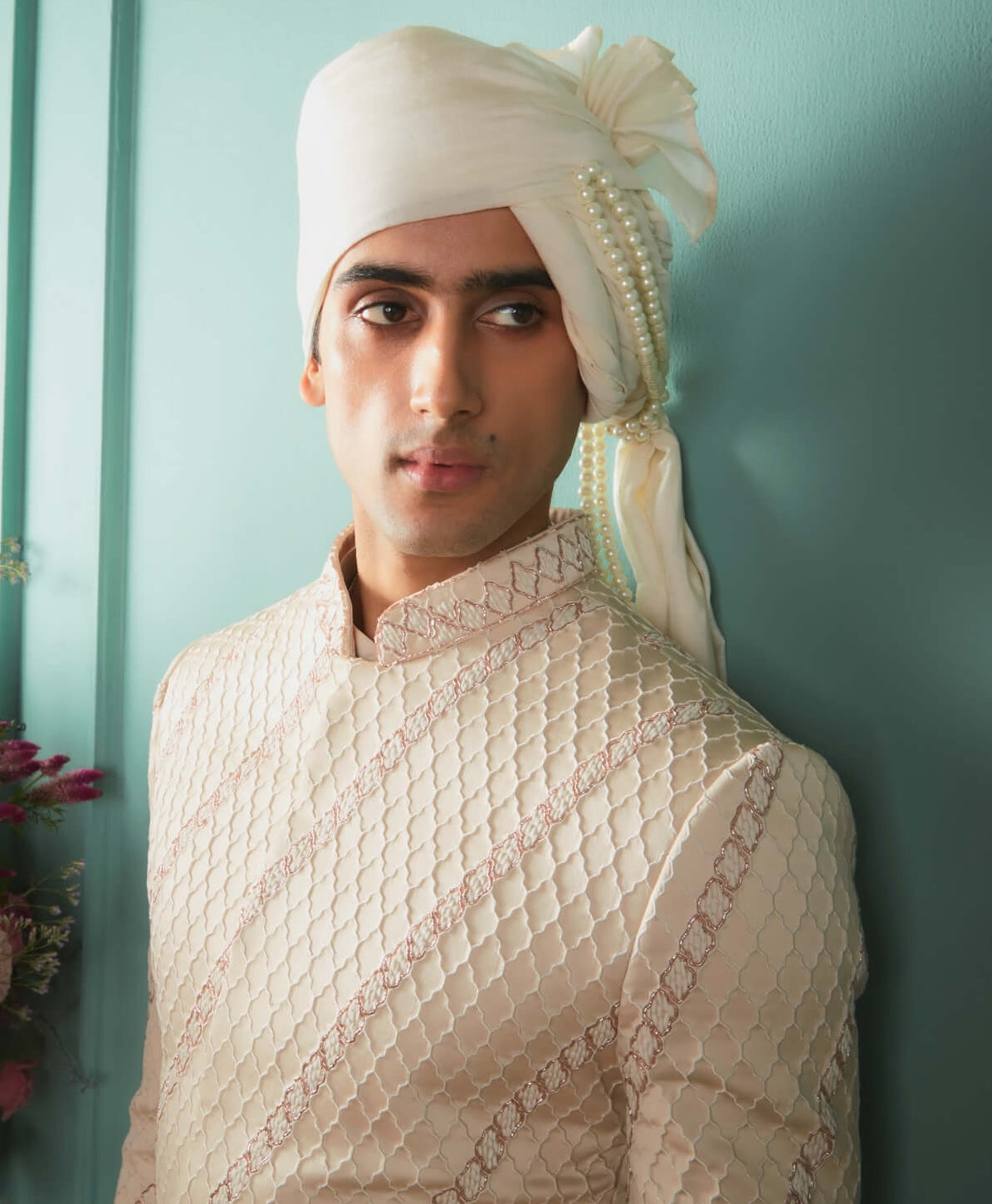 Fabric: Sherwani- textured fabric, kurta & pant- chanderi