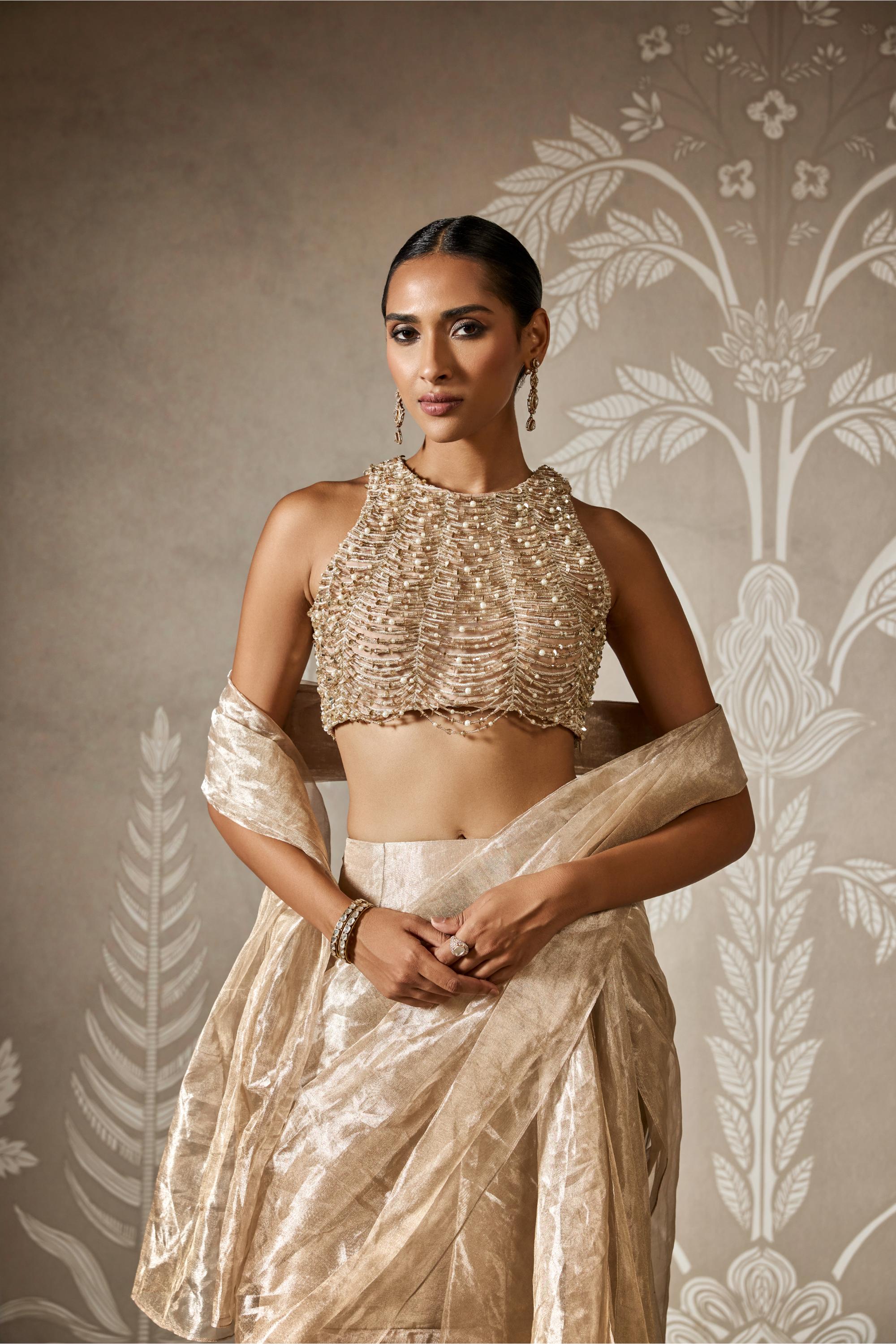 Ethereal and radiant, the Gold Amara Zar Bano Saree Set embodies the essence of timeless celebration. Crafted in a luminous gold tone with delicate embellishments, the saree drapes effortlessly to create a silhouette that is both regal and refined. Paired with a beautifully structured blouse, this set is perfect for weddings, festive galas, and memorable occasions. A statement in elegance for the woman who carries tradition with effortless grace.