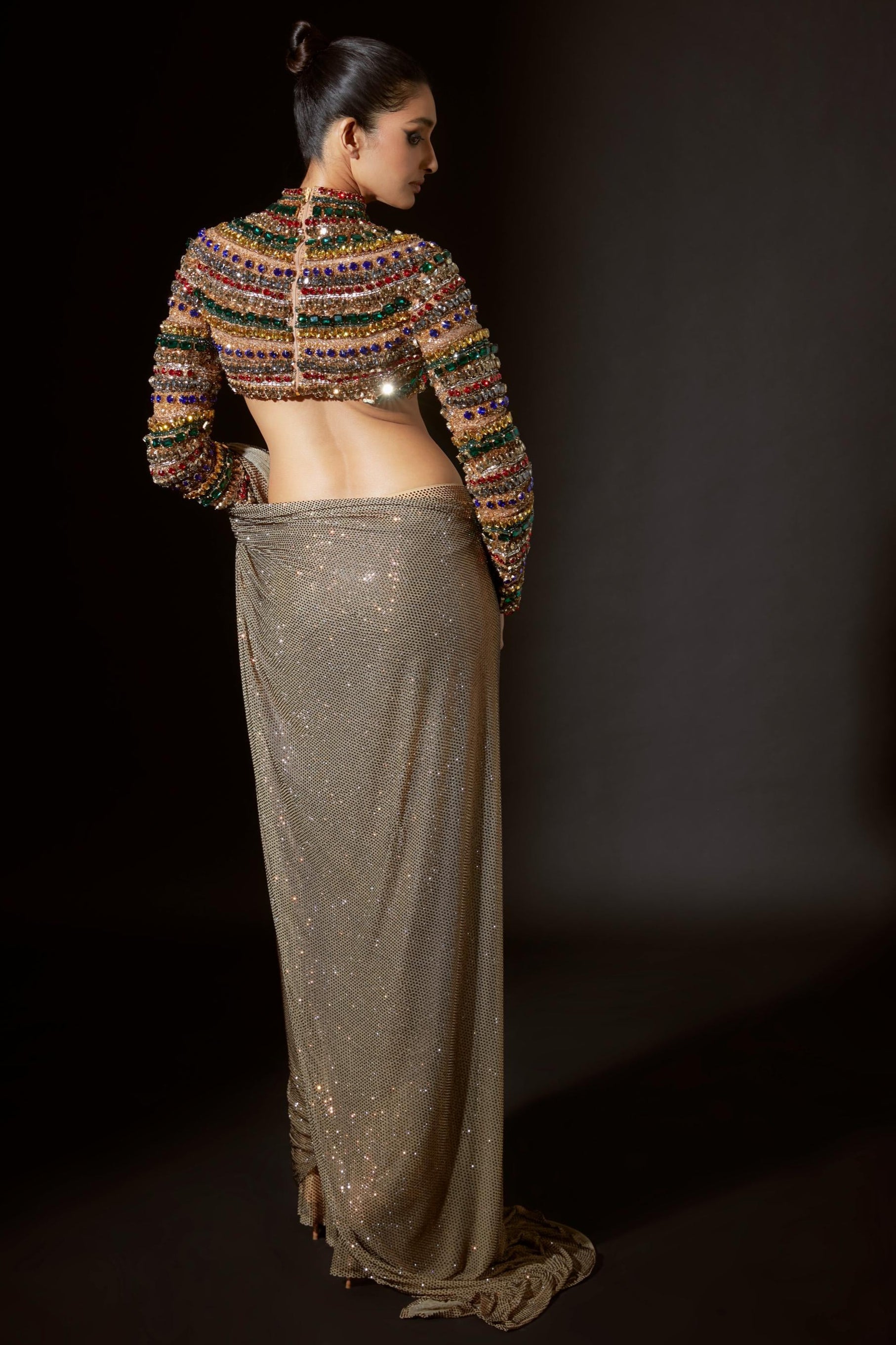 The vibrant multicolored jewel top adorned with dazzling large crystals exudes glamour and allure capturing attention with its captivating sparkle. It is elegantly paired with a dusky gold embellished pre-stitched saree creating a stunning contrast of rich hues and intricate detailing. This ensemble offers a perfect blend of modern luxury and timeless tradition ideal for special occasions.