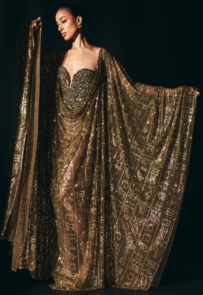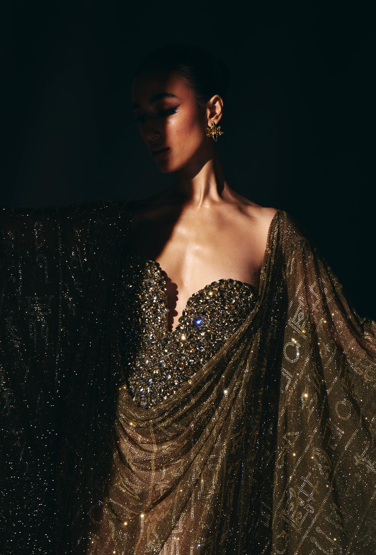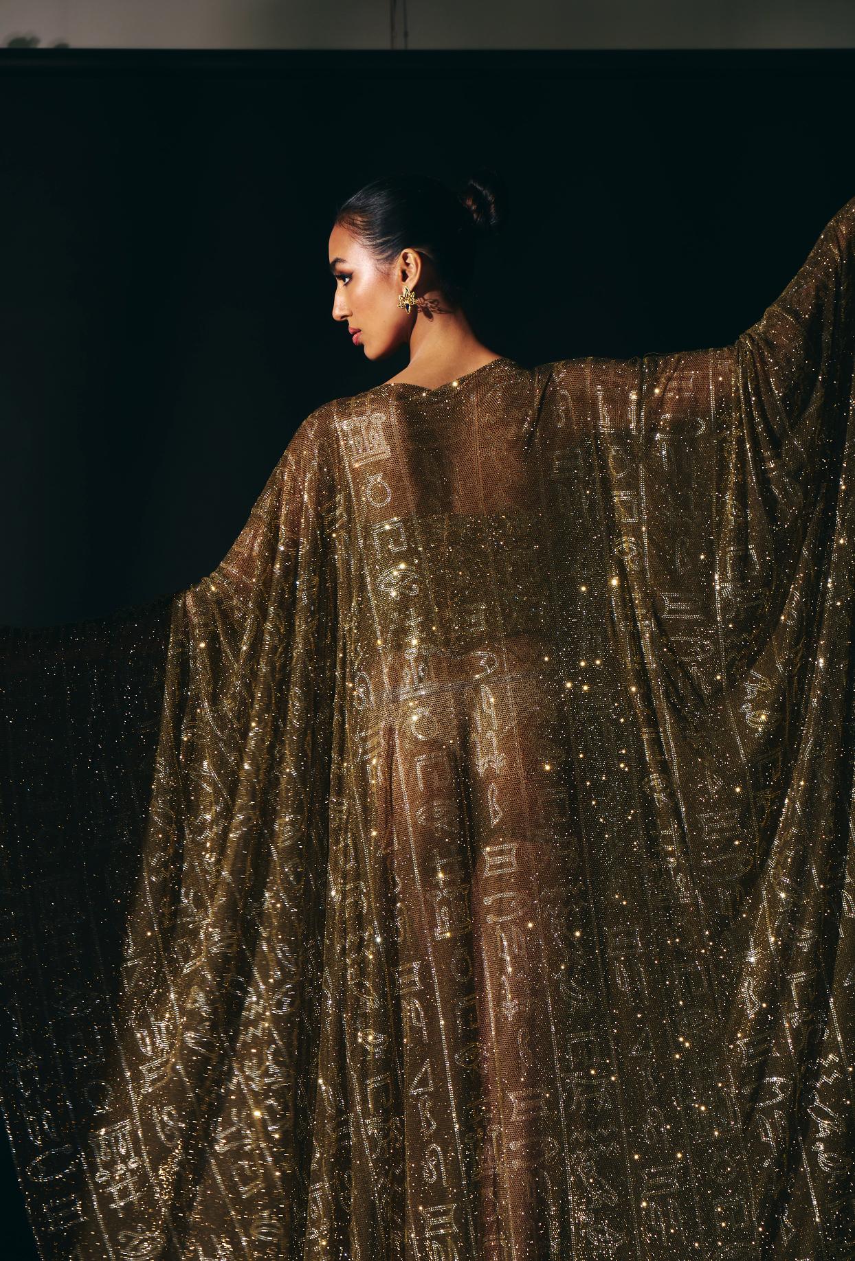 This stunning kaftan features intricate hieroglyphic crystal embellishments, adding a touch of ancient luxury. Paired with a gold jewel corset adorned with dazzling large crystals, it radiates glamour and allure, capturing attention with its captivating sparkle. The combination of the kaftan's flowing elegance and the corset's bold, shimmering details creates a striking, opulent look perfect for any special occasion.