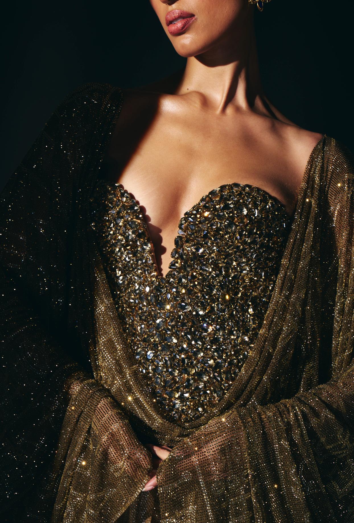 This stunning kaftan features intricate hieroglyphic crystal embellishments adding a touch of ancient luxury. Paired with a gold jewel corset adorned with dazzling large crystals it radiates glamour and allure capturing attention with its captivating sparkle. The combination of the kaftan's flowing elegance and the corset's bold shimmering details creates a striking opulent look perfect for any special occasion.