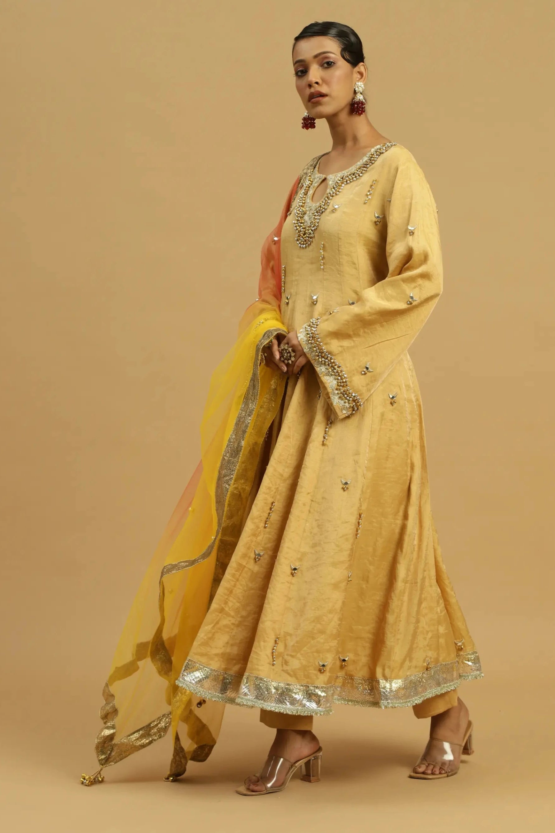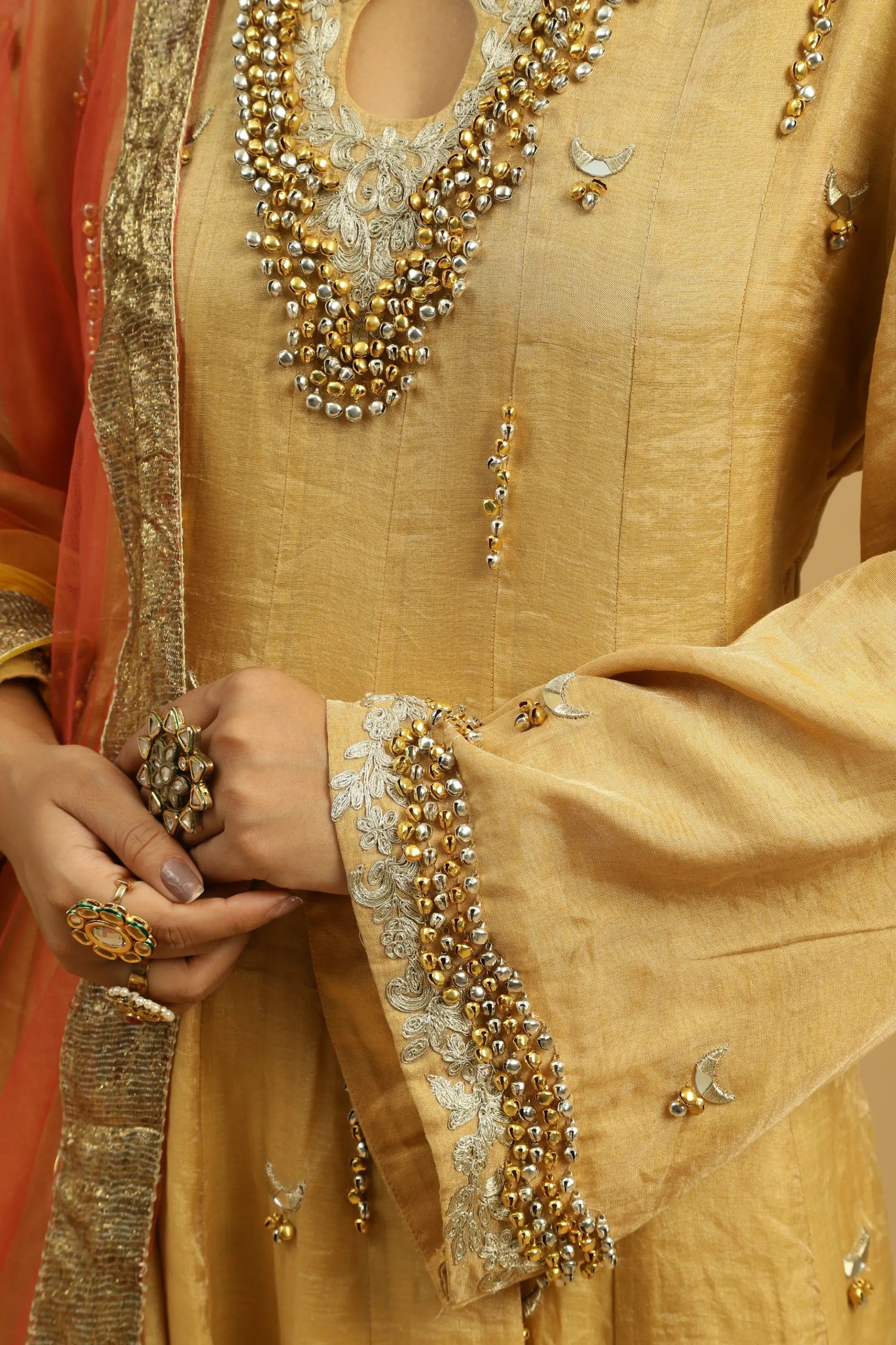 This stunning gold anarkali suit exudes opulence and grace, perfect for special occasions. Crafted from rich metallic fabric, the anarkali silhouette creates a flattering flow, while the straight pants provide a modern and sleek finish. The accompanying dupatta adds an extra touch of sophistication, beautifully complementing the ensemble. Whether you're attending a wedding, reception, or festive celebration, this gold anarkali suit promises to make you the center of attention. Its intricate design and luxurious fabric make it a timeless addition to any wardrobe, blending traditional charm with contemporary style.
