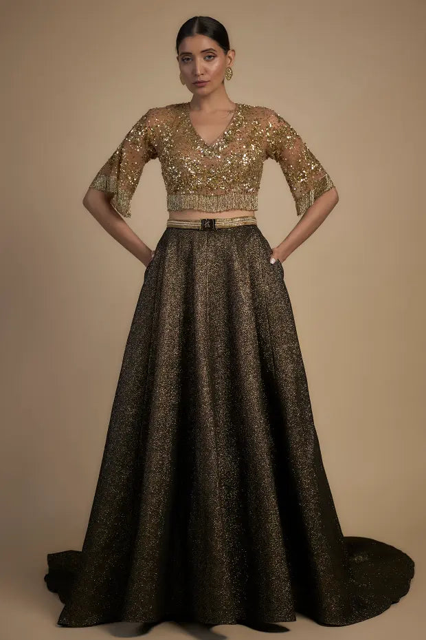 Step into the spotlight with the Gold and Black Sequin Blouse with Lehenga an exquisite blend of bold glamour and refined elegance. This stunning ensemble features a black blouse adorned with dazzling gold sequins creating a luxurious contrast that captures attention with its intricate detailing and shimmering appeal. Paired with a flowing lehenga this outfit is perfect for weddings receptions or festive occasions promising an unforgettable look.