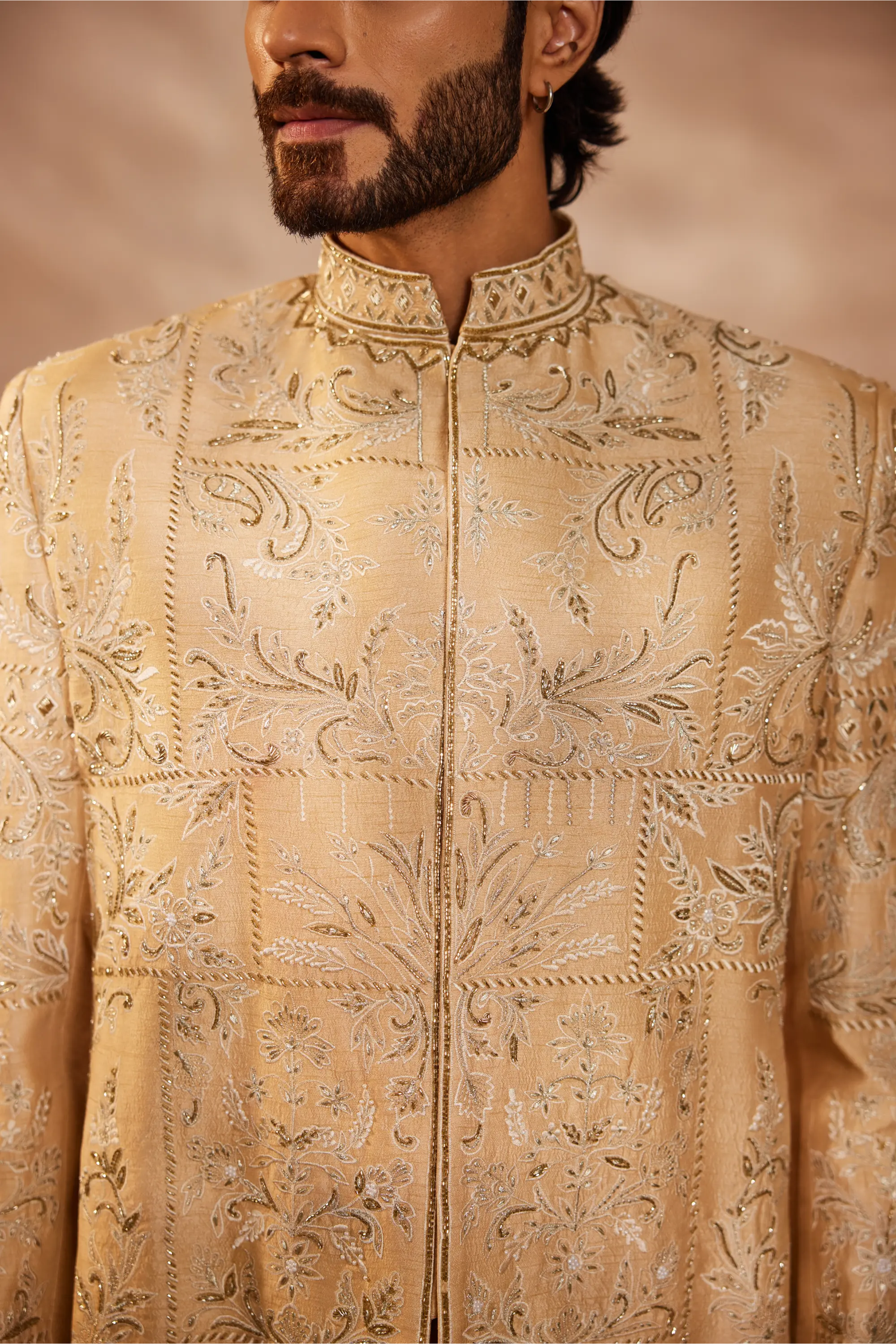 The "Agniv" Bandhgala in rich gold dupion silk features intricate floral motifs, elegantly crafted with thread work and glass bead embroidery. This luxurious jacket offers a perfect blend of traditional artistry and modern sophistication, making it a standout choice for any special occasion.