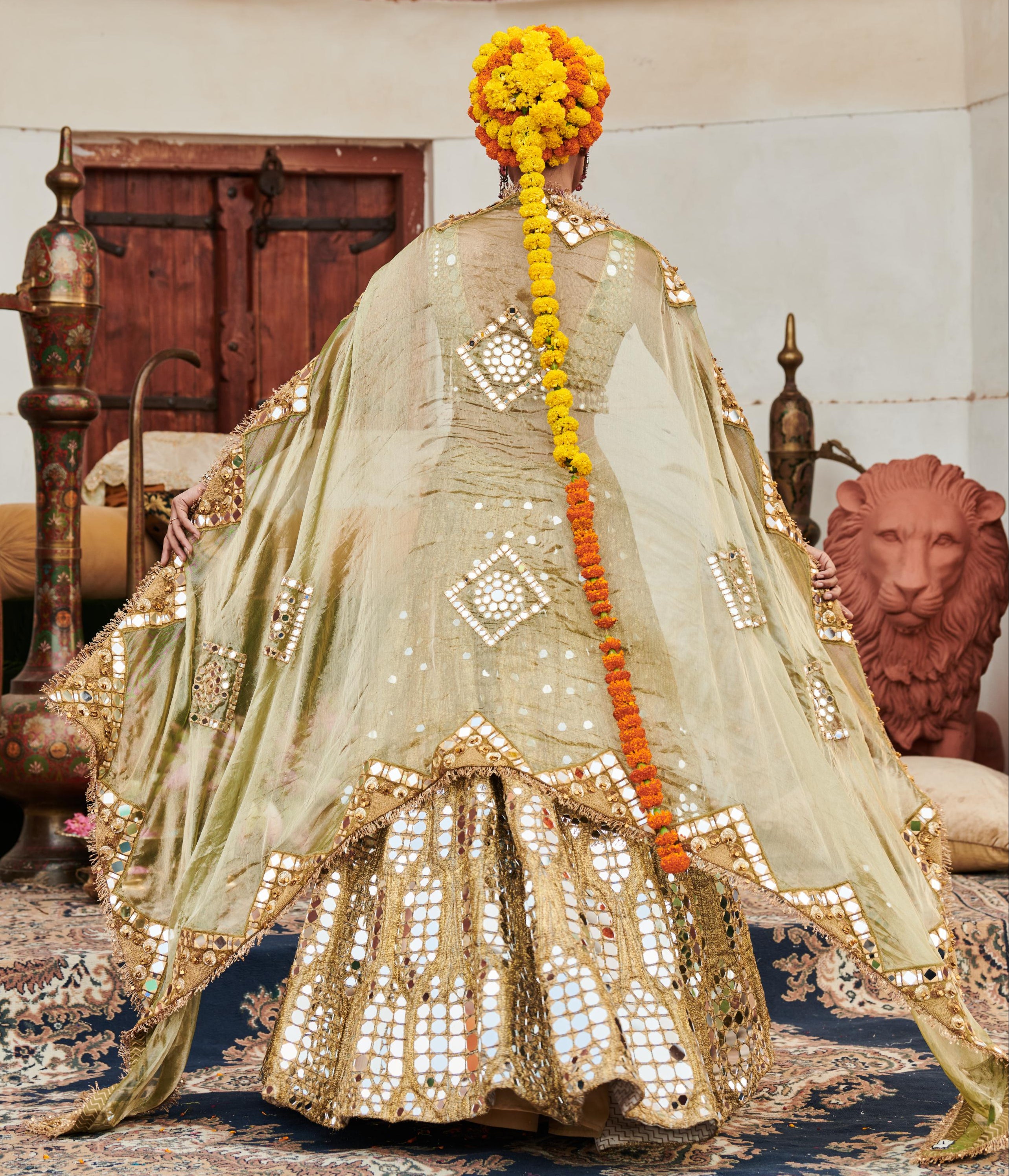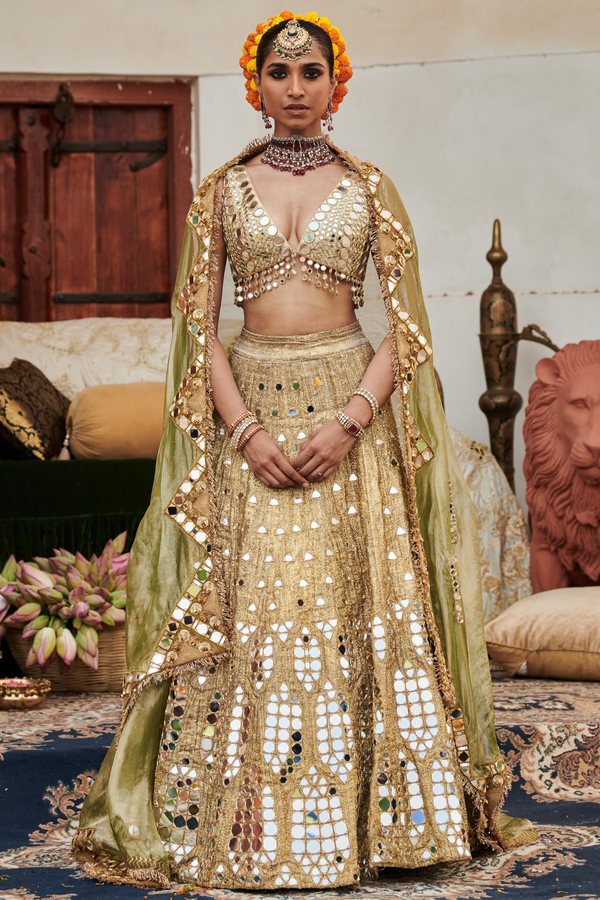 This golden chanderi lehenga is adorned with intricately placed mirrors paired with a mirror work blouse on gota lined with luxurious chanderi silk. Complemented by a delicate tissue dupatta featuring fine kiran detailing this ensemble exudes regal elegance perfect for weddings and festive occasions.
