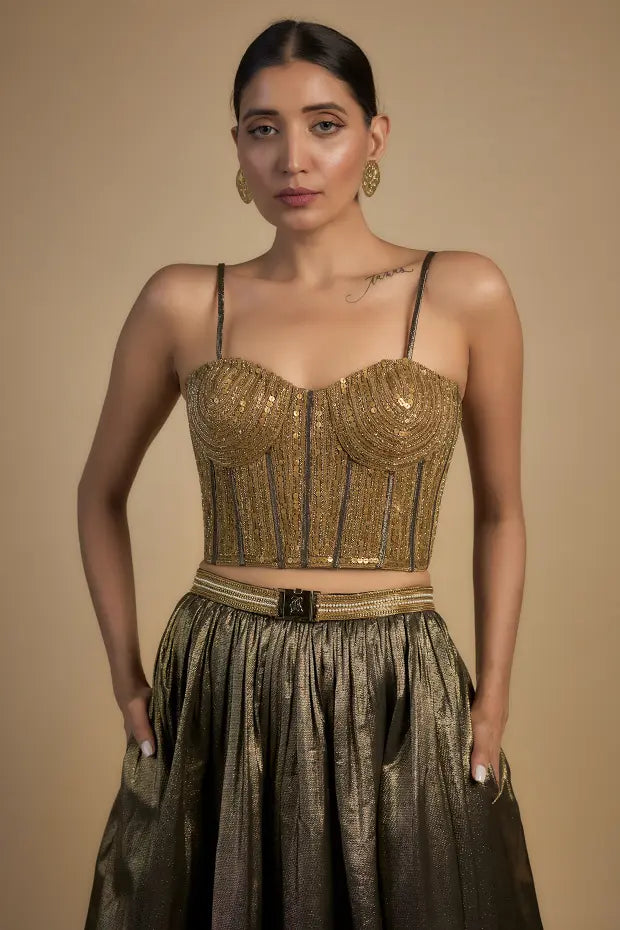 Indulge in a look of sheer opulence with the Gold Corset Blouse and Lehenga a breathtaking ensemble that blends the structure of a corset with the flowing beauty of a lehenga. This outfit combines contemporary design elements with traditional craftsmanship making it perfect for weddings receptions or any special occasion where you want to radiate confidence and sophistication.