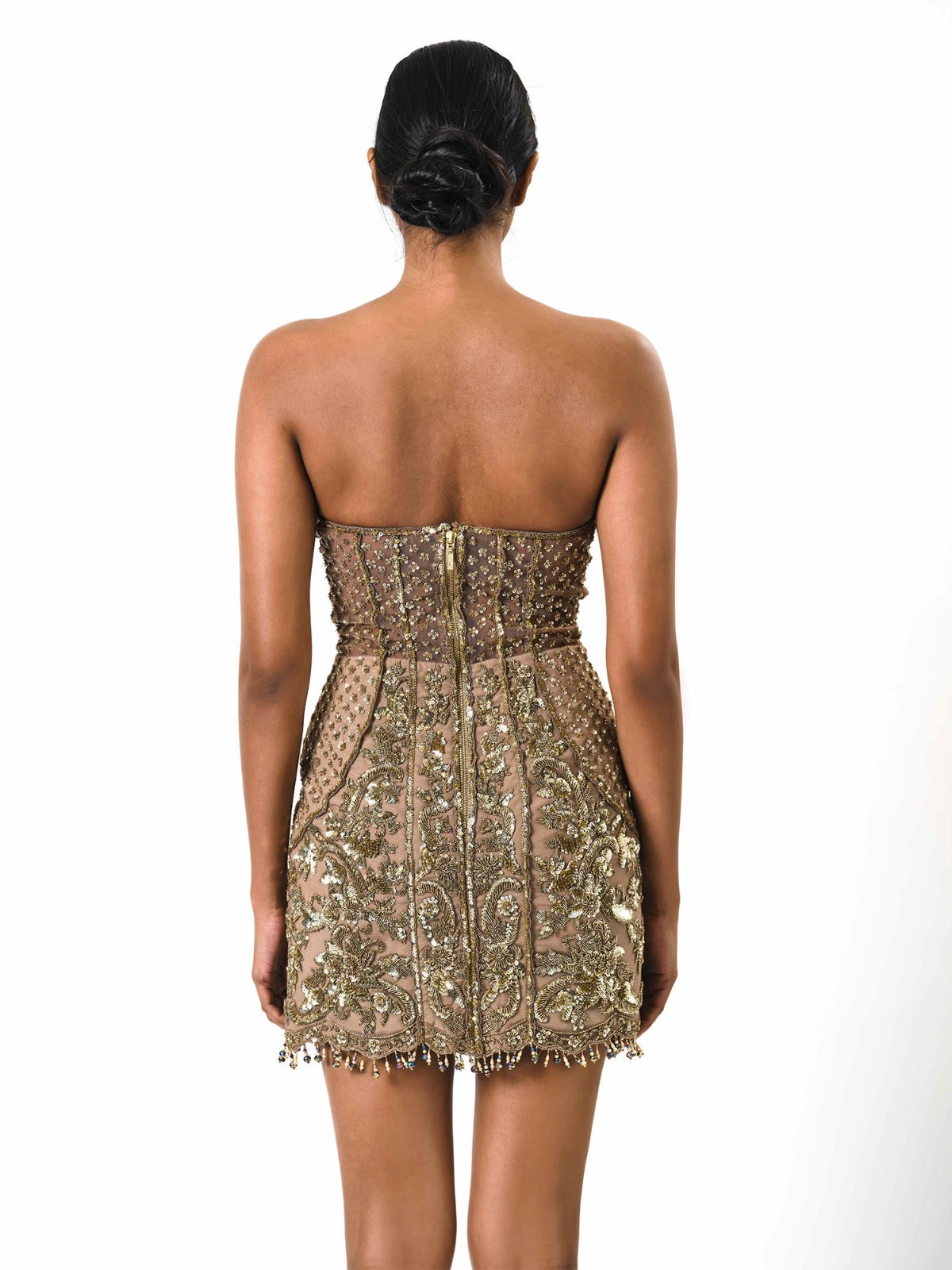 This captivating short dress features a sweetheart neckline and a corset fit, enhancing its flattering silhouette. The sheer bodice adds a touch of allure, while the entire dress is intricately embroidered with exquisite antique designs. Perfect for making a sophisticated statement, this dress seamlessly blends classic elegance with timeless craftsmanship.