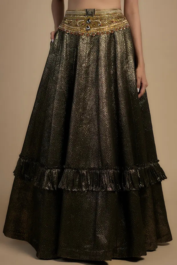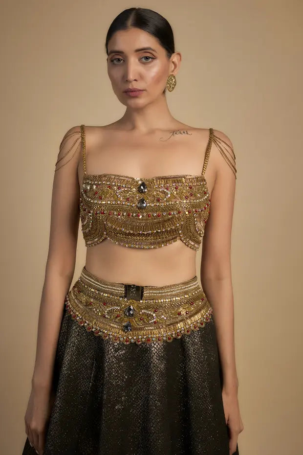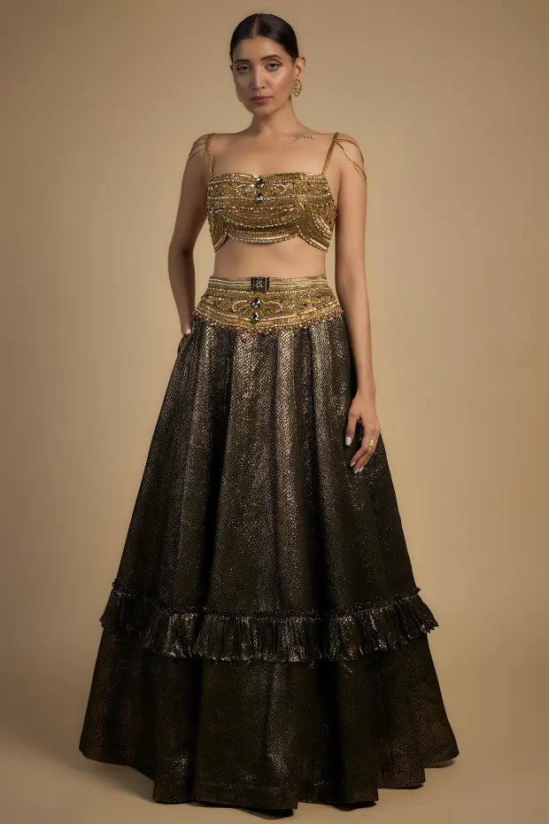 Step into the spotlight with the Gold Embroidered with Moti and Chain Blouse with Lehenga a mesmerizing ensemble that effortlessly combines intricate embroidery shimmering moti (pearls) and modern chain detailing. This stunning outfit features a beautifully embroidered gold blouse adorned with delicate moti work and chain accents paired with a complementing lehenga that enhances the overall opulence. Perfect for weddings receptions and festive occasions this lehenga set is designed to make a bold and timeless statement.