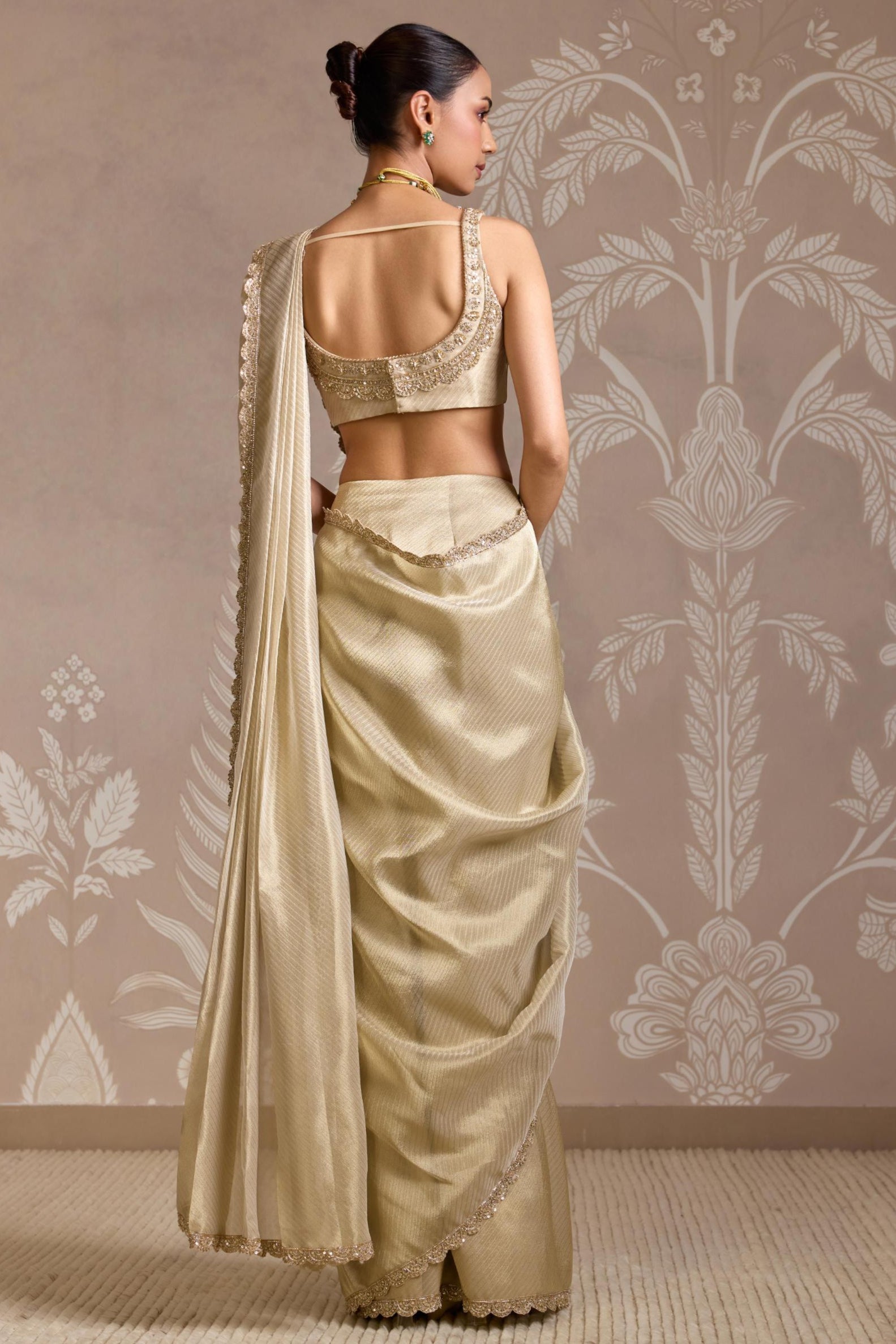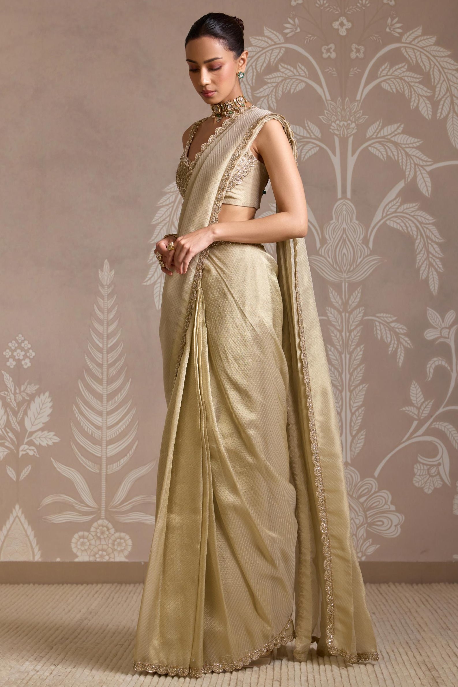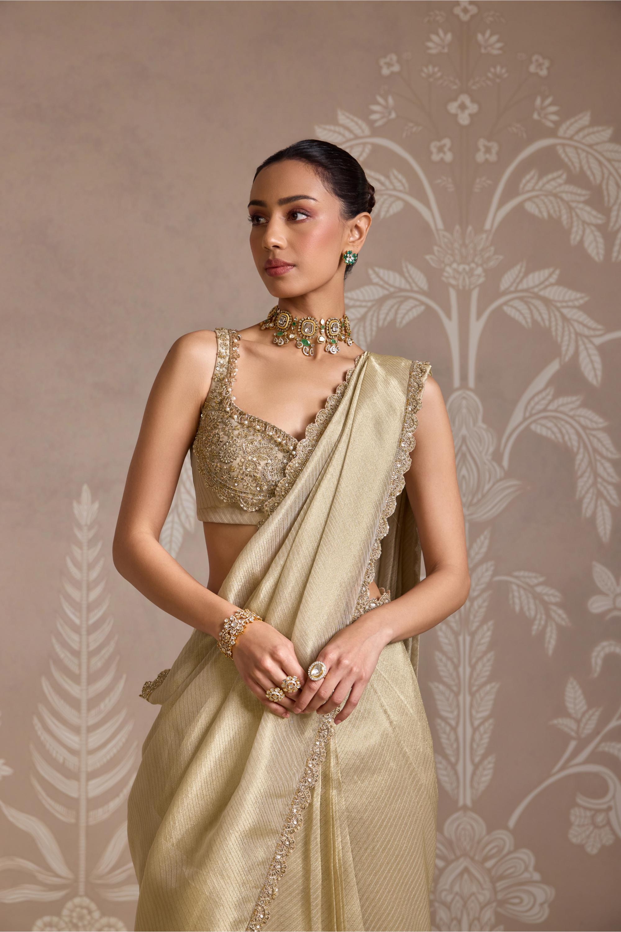 The Gold Folds Saree Set is a radiant blend of modern draping and traditional elegance. Crafted in a shimmering gold hue with structured pleats and a contemporary silhouette, this saree set is designed to make a statement. Ideal for weddings, cocktail parties, or festive celebrations, it combines ease of wear with standout style. A perfect choice for those who love bold glamour with a refined, fashion-forward twist.
